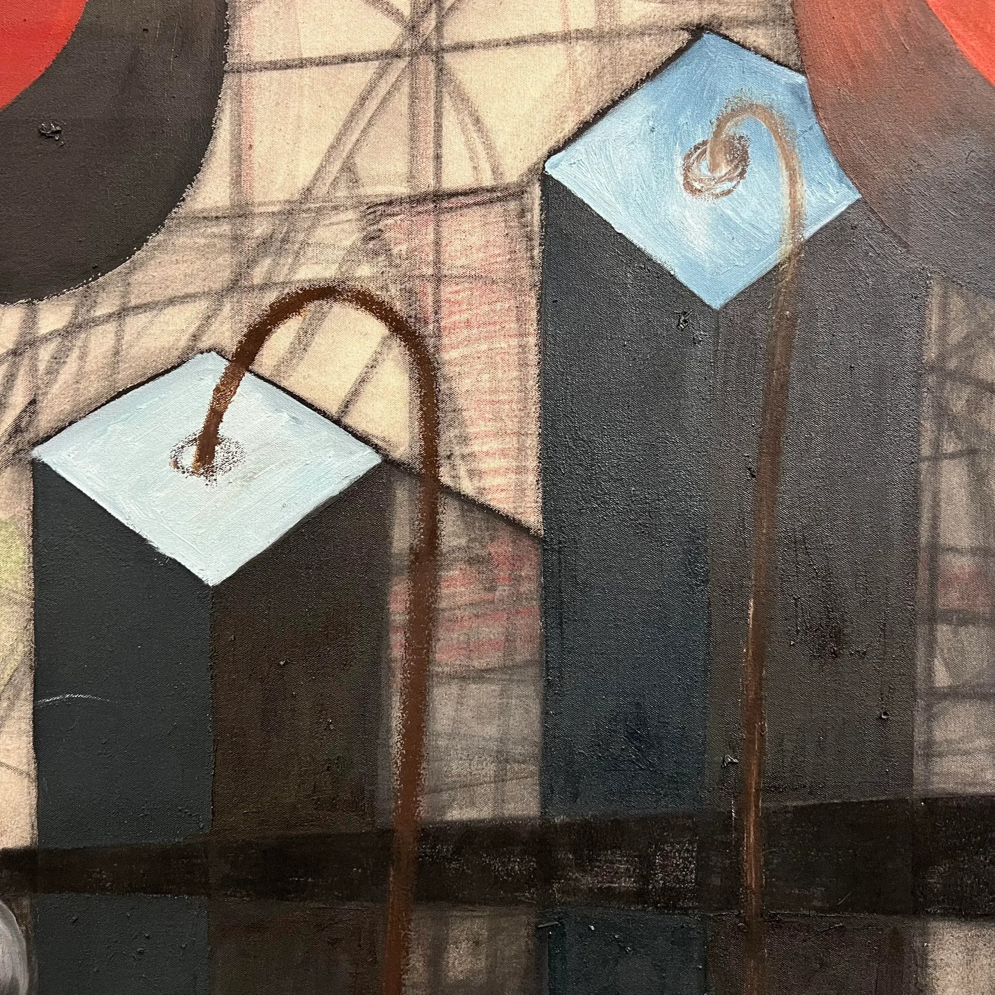 This painting is very large and the canvas is stretched over a wooden frame. It features bold and dramatic imagery with colors of red, black, brown, and blue. There is a mix of mediums of charcoal and paints. The artist and date are unknown.