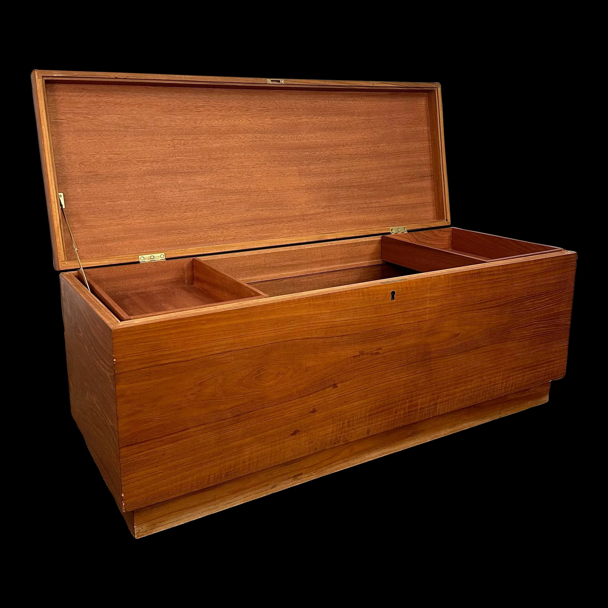 Mid century modern Riis Antonsen Danish Teak Chest Trunk. This trunk features a teak wood finish that opens on the top. The inside features two trays that are removable. Twice piece also comes with a key.