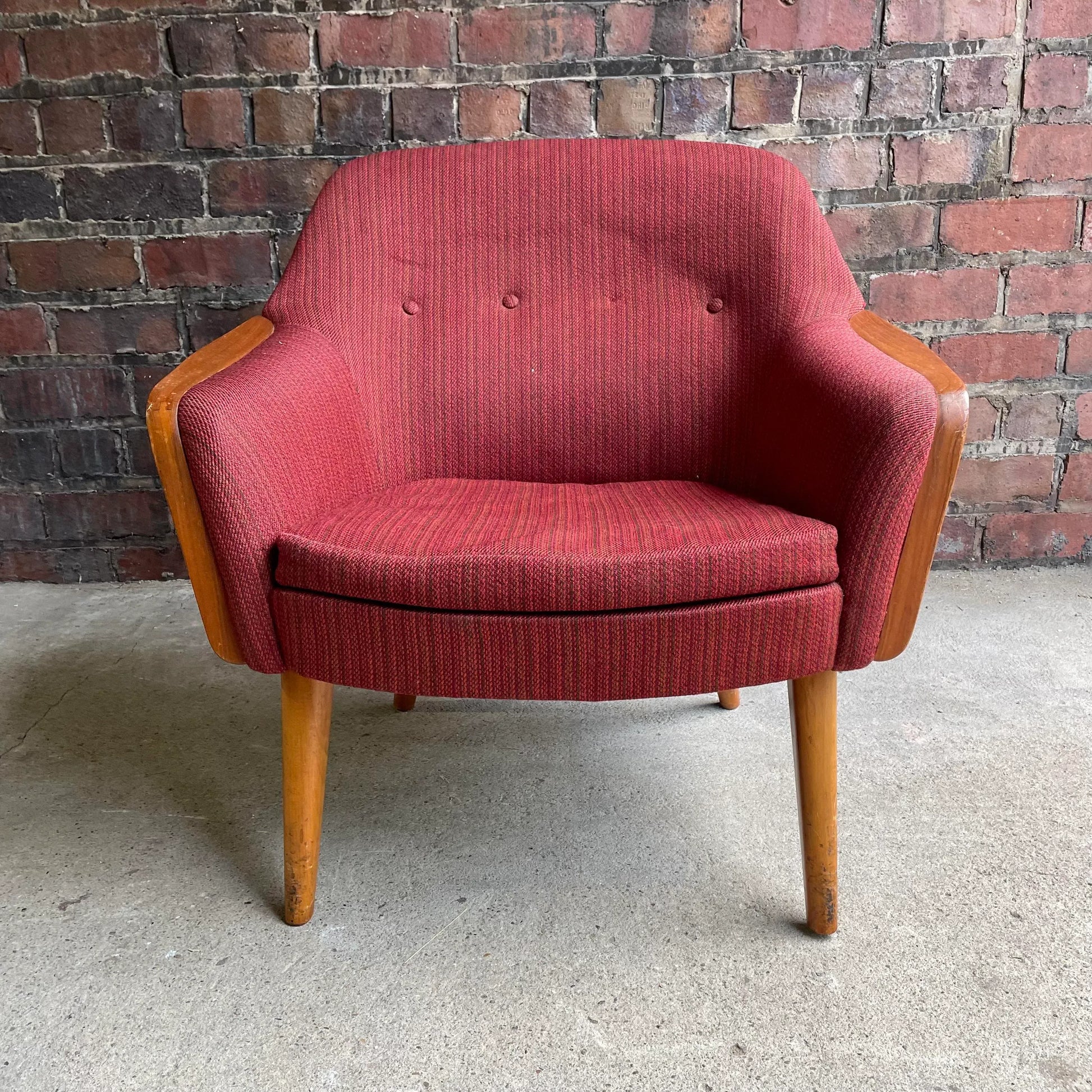Mid-Century Modern Norwegian Arm Chair with Beechwood Legs and Teak Arms. This chair features Amazing MCM Lines. We are unsure of the Designer but the chair is marked Norway on the bottom side of the chair.