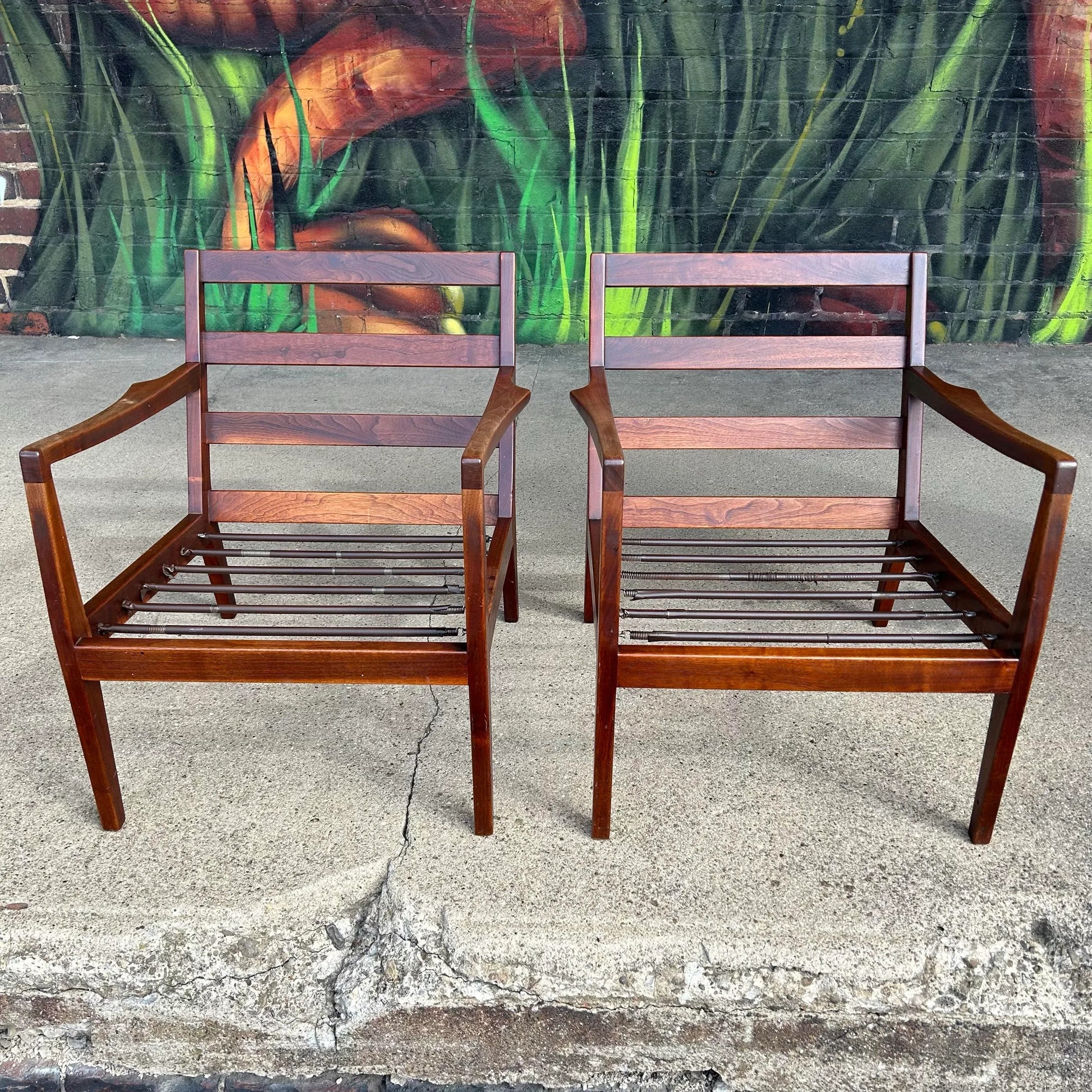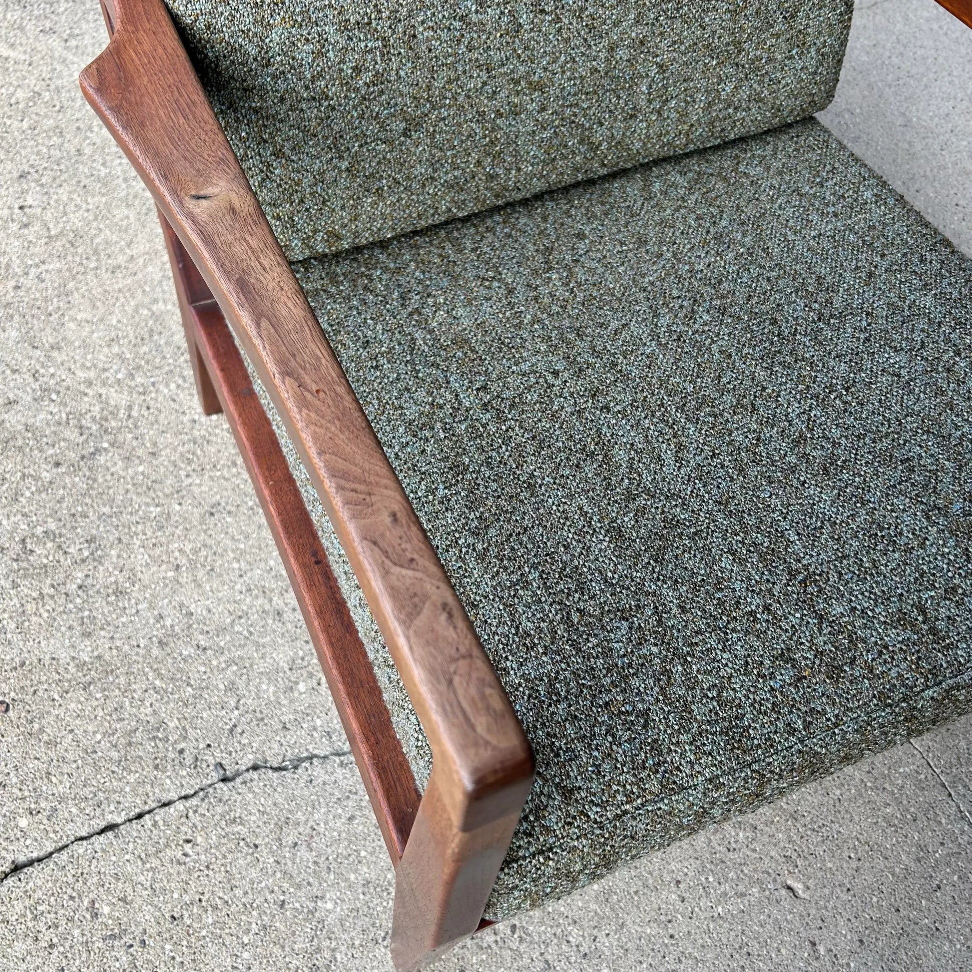 Mid century modern studio furniture solid walnut Pair of Arden Riddle Studio lounge Chairs. This is the model S511 armchair from the studio furniture maker Arden Riddle. Mr. Riddle crafted each piece out of his Ohio workshop from black walnut wood he sourced from his familys farm in West Virginia. This is a wonderful mid century modern design similar to Jens Risom. The chairs have been reupholstered in a nubby green and brown fabric, very similar to a fabric Mr. Riddle choose for his original pieces. This piece does not have a stamp on it but this isn’t uncommon for his pieces. We believe these chairs were produced in the late 1950s.