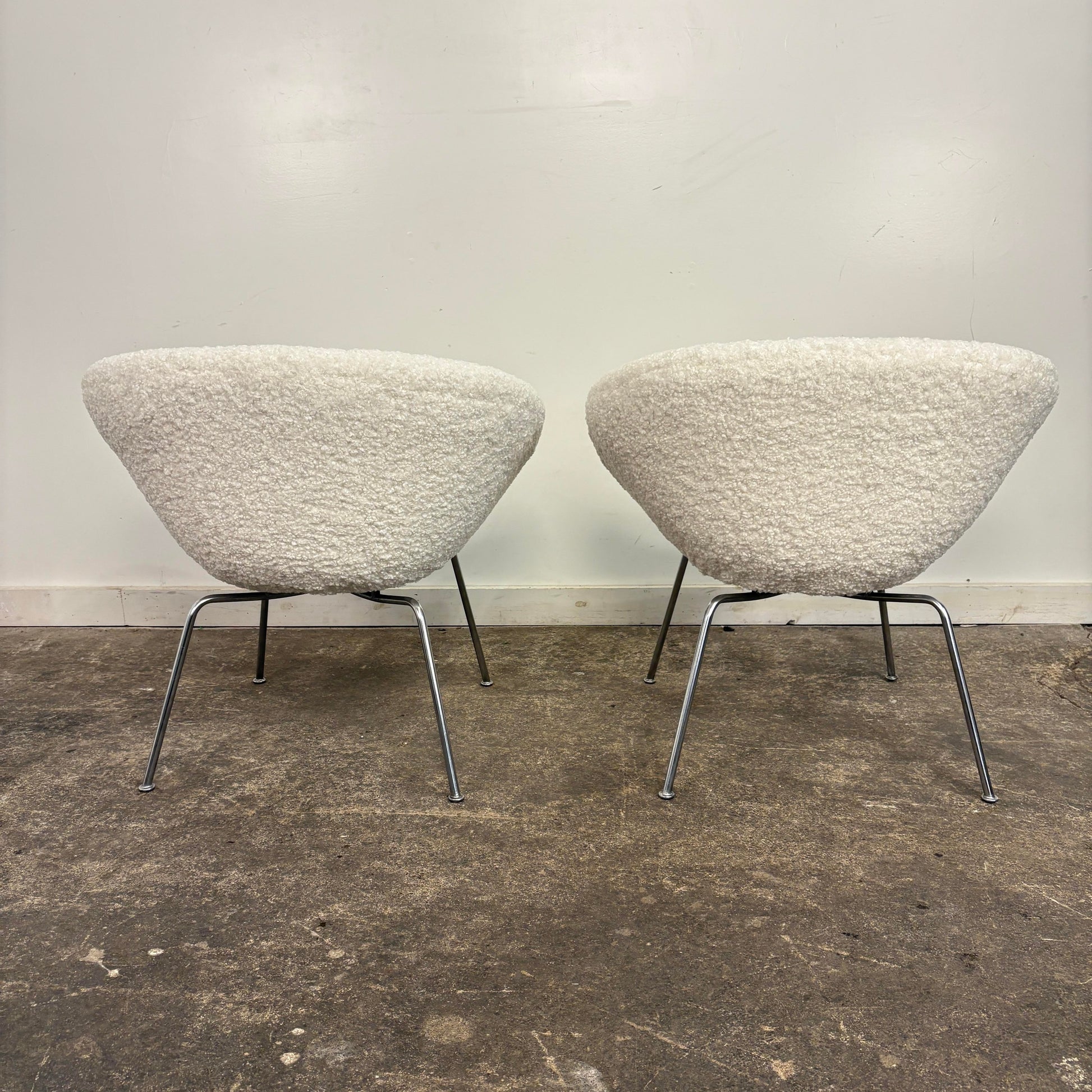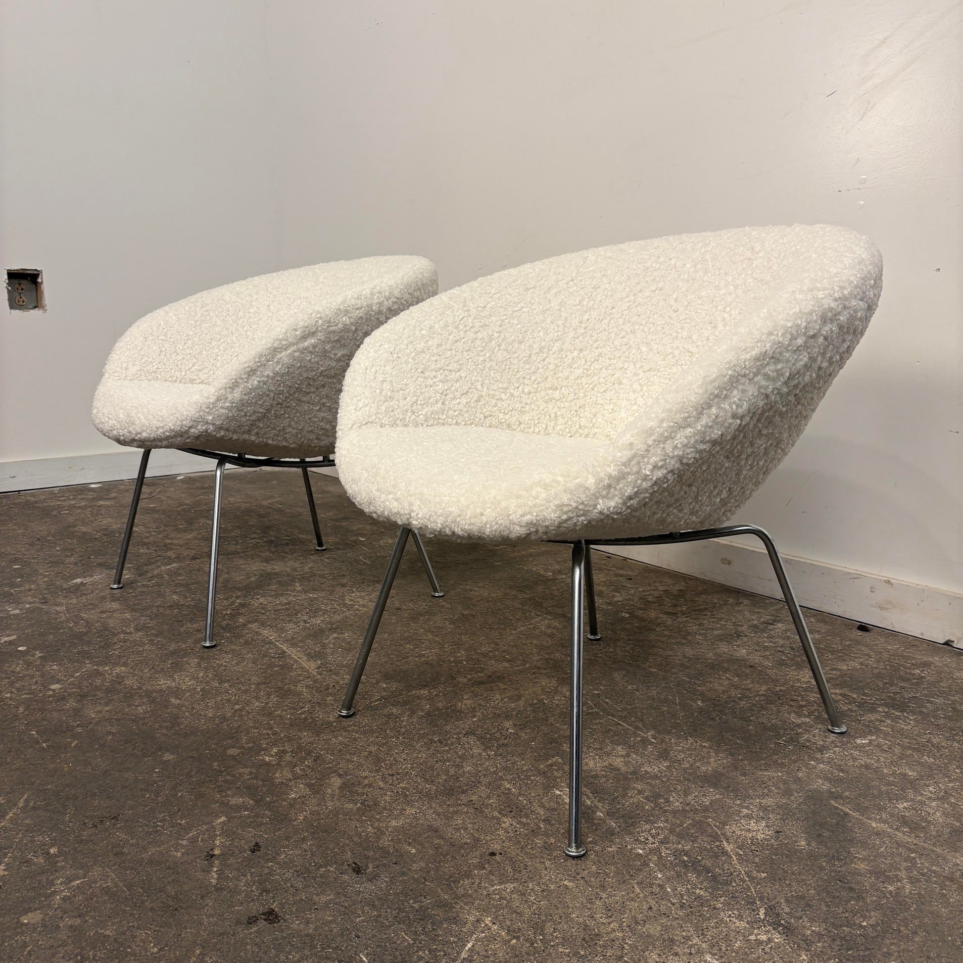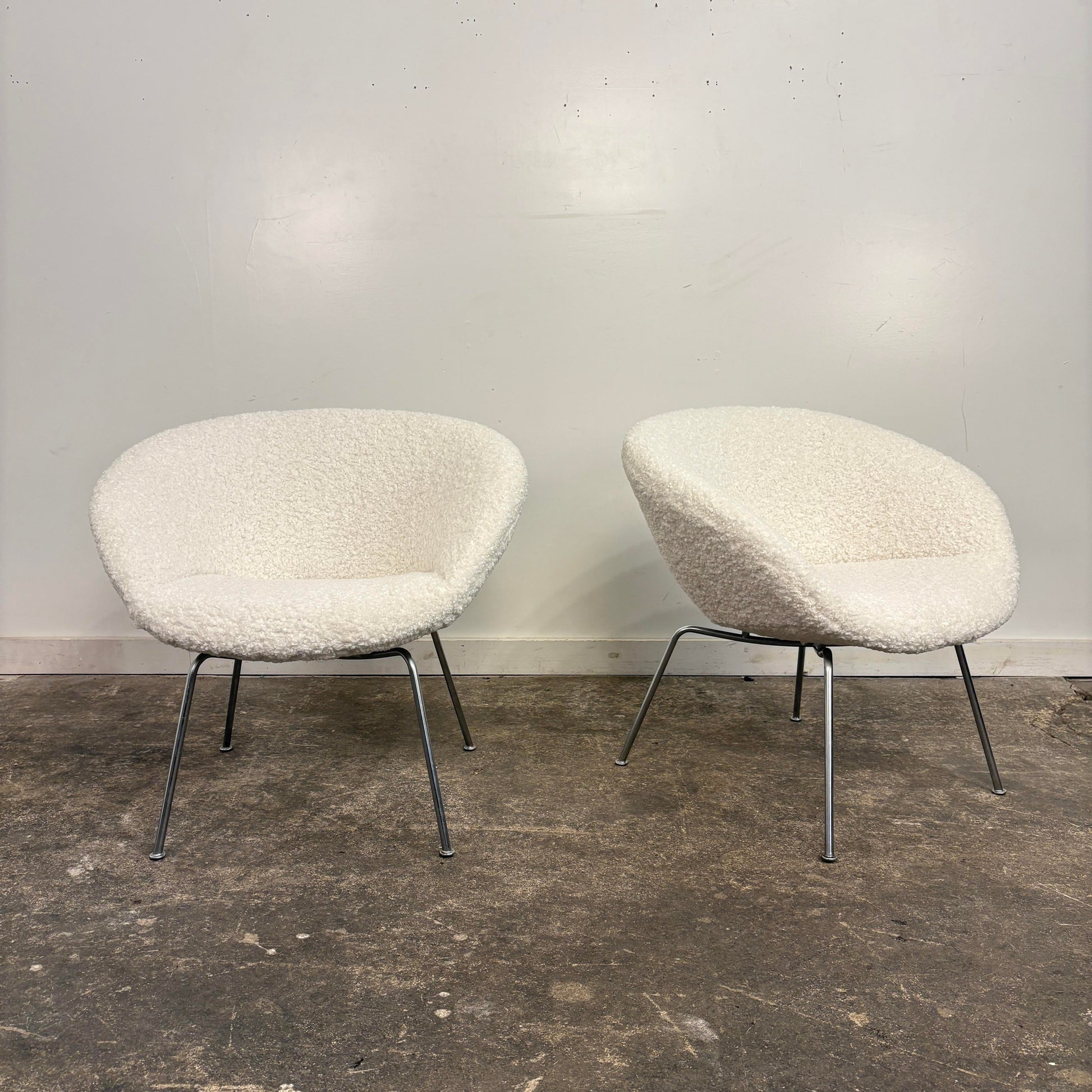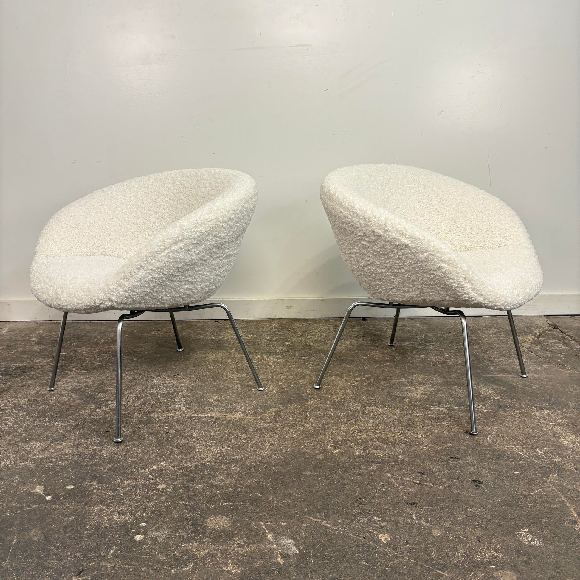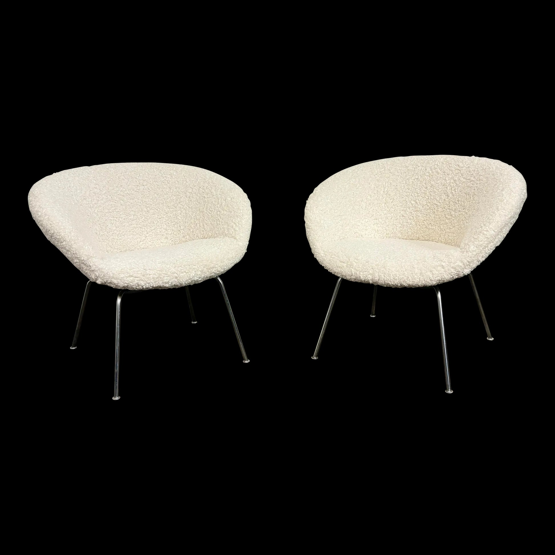 Mid century modern Pair of Arne Jacobsen Pot Chairs for Fritz Hansen. This pair of chairs has been reupholstered in a white boucle fabric and cleaned up chrome legs. The chairs no longer have a makers mark.