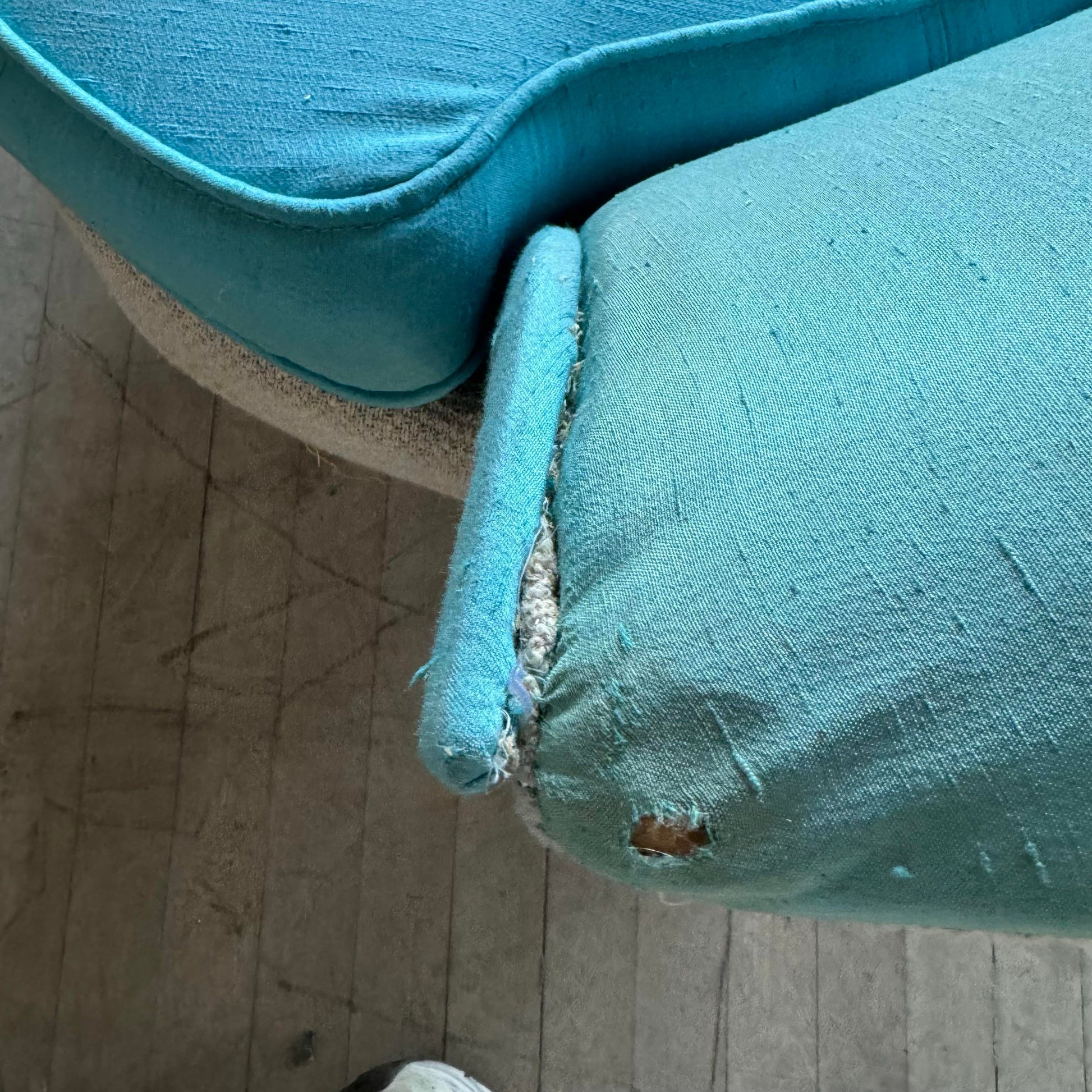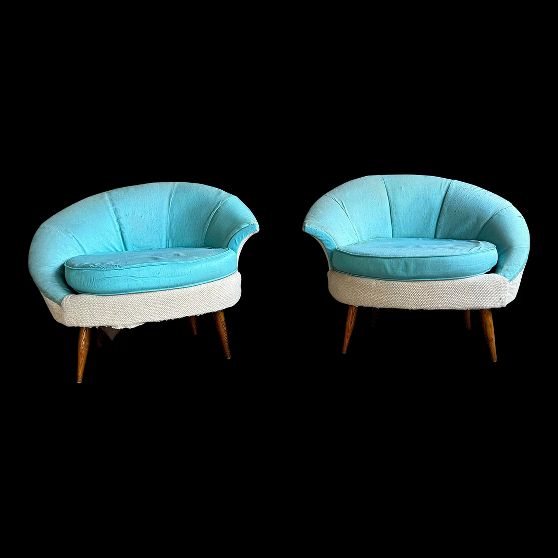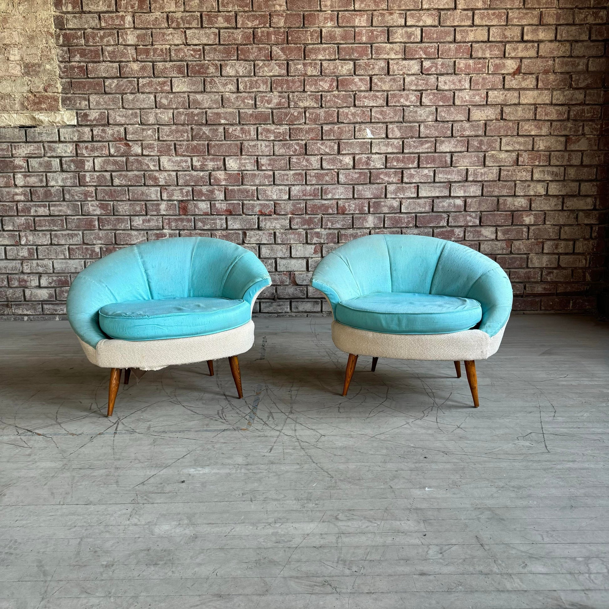 Pair of mid century modern Asymmetrical Shell Chairs. We are unaware of the maker of these chairs. They have a wonderful shape that’s flows from the back to the singular arm. The shape of the chairs  suggest they are to be place beside each other and are perfect for a conversation room.