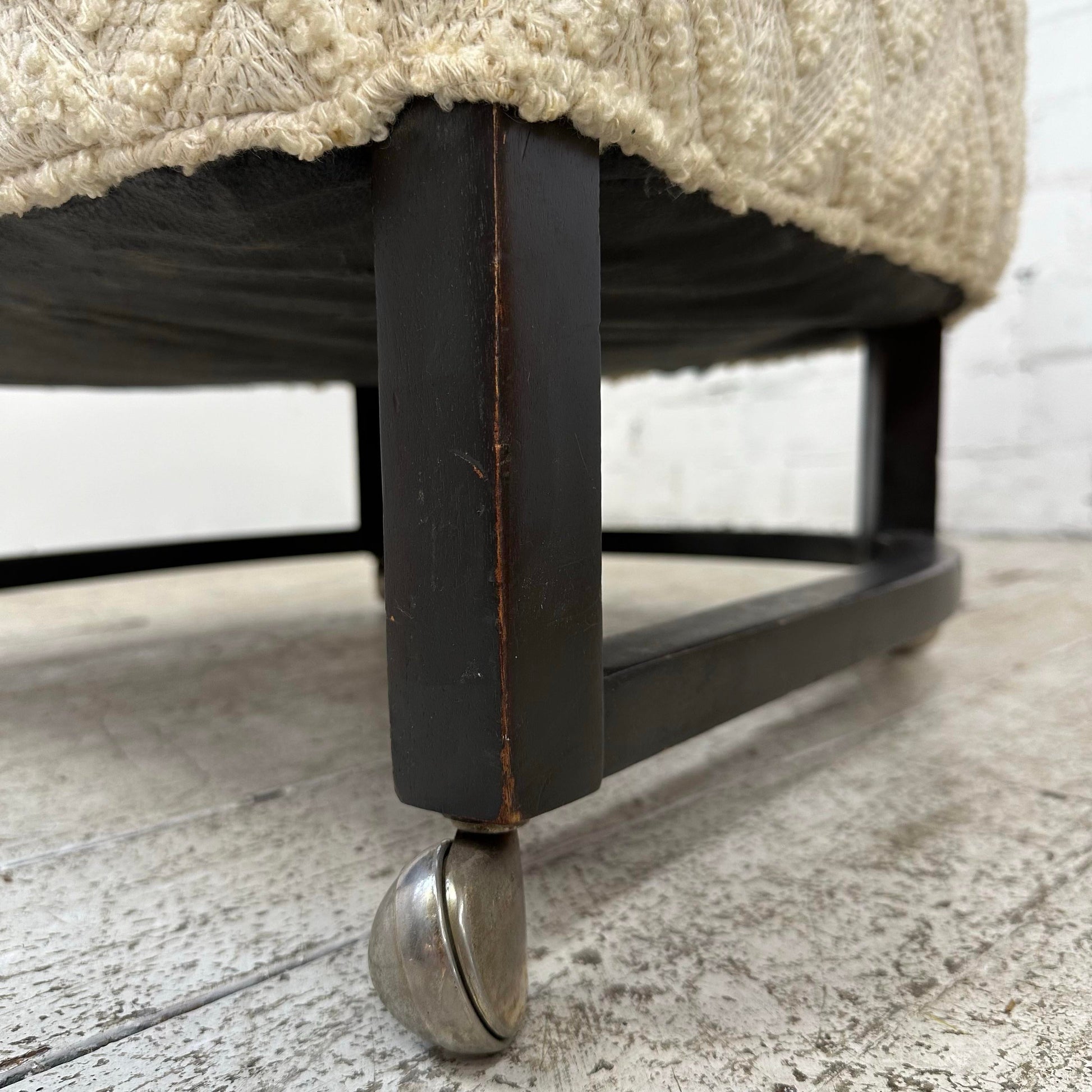 Mid century modern Pair of Barrel Back lounge chairs in the style of Harvey Probber. The set is two different upholstered chairs but are the exact same chair. The chairs sit on a solid wood base and feature 4 casters. The chairs could be used as lounge chairs or possibly game chairs. There is no makers mark on the chair but the design is similar to a Harvey Probber design.