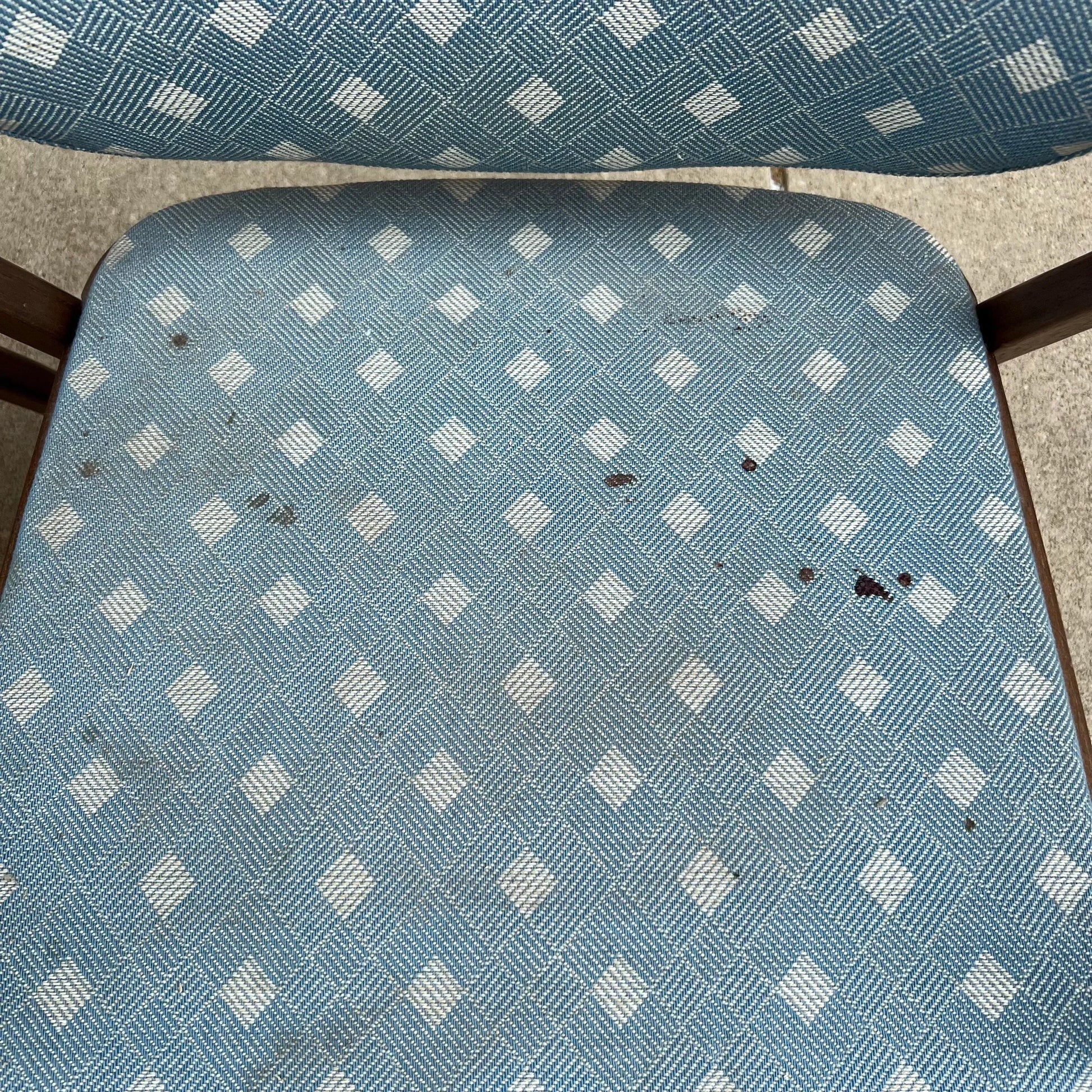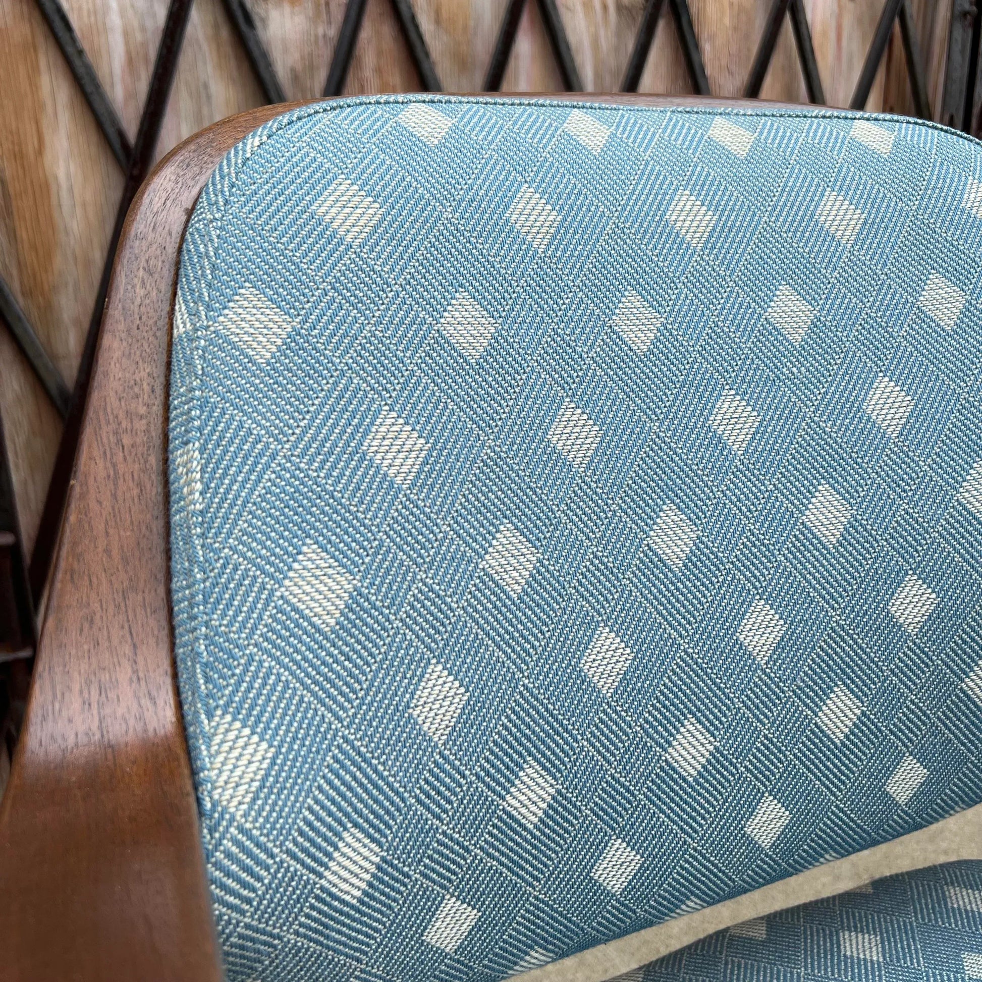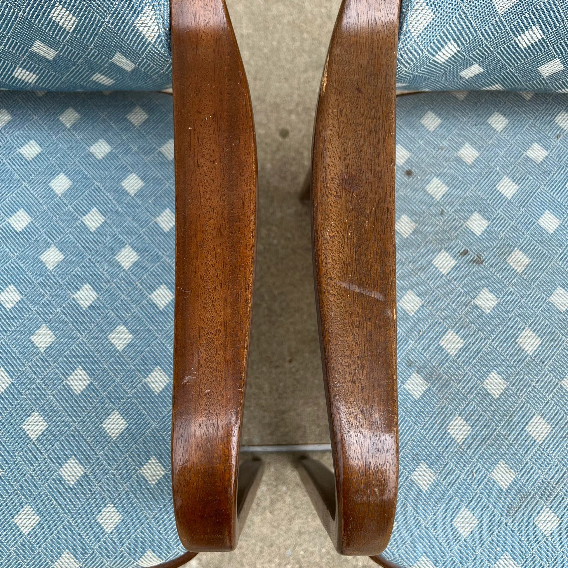 Pair of bentwood chairs by Don Pettit for Knoll. These chairs feature a blue and white diamond pattern on the fabric and a bentwood frame.
