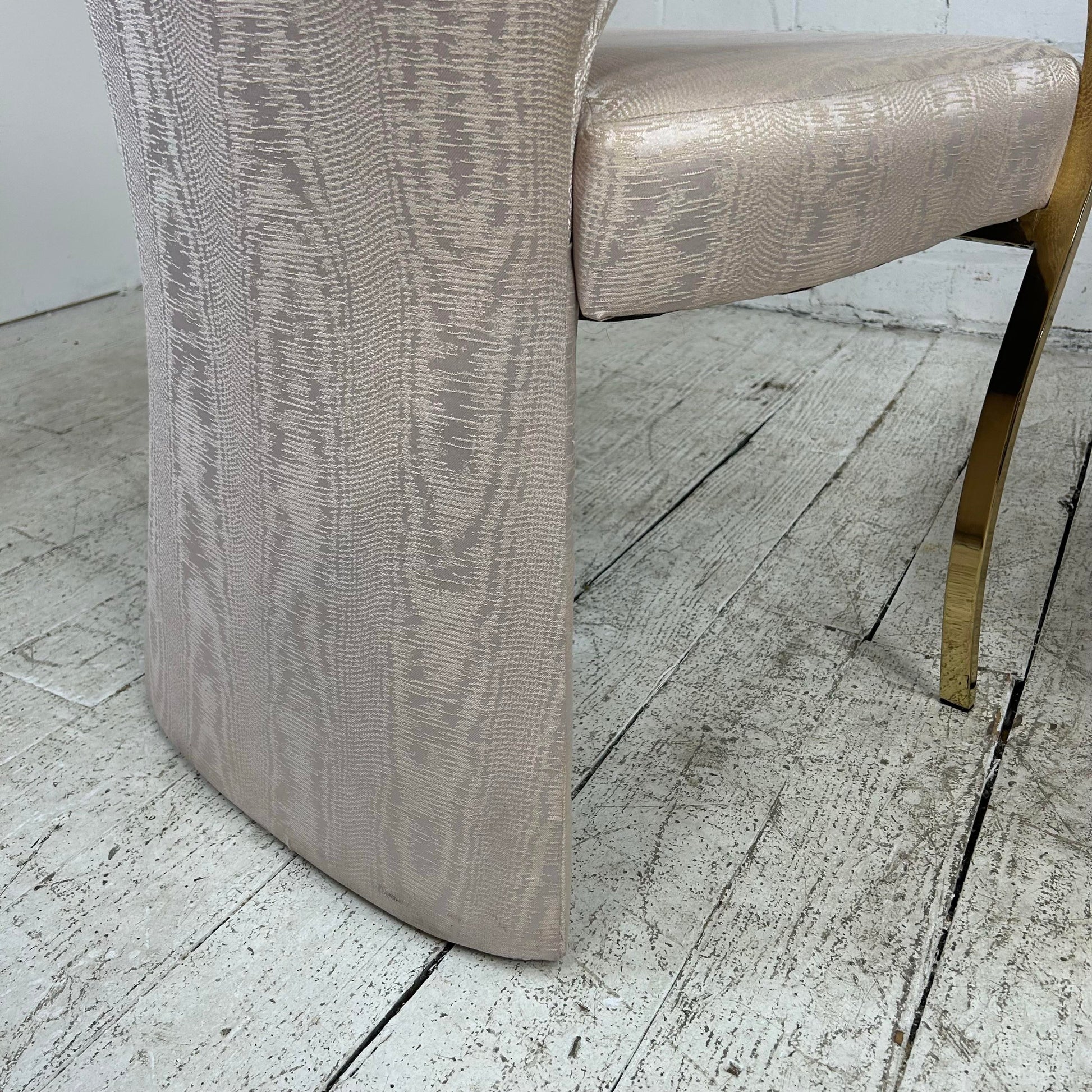 Vintage Hollywood Regency upholstered Carson’s armchair in great modern form, featuring a brass cantilever frame with a barrel backrest. Detailed raised soft padded seat cushion in pink upholstery and continuous arm to leg design with curved sculpted brass arms making it an extremely comfortable, supportive frame. Makers mark is missing but we believe this is by the company Carson’s. This stunning chair is a standout in any modern room and can be used as an end chair at a dining table, lounge or club chairs in a living room or even as a desk chair.