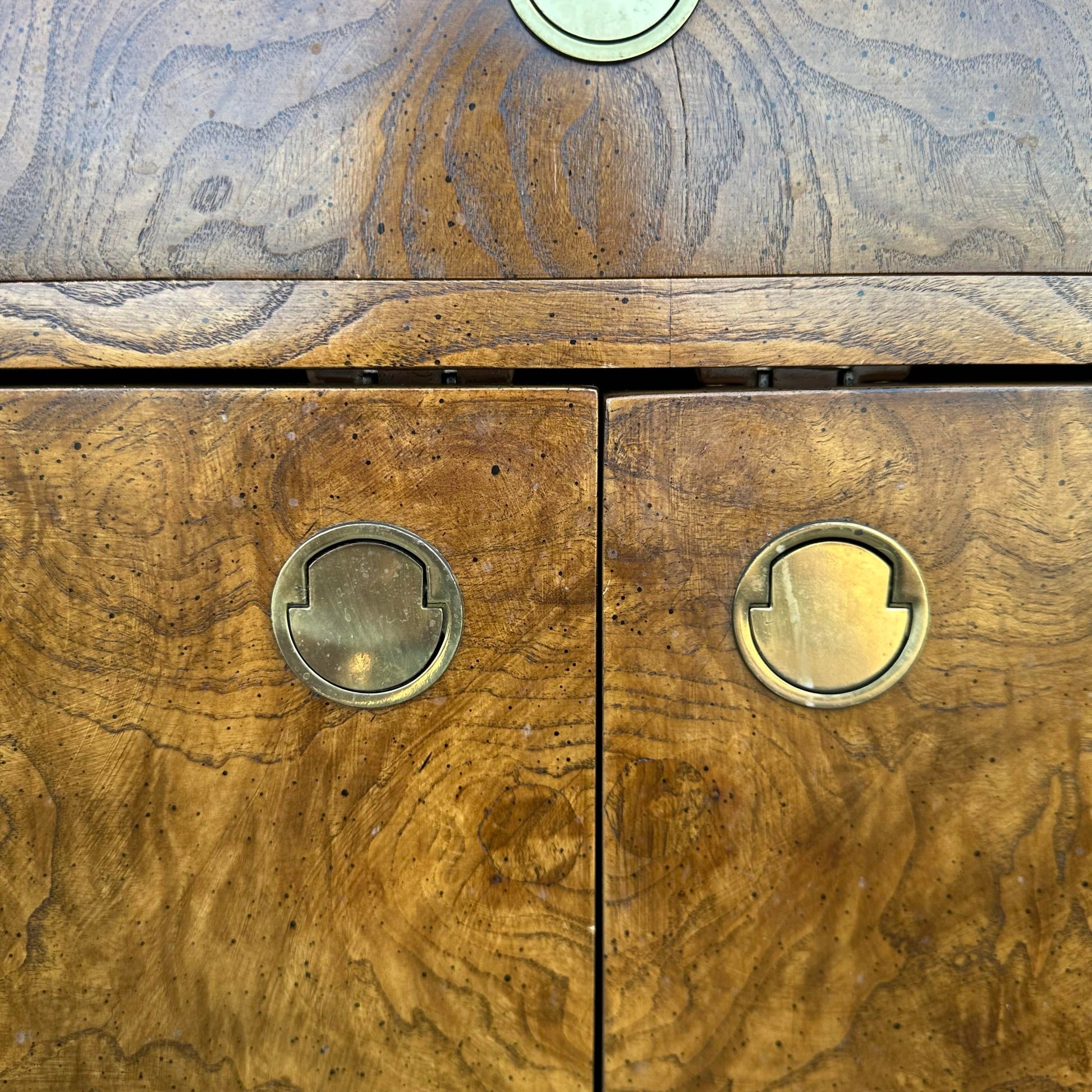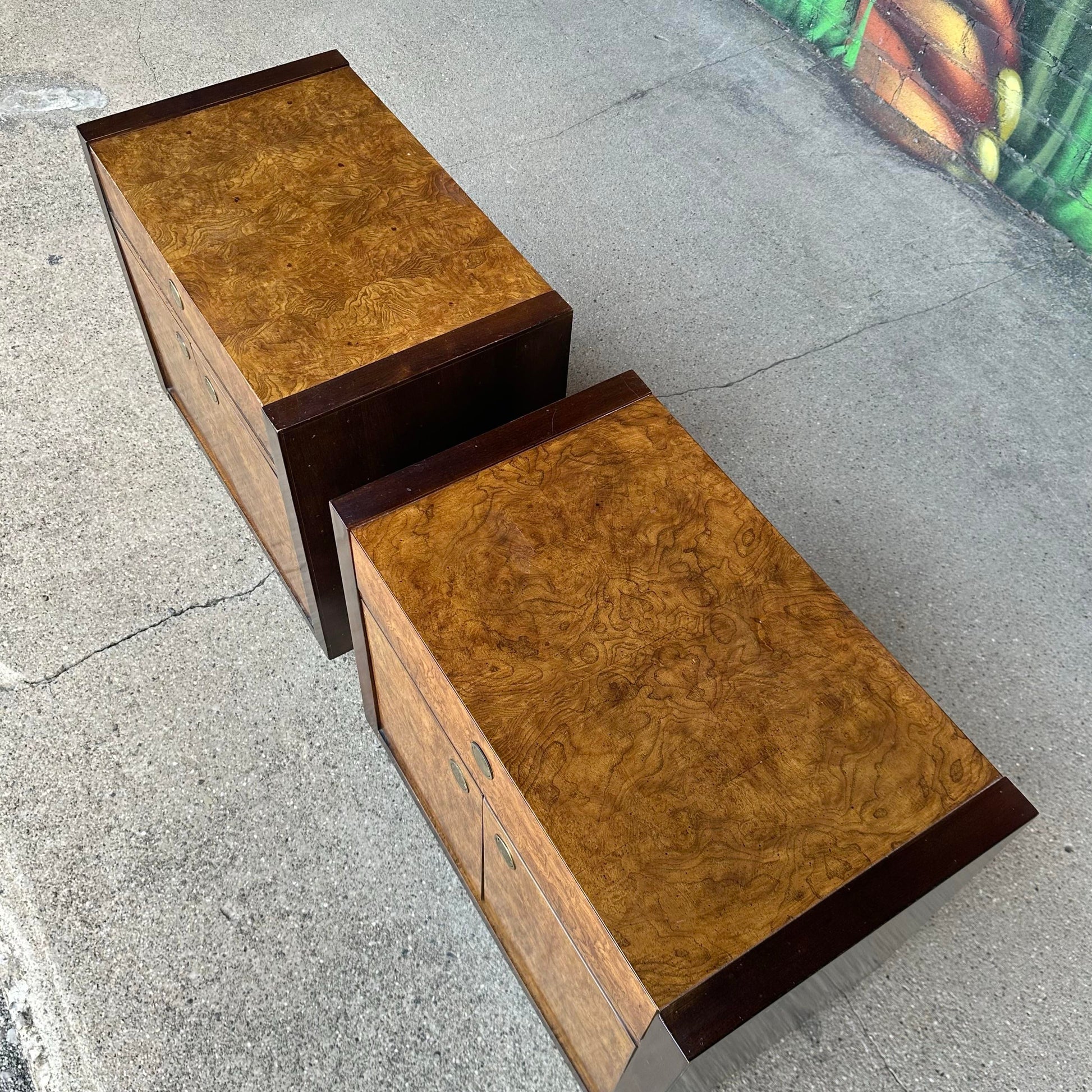 Pair of end tables from Century Furniture. These end tables feature burlwood panels with contrasting walnut sides. The drawer pulls are round brass campaign-style pulls that lay flush when not in use. These end tables have one long slim drawer at the top and two doors that open to a large storage compartment. Makers mark in top drawer.