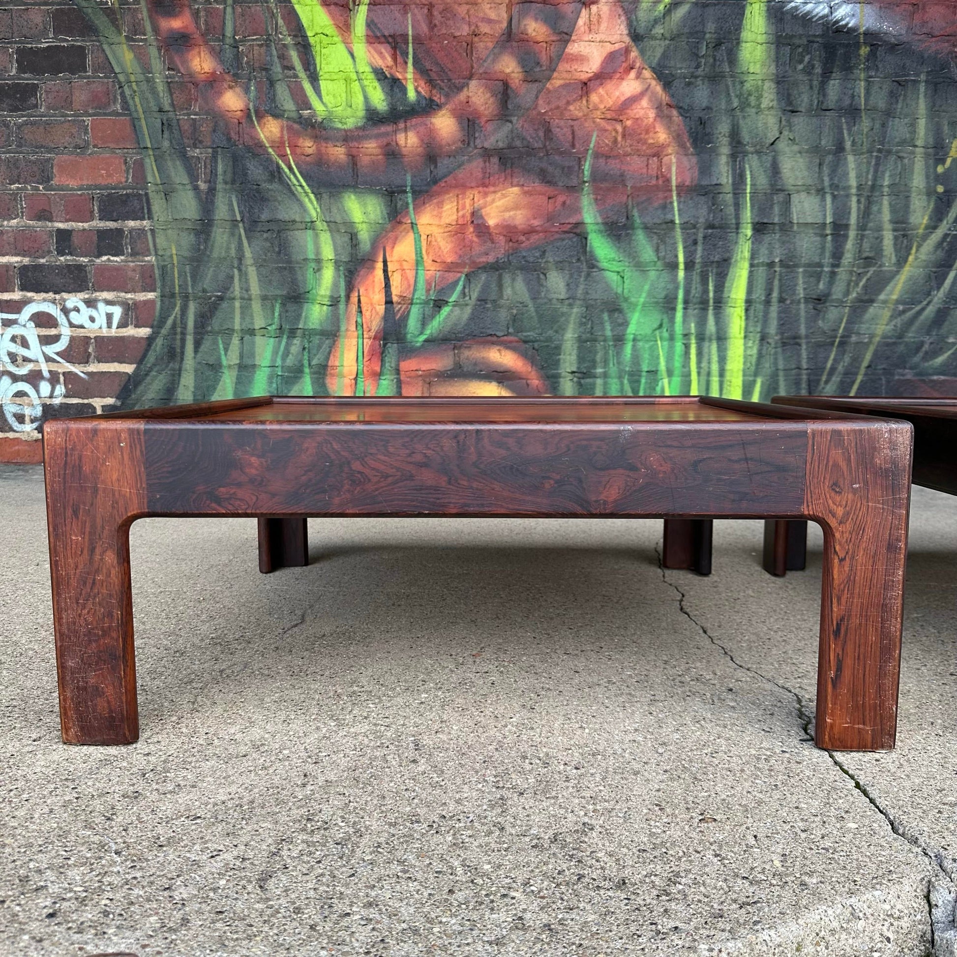 Pair of Mid Century Modern Rosewood Illum Wikkelso by Neils Eilersen. This set of end tables features a low profile design with squared shape and solid rosewood frame. There is no makers mark on the tables.