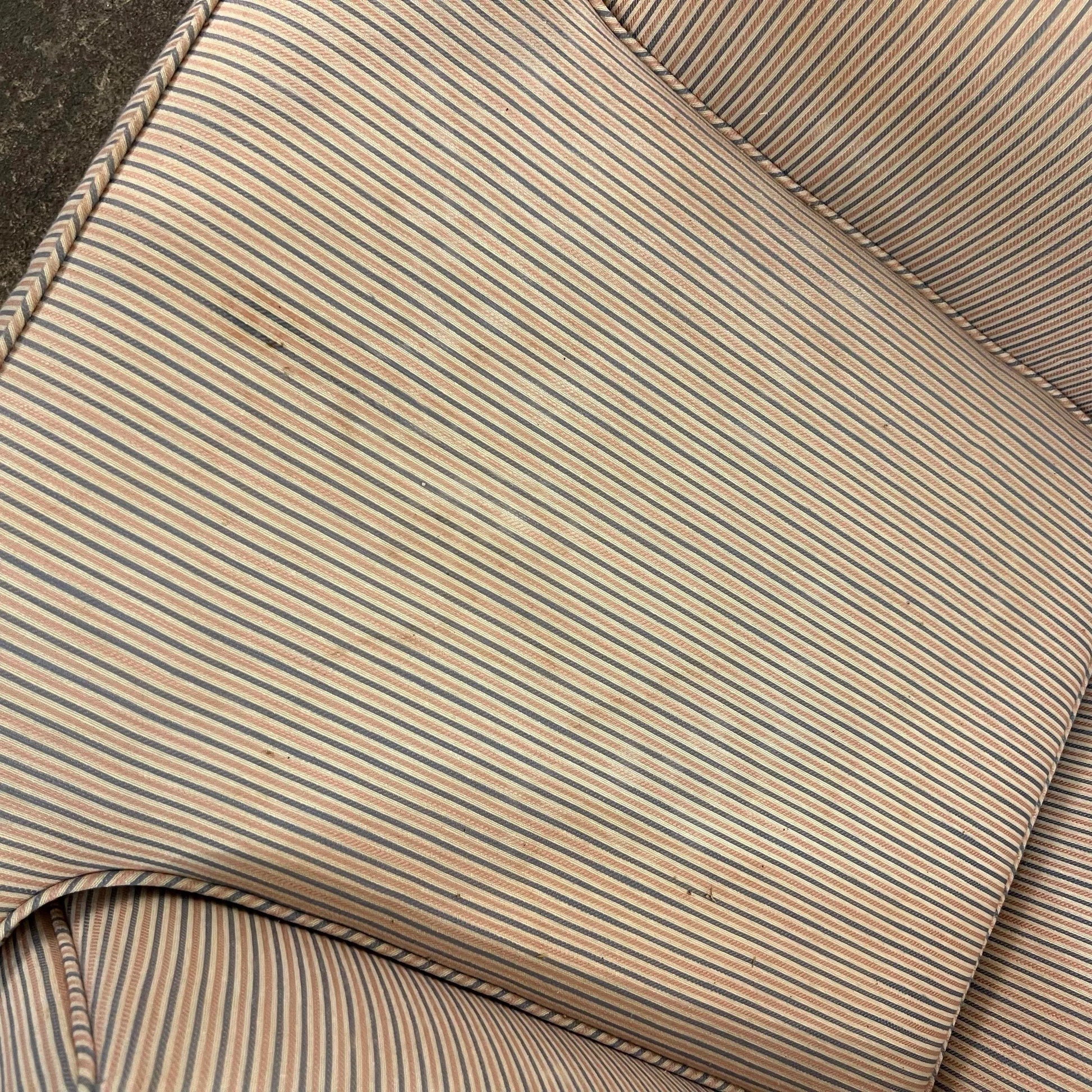 This is a petite pair of Dunbar style chairs on casters with a striped fabric. There is a traditional but modern feel to the chairs. There is no makers mark.