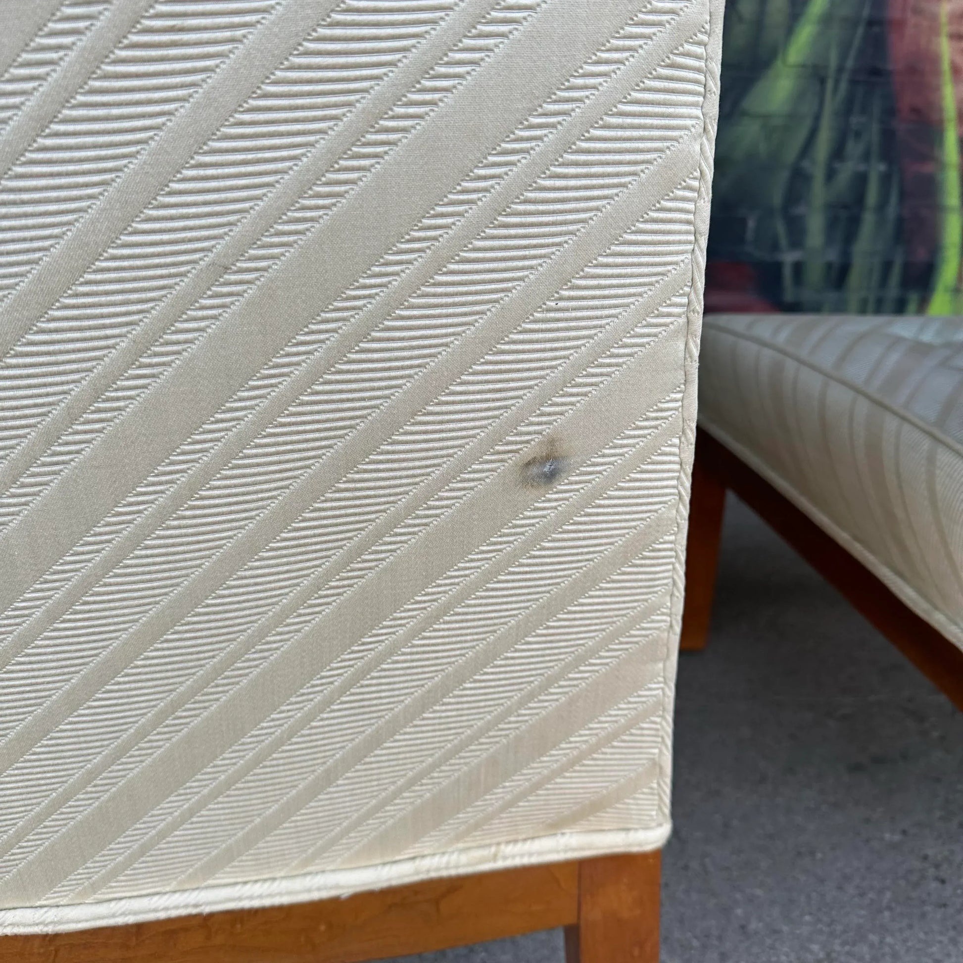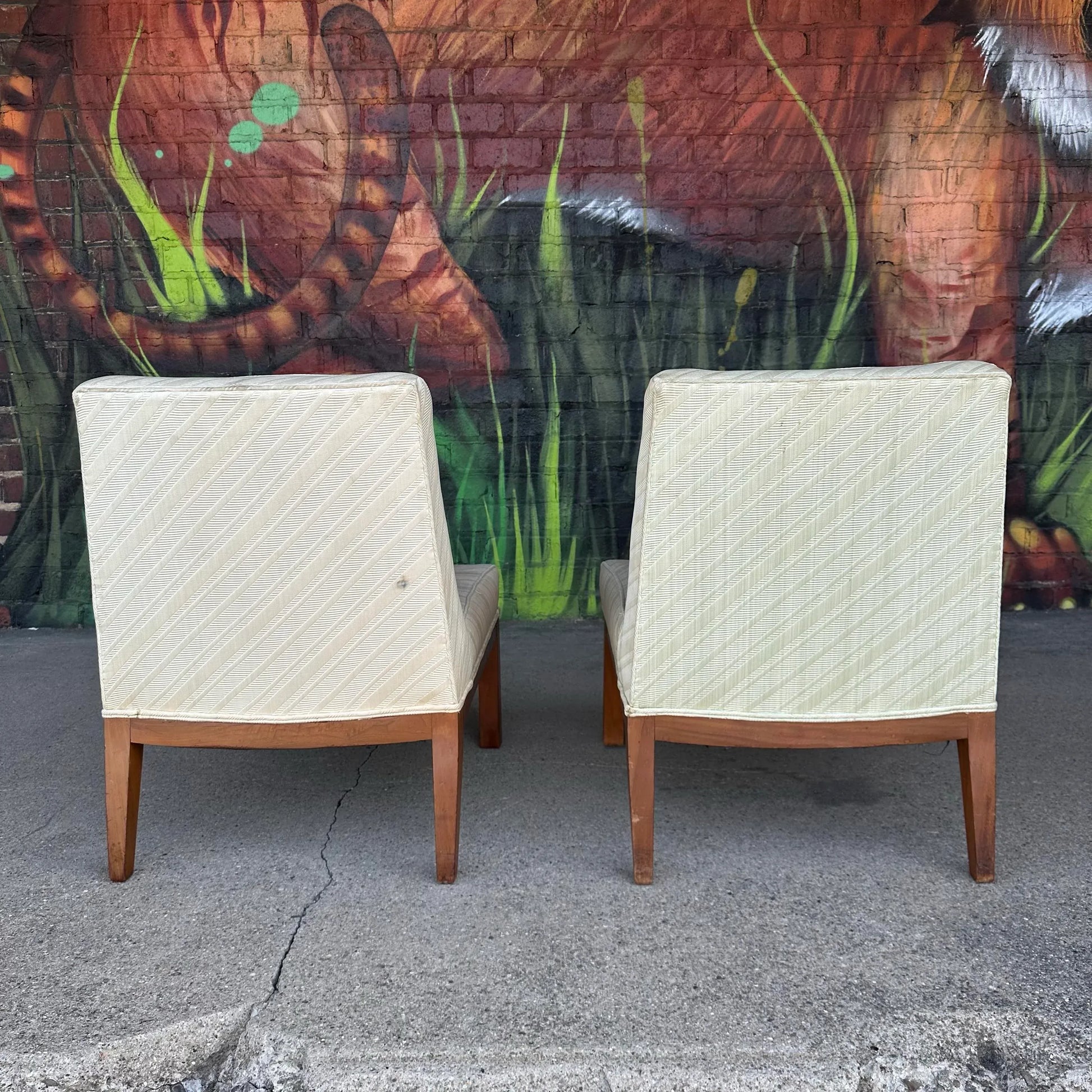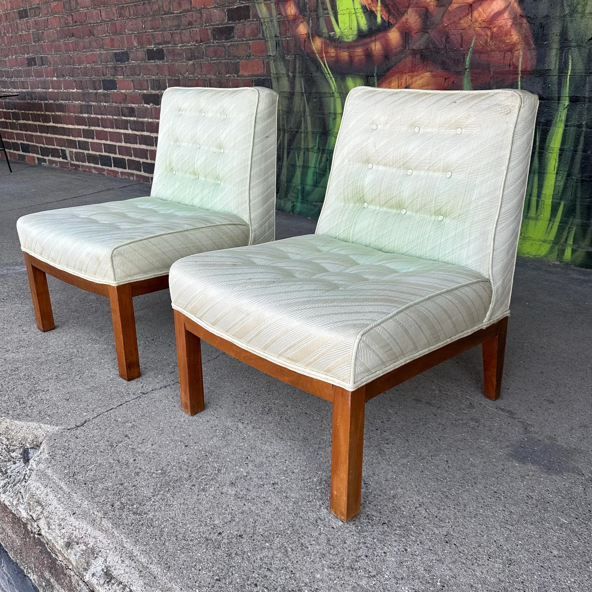 Pair of mid-century modern slipper chairs in the style of Dunbar. These chairs have a simple and structured silhouette and a tapered back. There is a slight curve to the frame which gives an elegant feel to the design. They have tufted detailing and covered in a tonal textured striped fabric. The base is constructed of walnut.