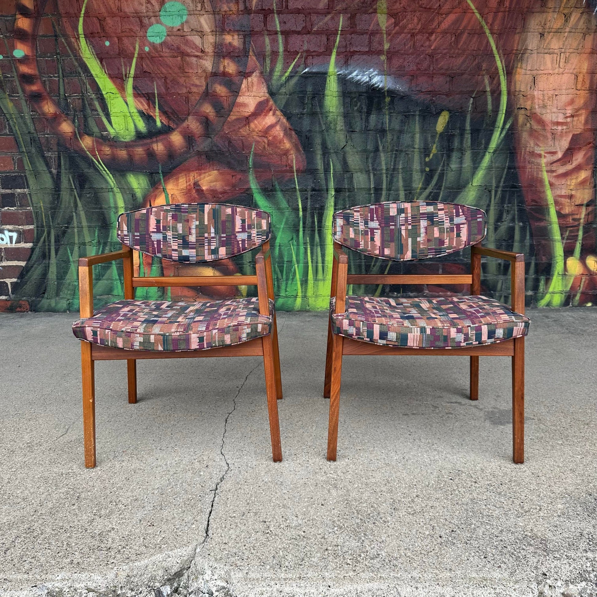 Pair of George Nelson chairs featuring a walnut frame with all the right angles and proportions. The current fabric has an abstract geometric design with colors of baby blue, dark blue, pink, olive green, and maroon.