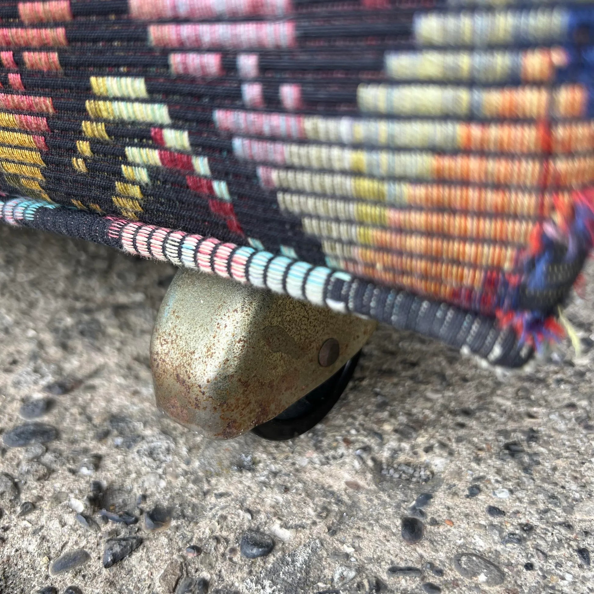 Pair of barrel chairs designed by Harvey Probber featuring an interesting concave base. The tapestry fabric on these chairs is the technicolored dream coat of fabrics showcasing all the colors of the rainbow. Chairs sit on 4 brass casters.