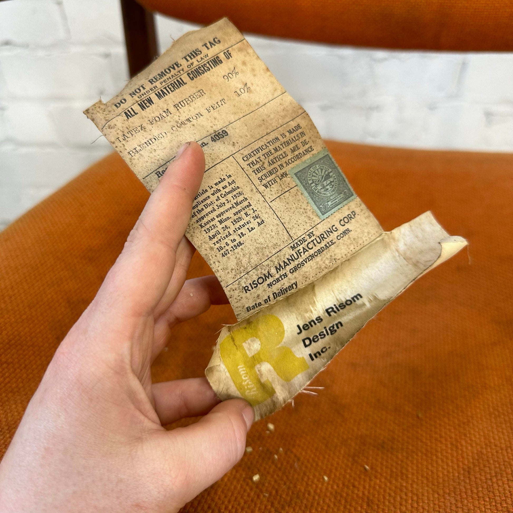 There is a Jena Risom tag on the bottom of the seat.