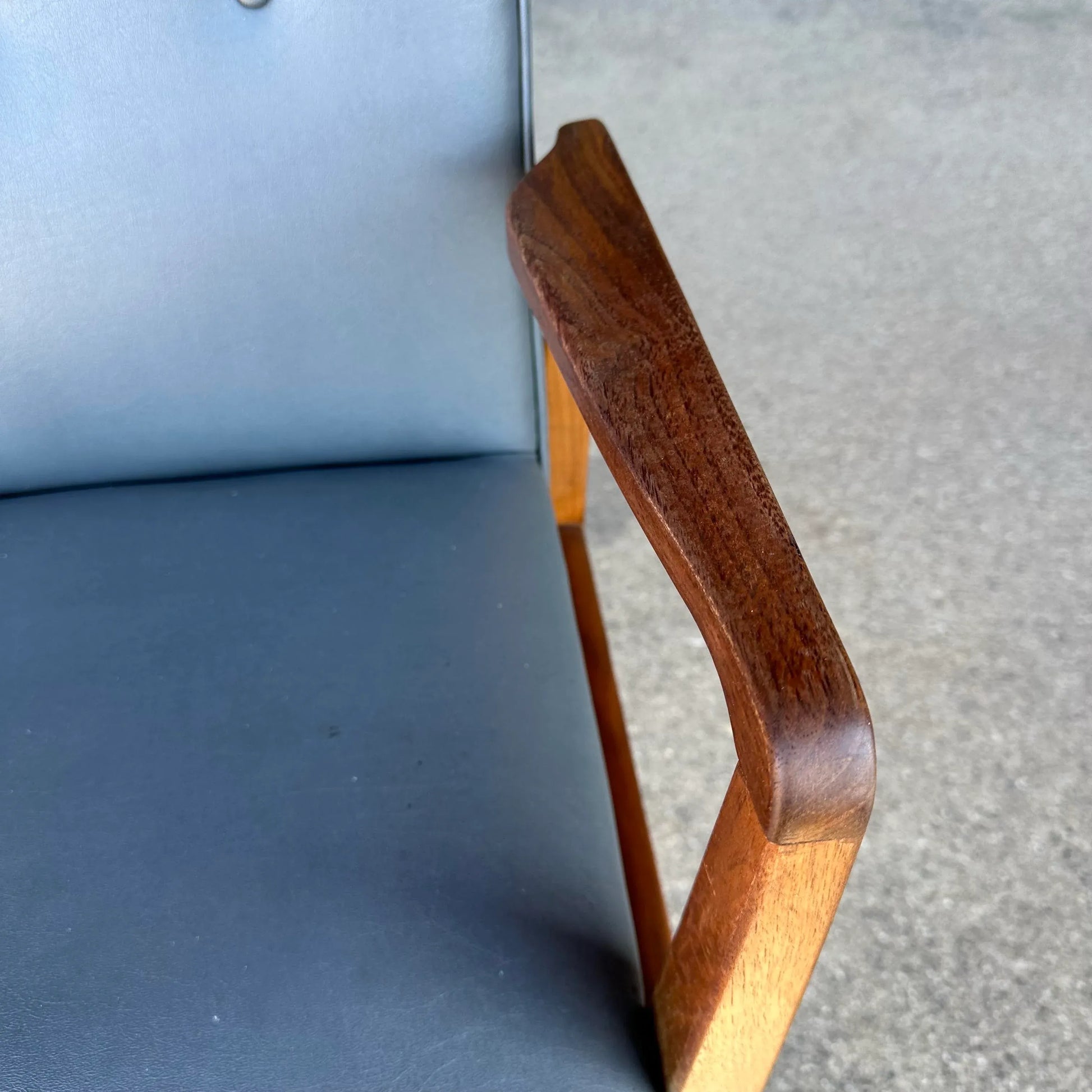 Pair of Jens Risom 1103 arm chairs. These chairs feature an angular solid walnut frame with beautiful lines and proportions. The seats are a grey vinyl.