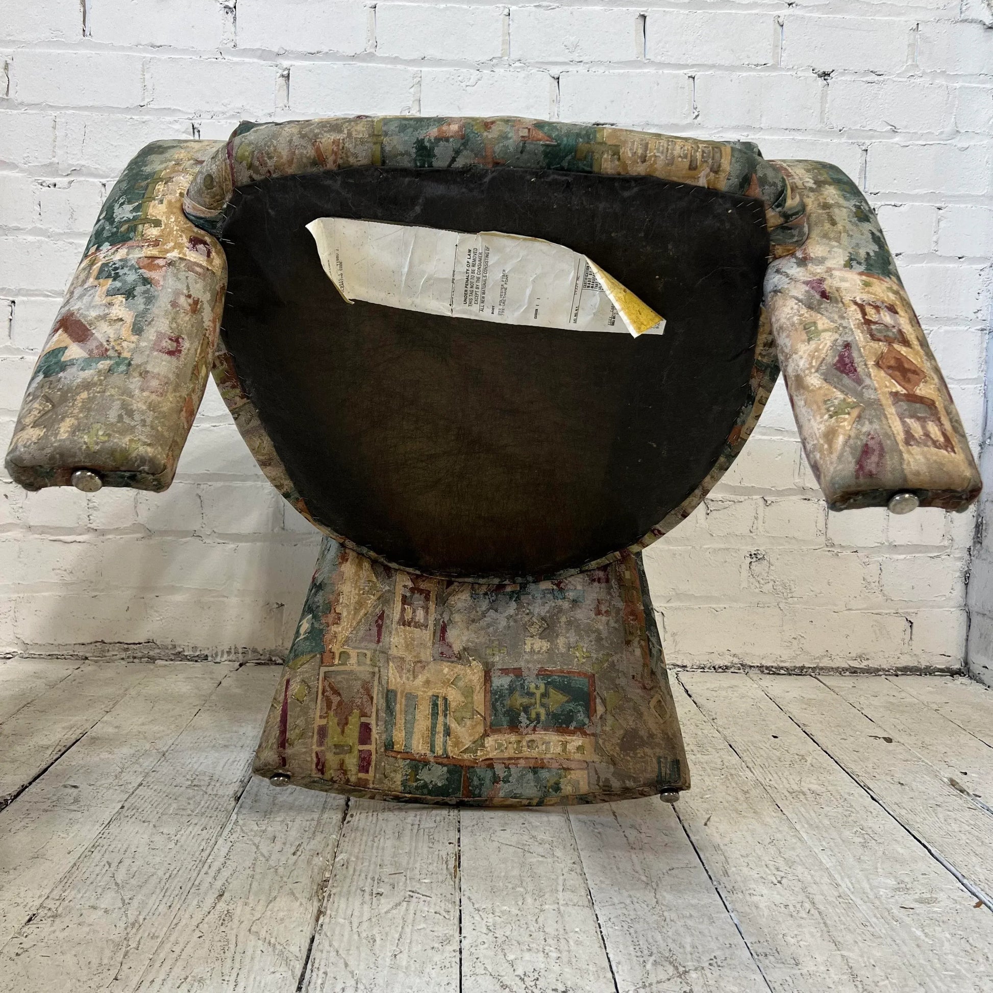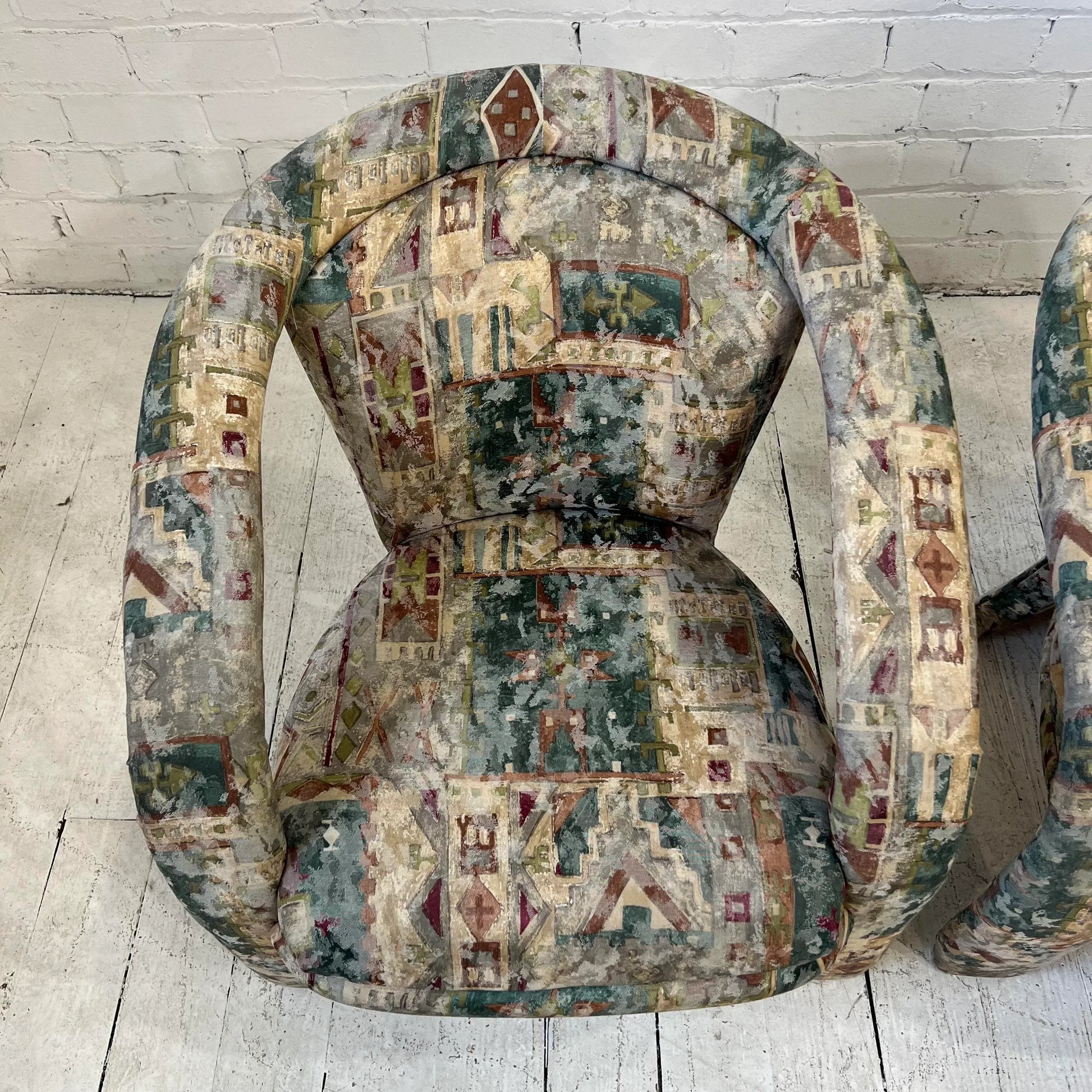 Pair of Vladimir Kagan Style 90s three legged chairs in a funky fabric