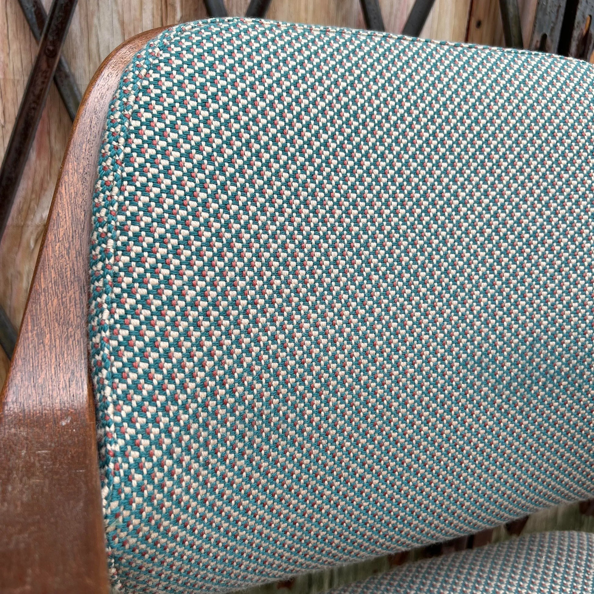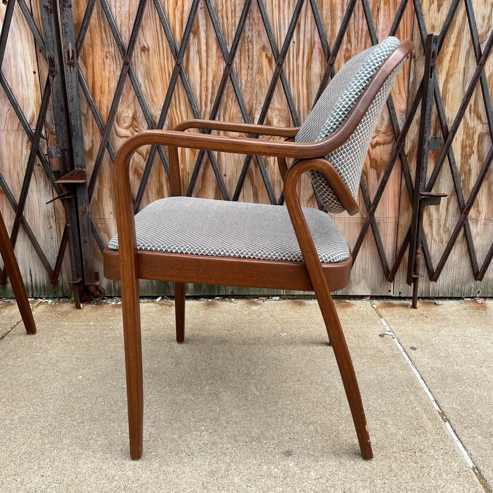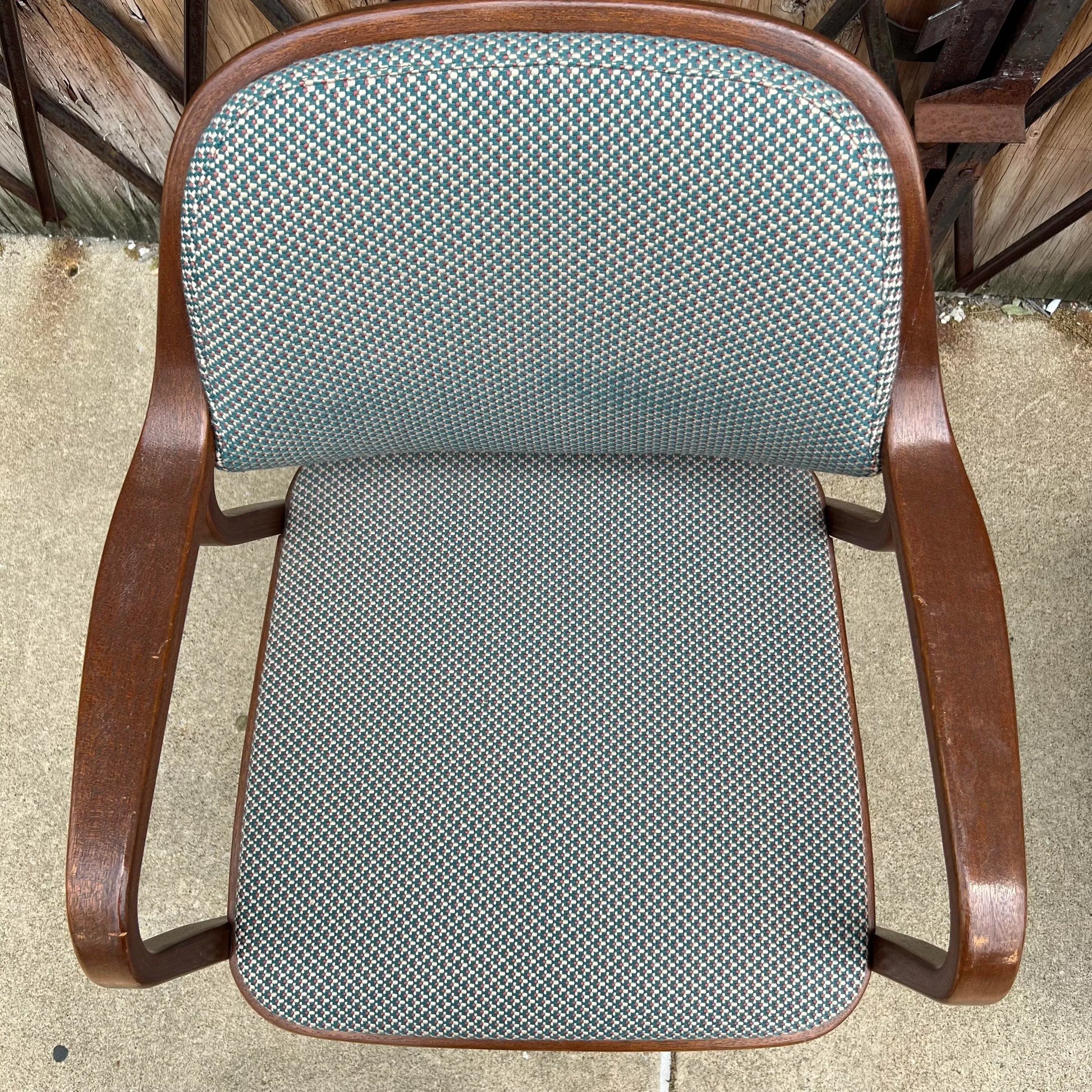 Pair of bentwood chairs designed by Don Pettit for Knoll. These chairs feature a bent wooden frame and a teal fabric with cream and red details.