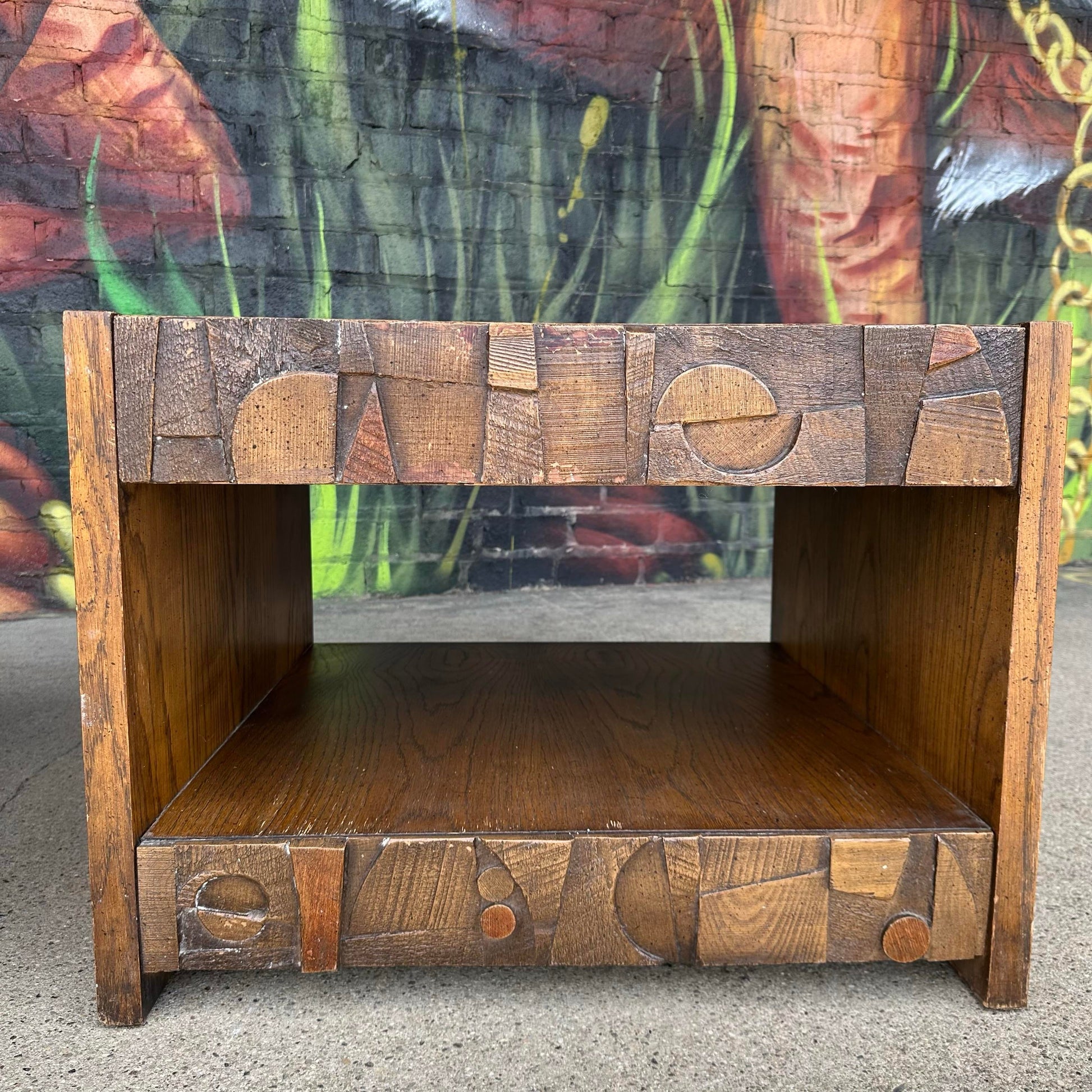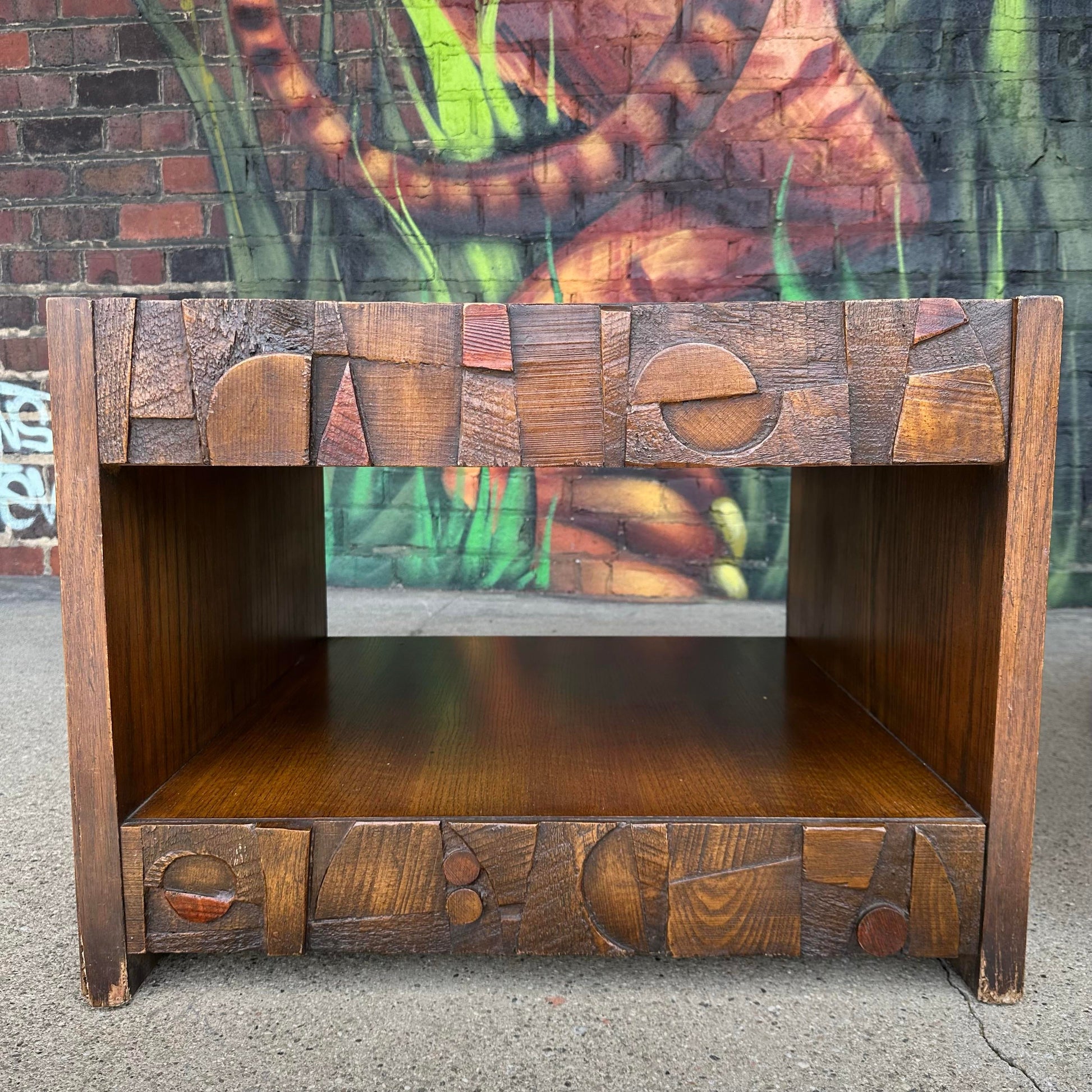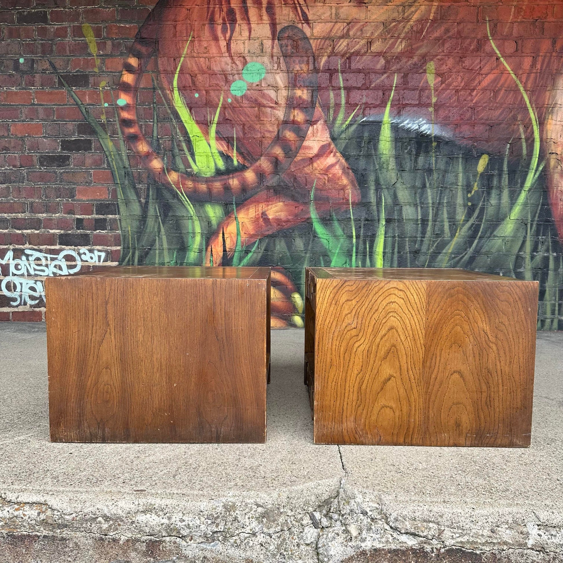 A bold and sculptural pair of square end tables by Lane, showcasing the iconic Brutalist style that defined the late mid-century era. These statement-making pieces feature a rich walnut finish and a distinctive geometric facade, echoing the architectural influence of the period.