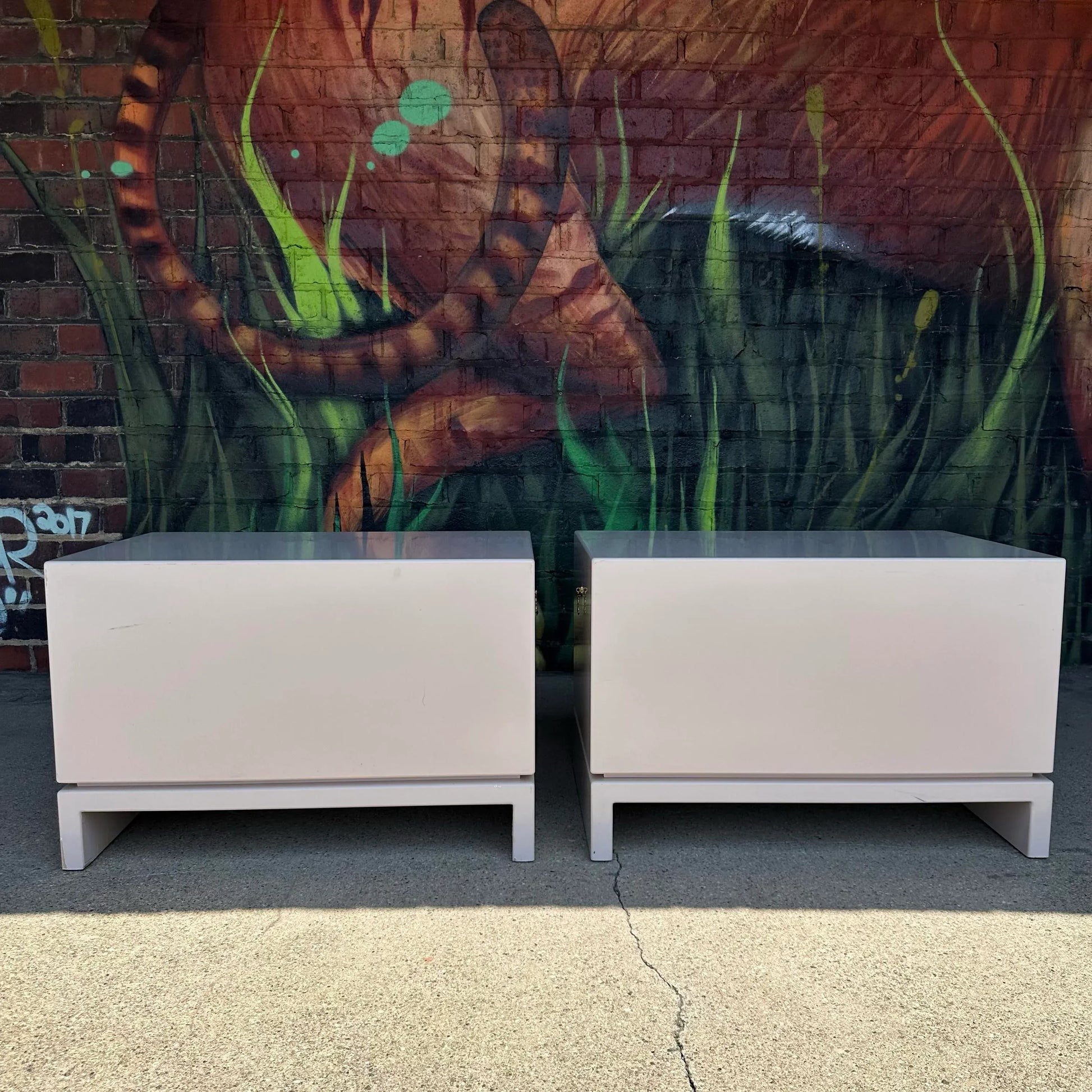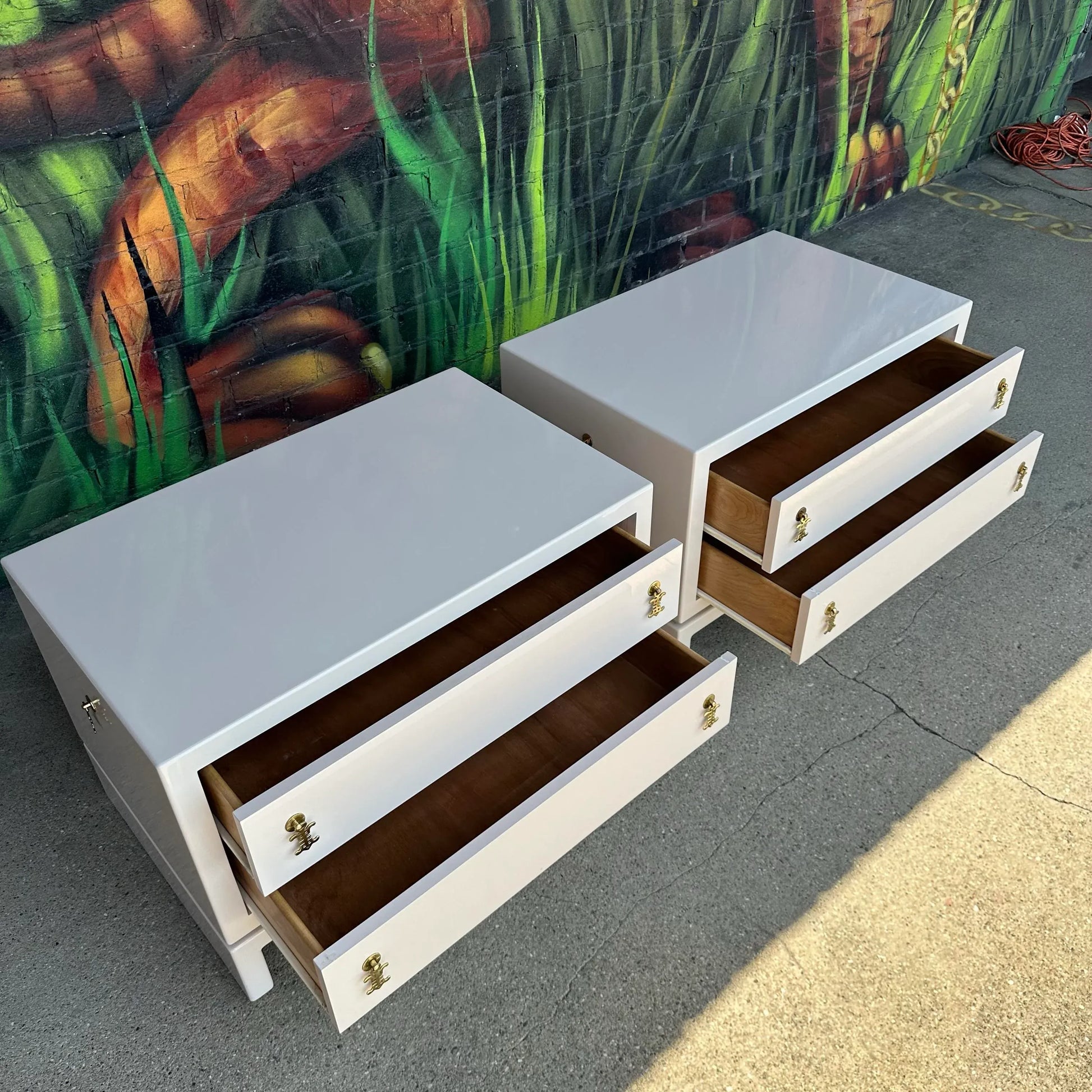 Pair of large lacquered nightstands in a lovely light pink shade. These feature brass pulls and 2 drawers per piece.