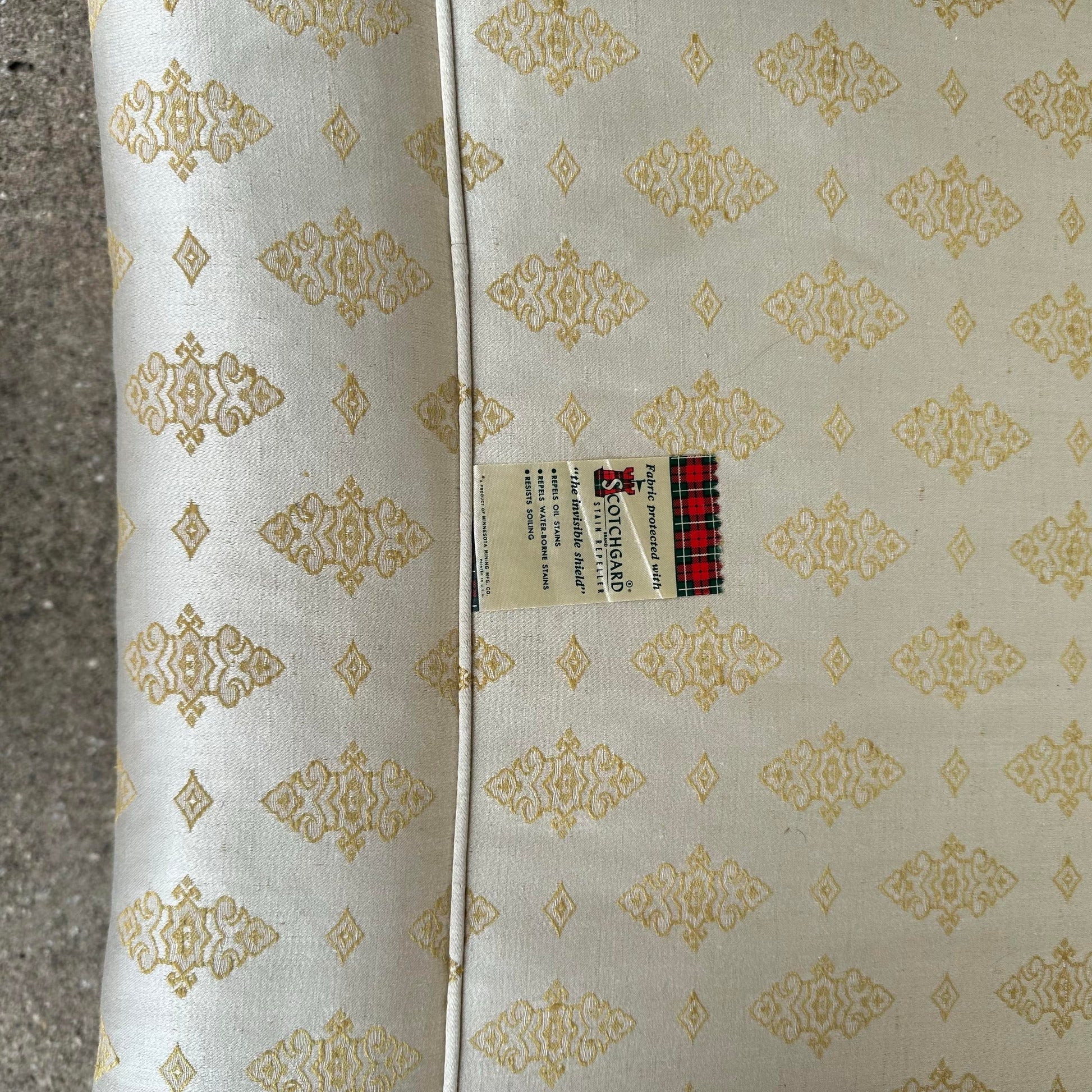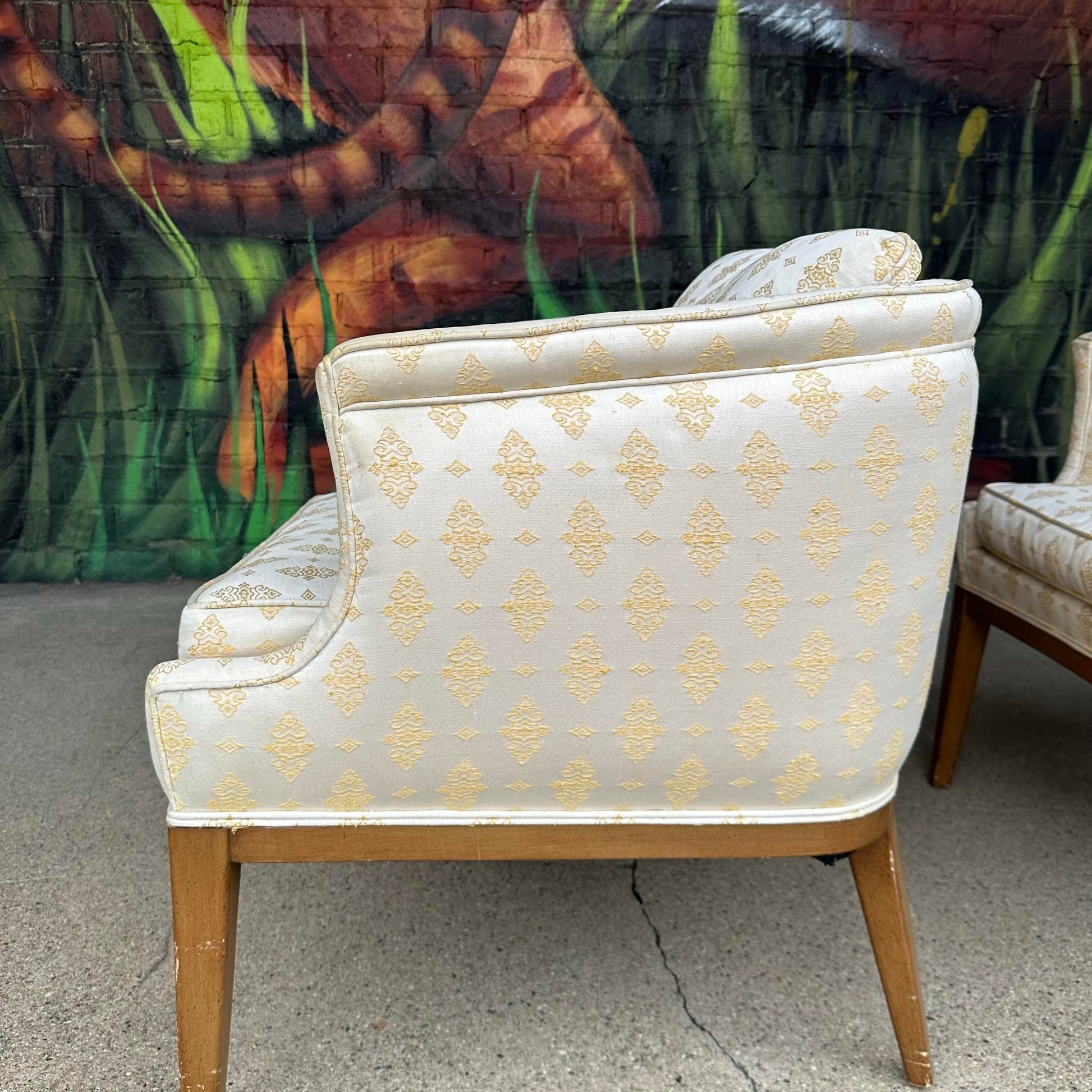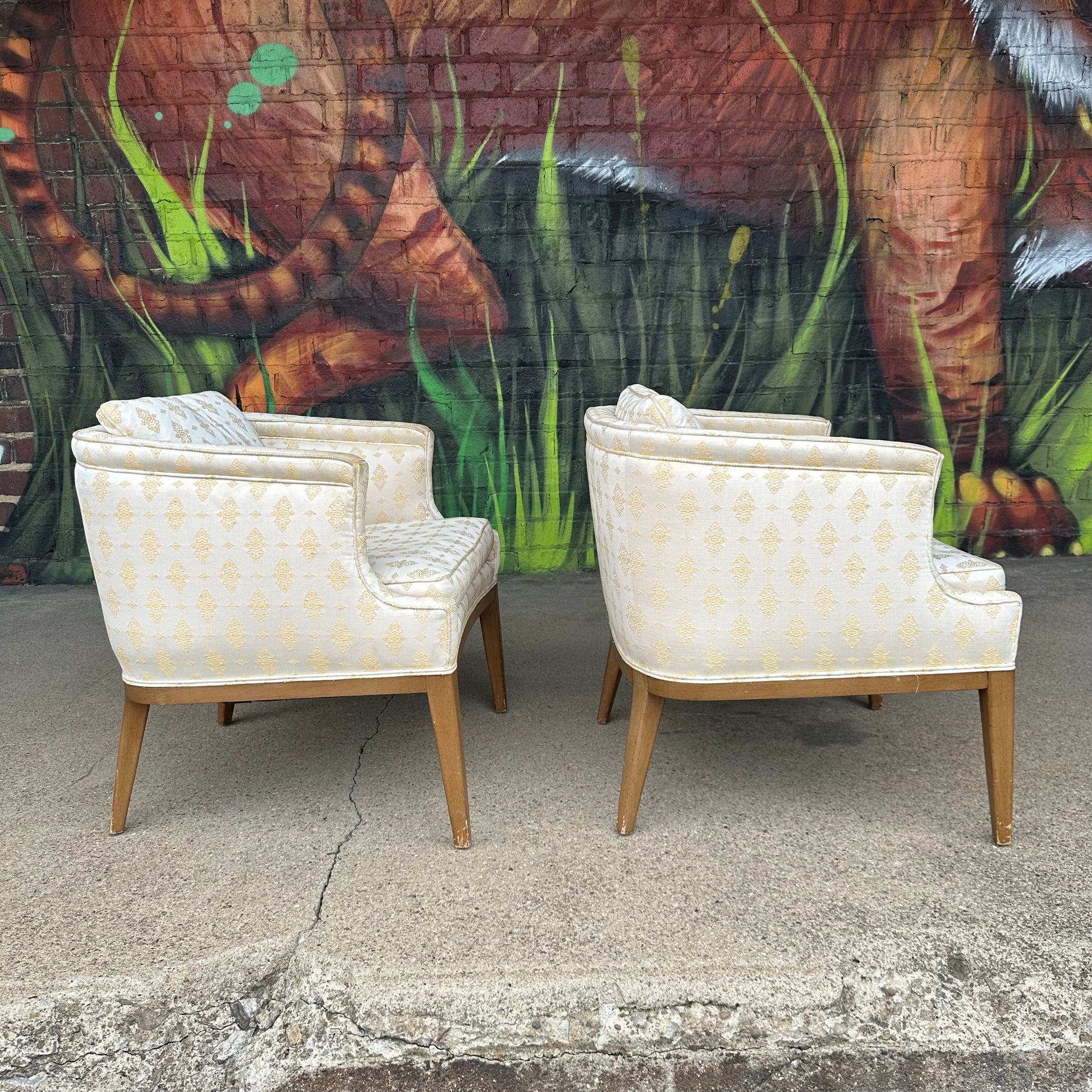 Pair of mid century modern side chairs featuring a “tub” shaped back, curved arms, and angled tapered wooden legs. Current upholstery is a satin cream and gold fabric. Wooden base is a mid-toned wood with “antique speckled” finish.