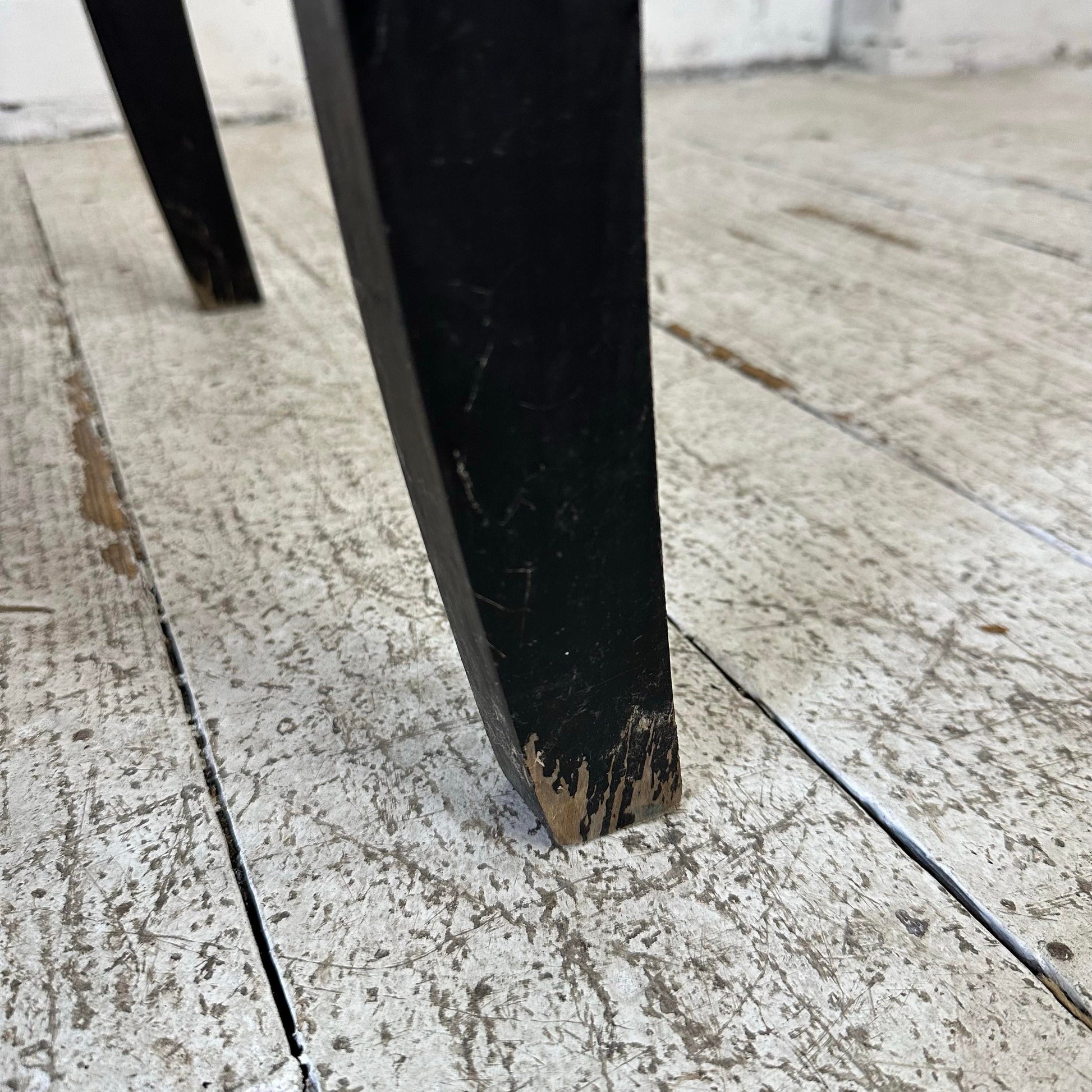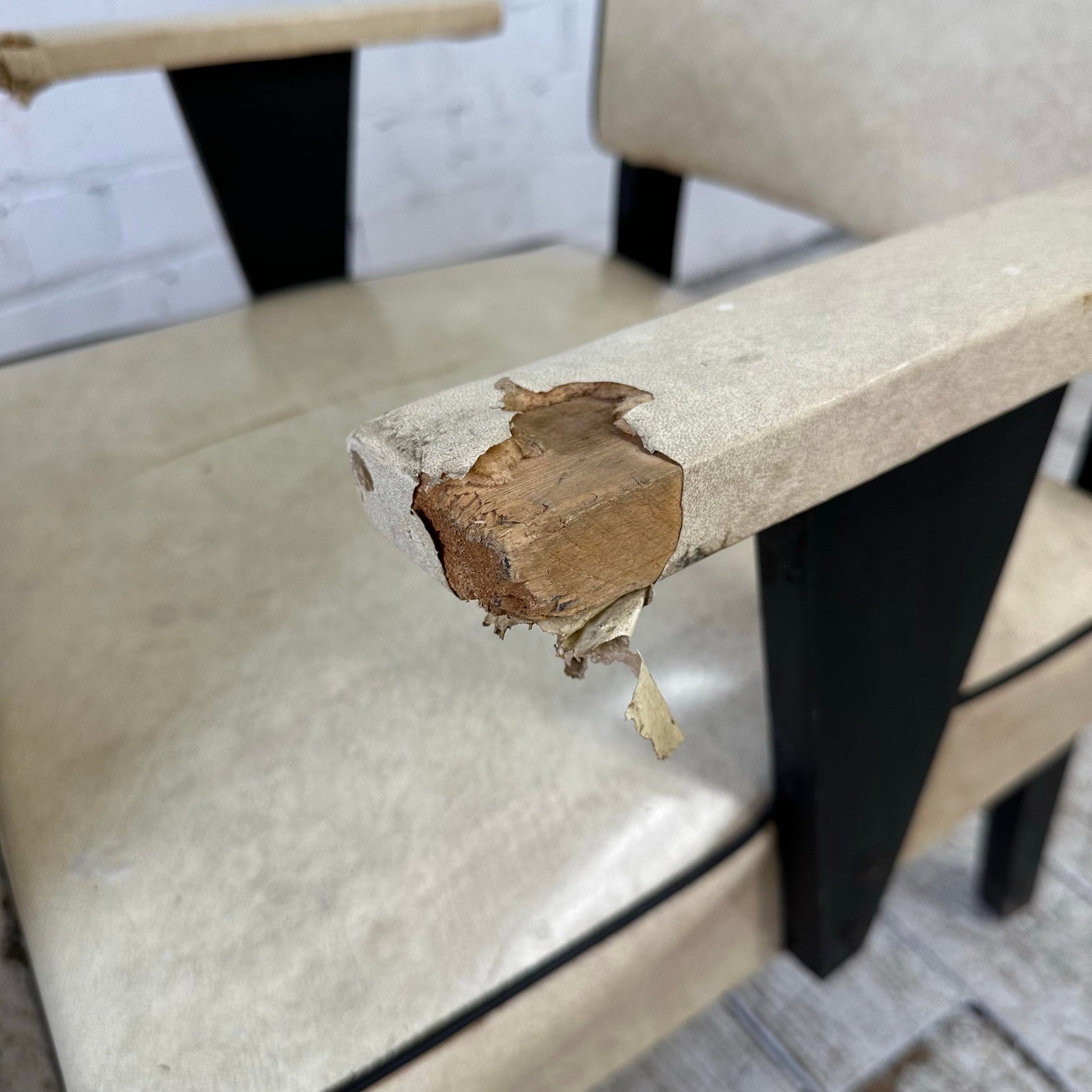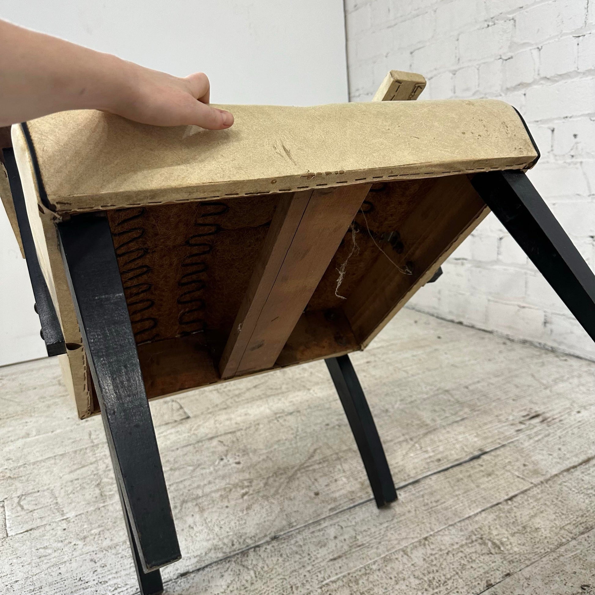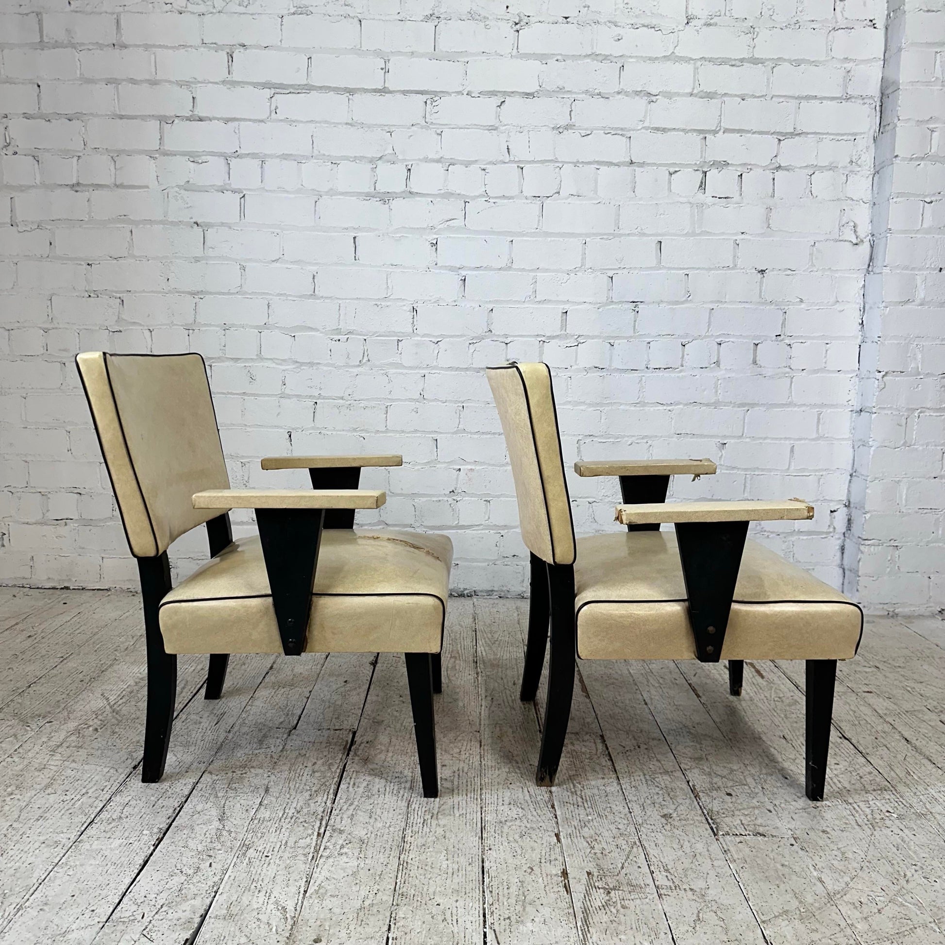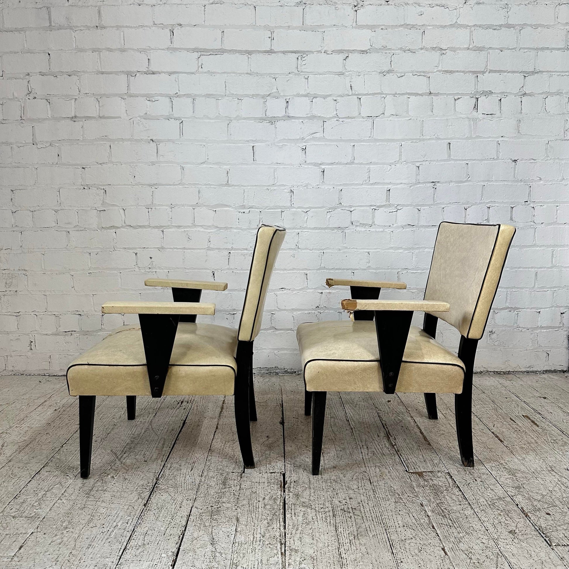 Pair of Mid Century Modern Arm Chairs. This vintage pair features vinyl upholstery and painted black wooden frame. The pair has a fun retro look about them with a triangular arm rest. There is no makers mark on the chairs and we are unaware of the brand or designer.
