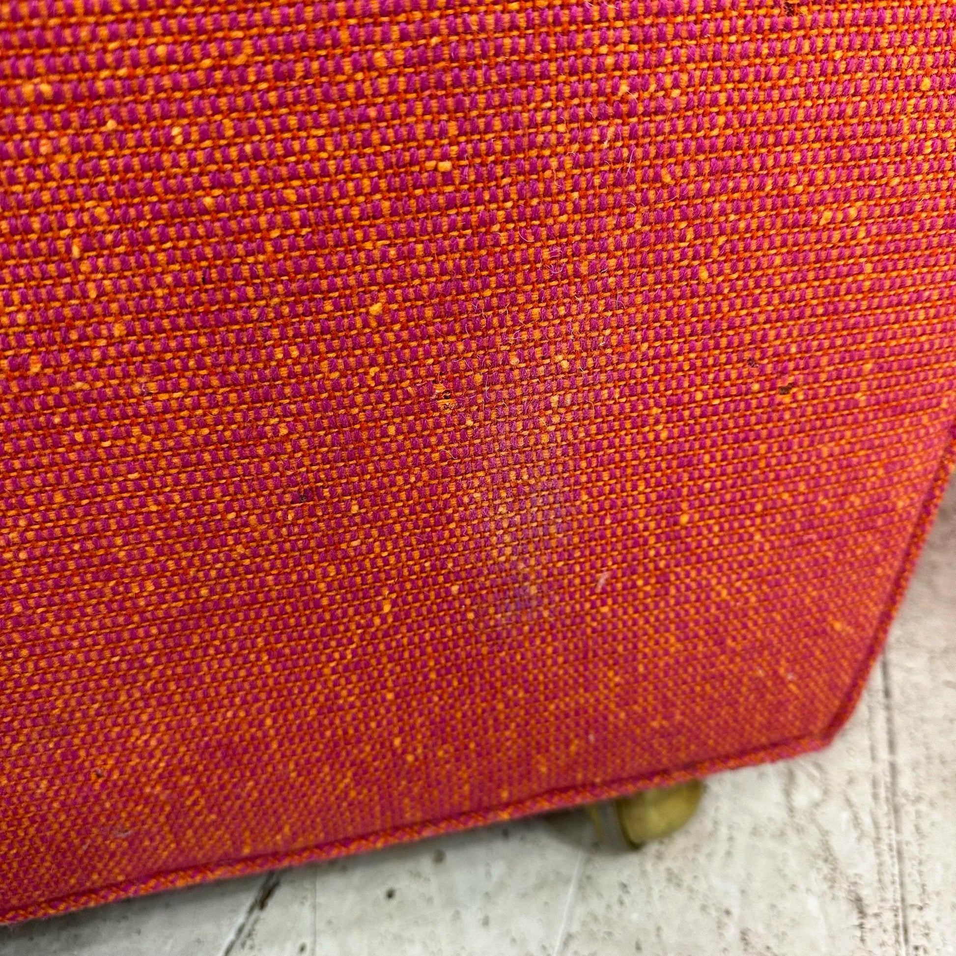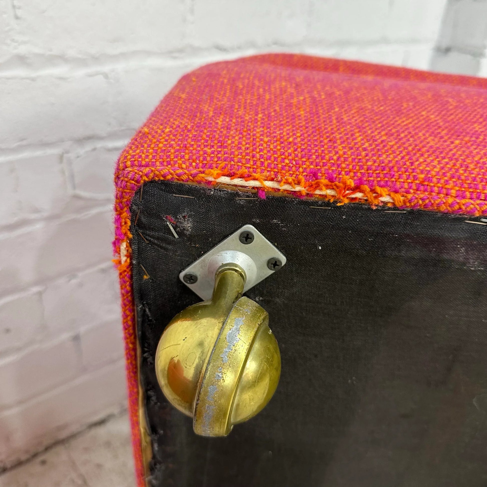 Pair of Dunbar lounge chairs on casters with one ottoman. The fabric has a mix of pink, lighter orange, and dark orange.