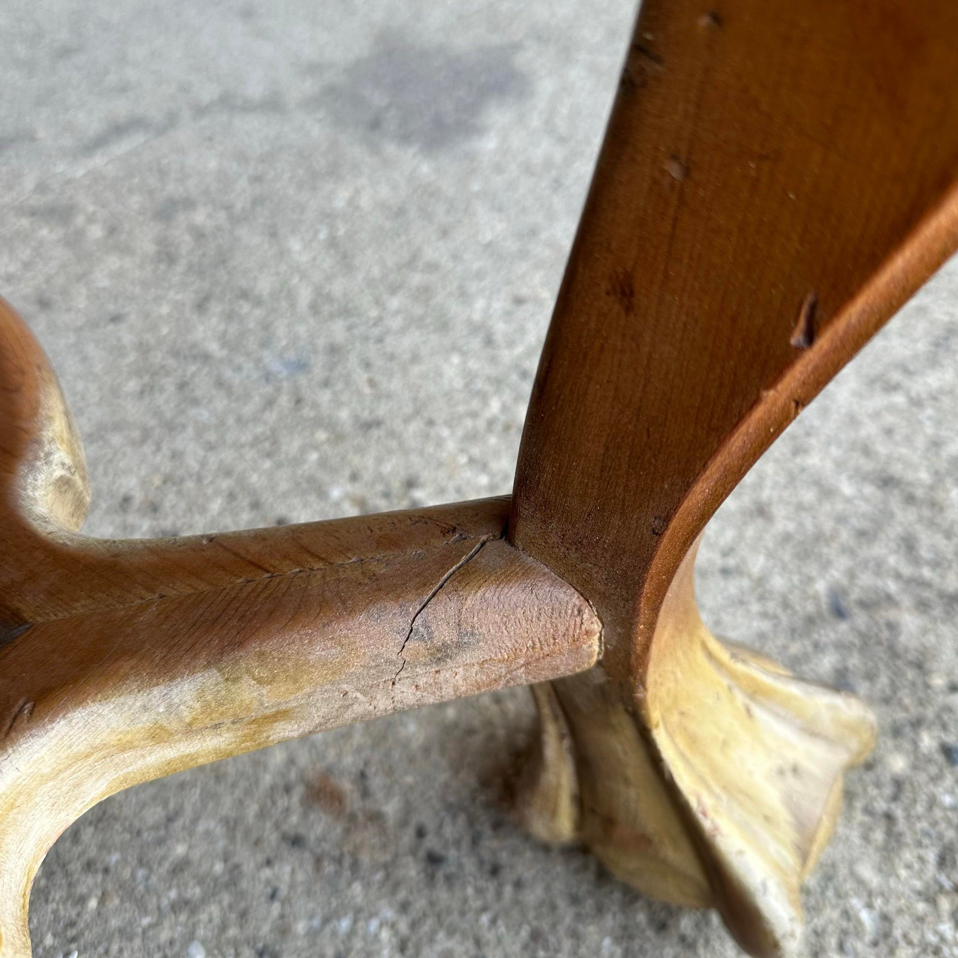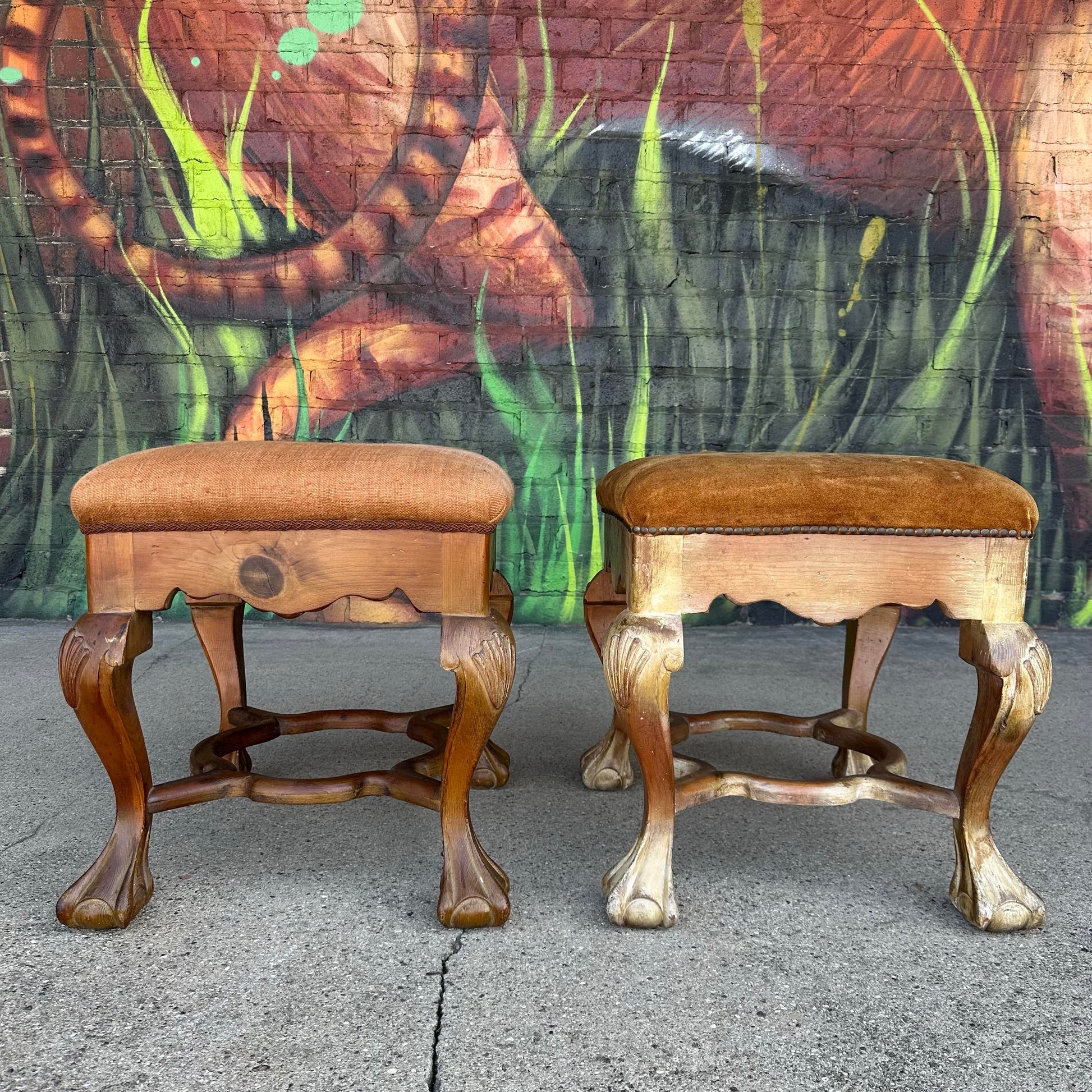 Pair of ottomans by Sarried of Valmazan. These feature claw foot bases with ornate carved details. There is a makers mark on the bottom of the ottoman.