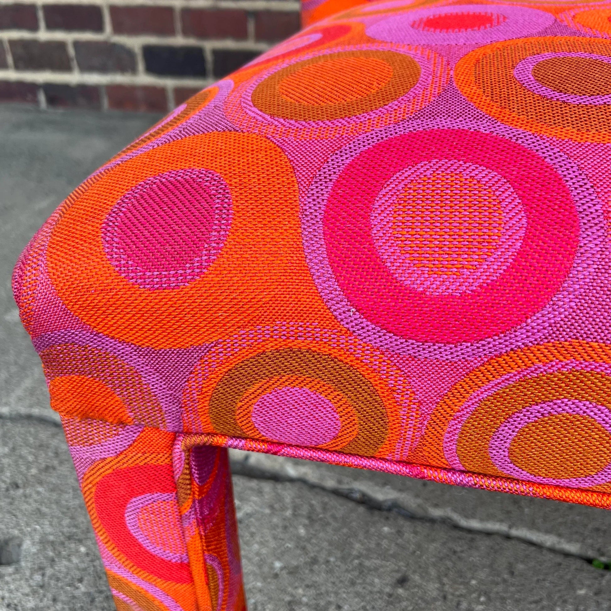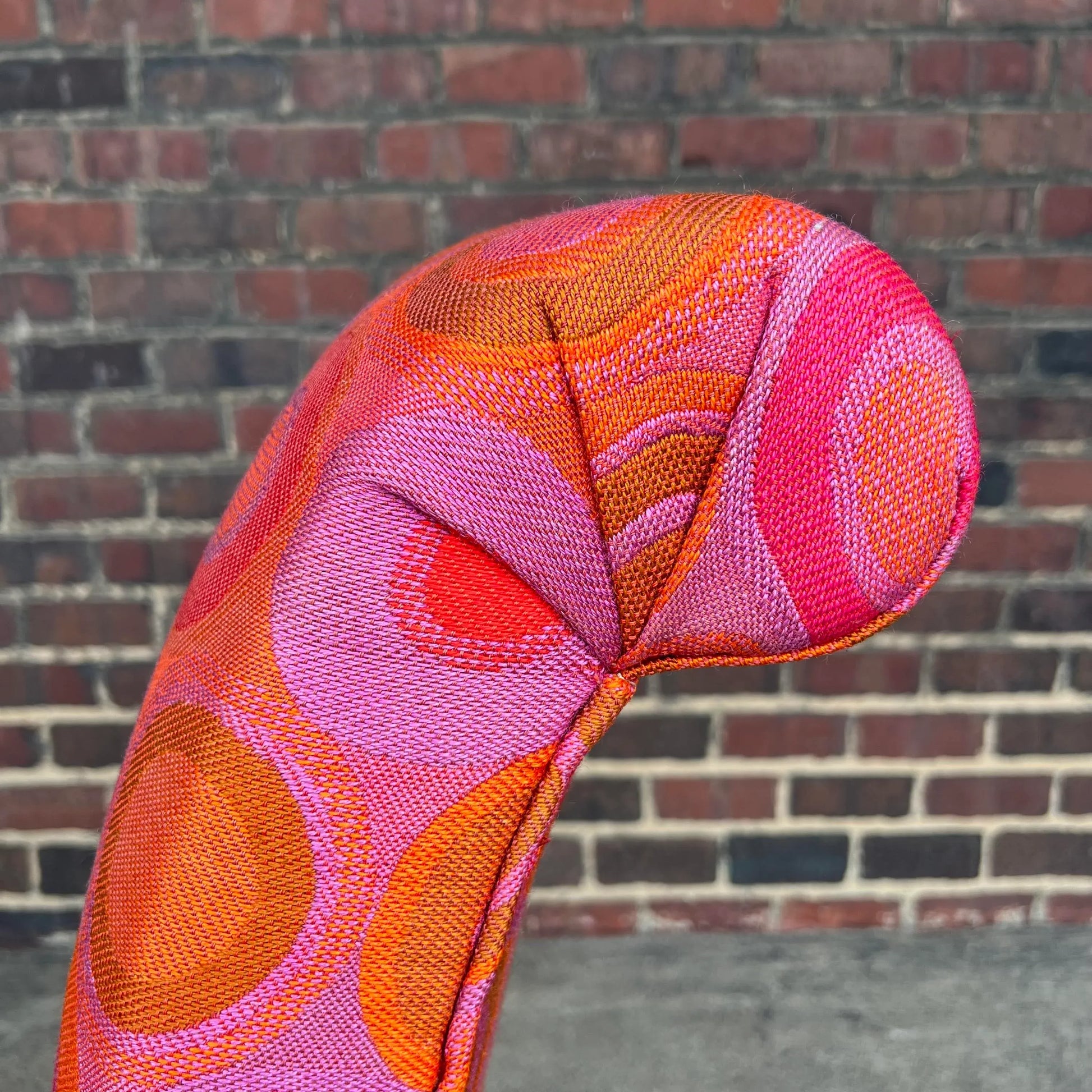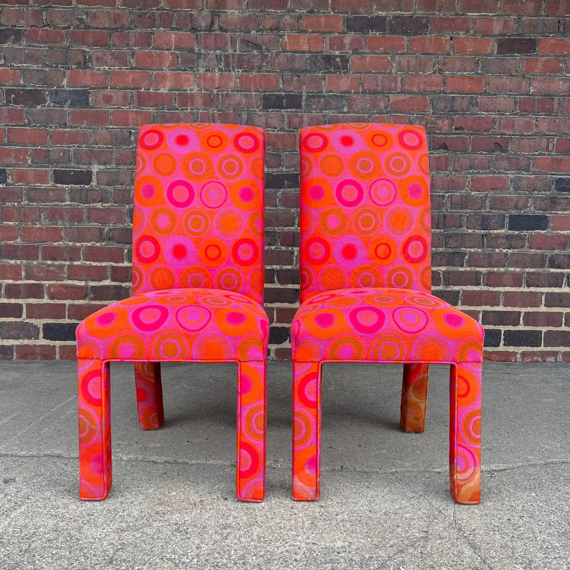Pair of funky tall back chairs in a bright and bold pink fabric with circular details.