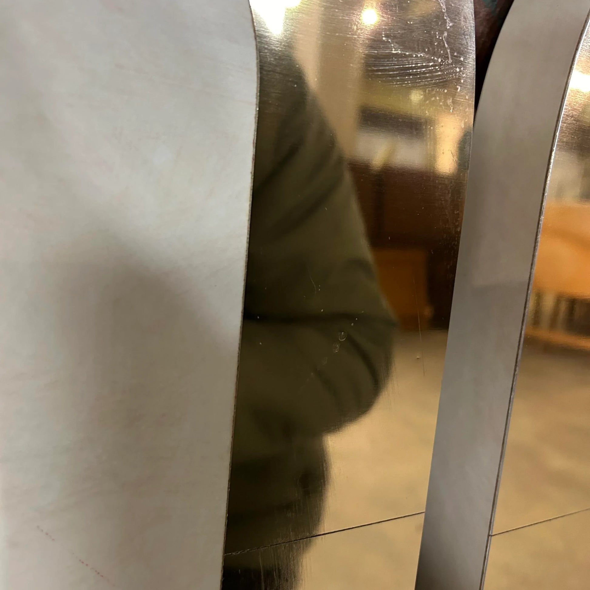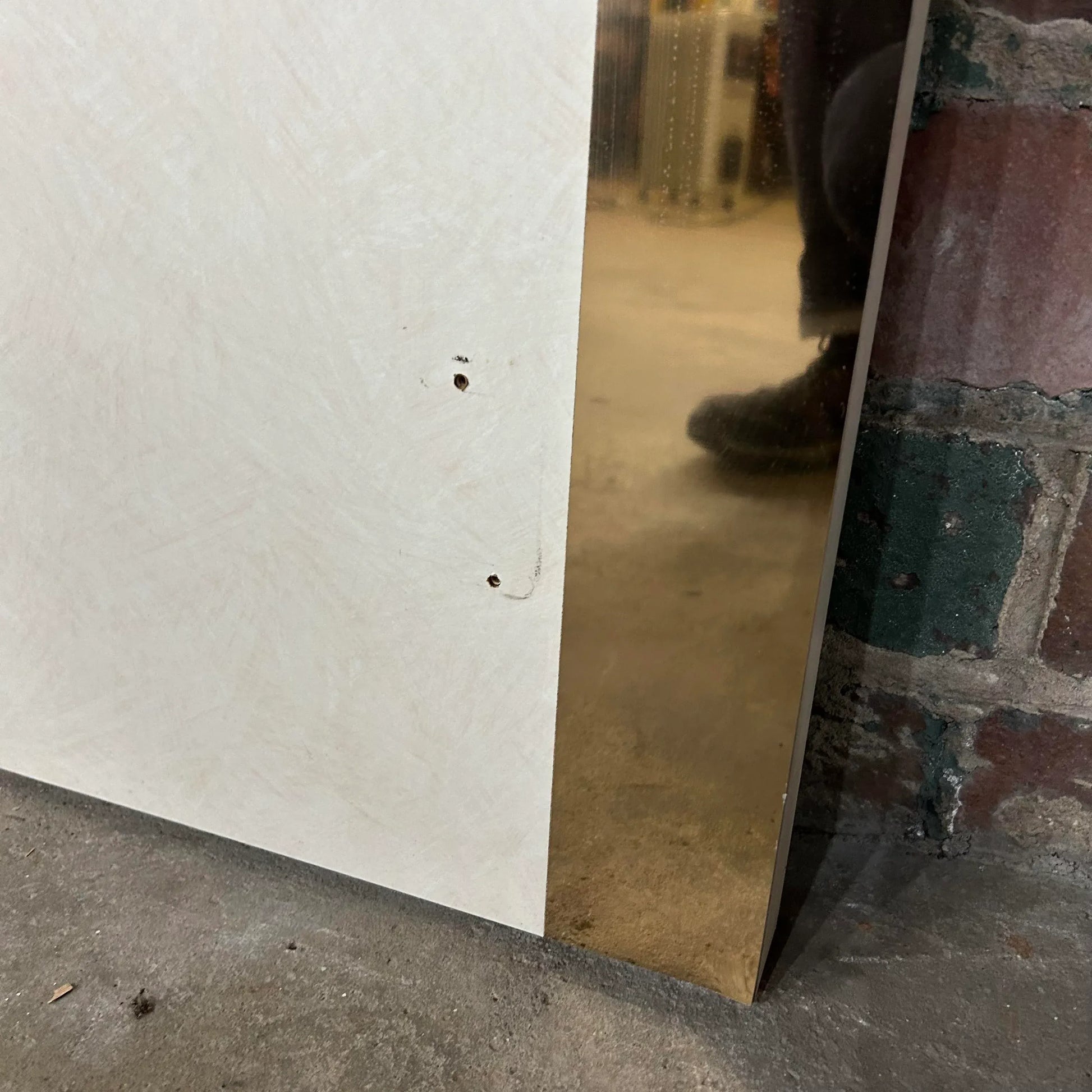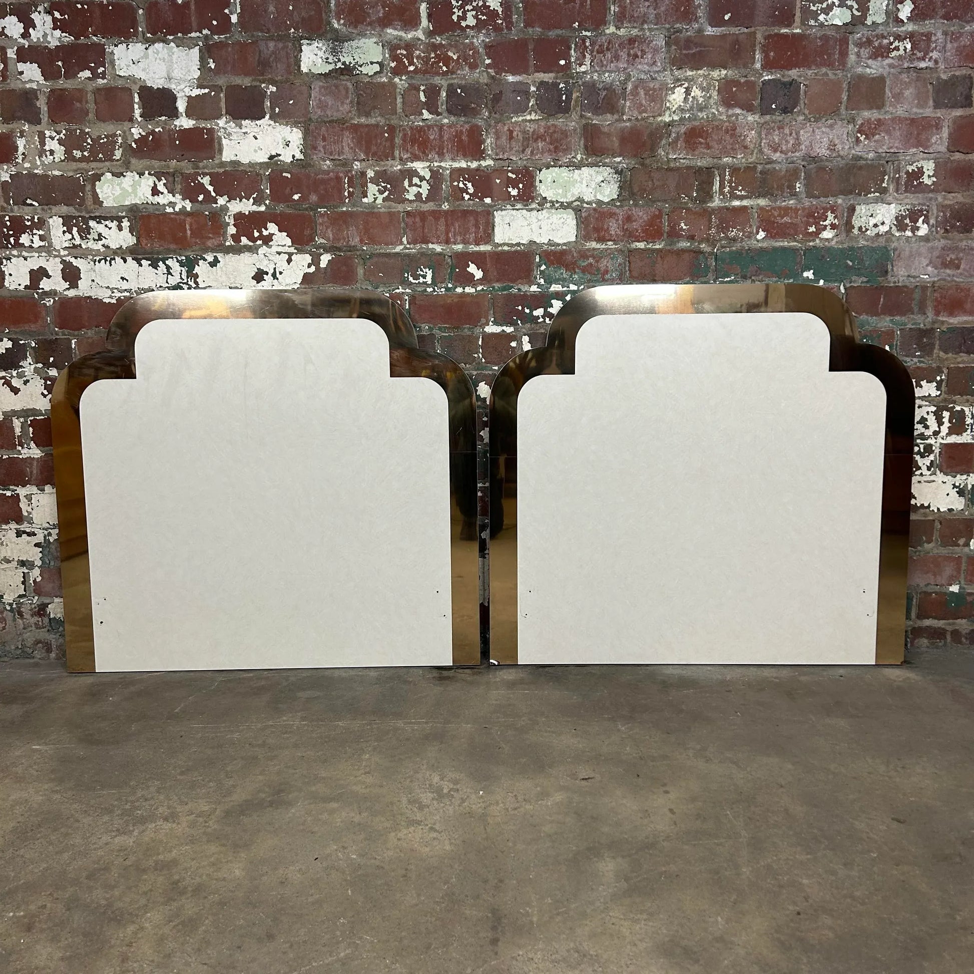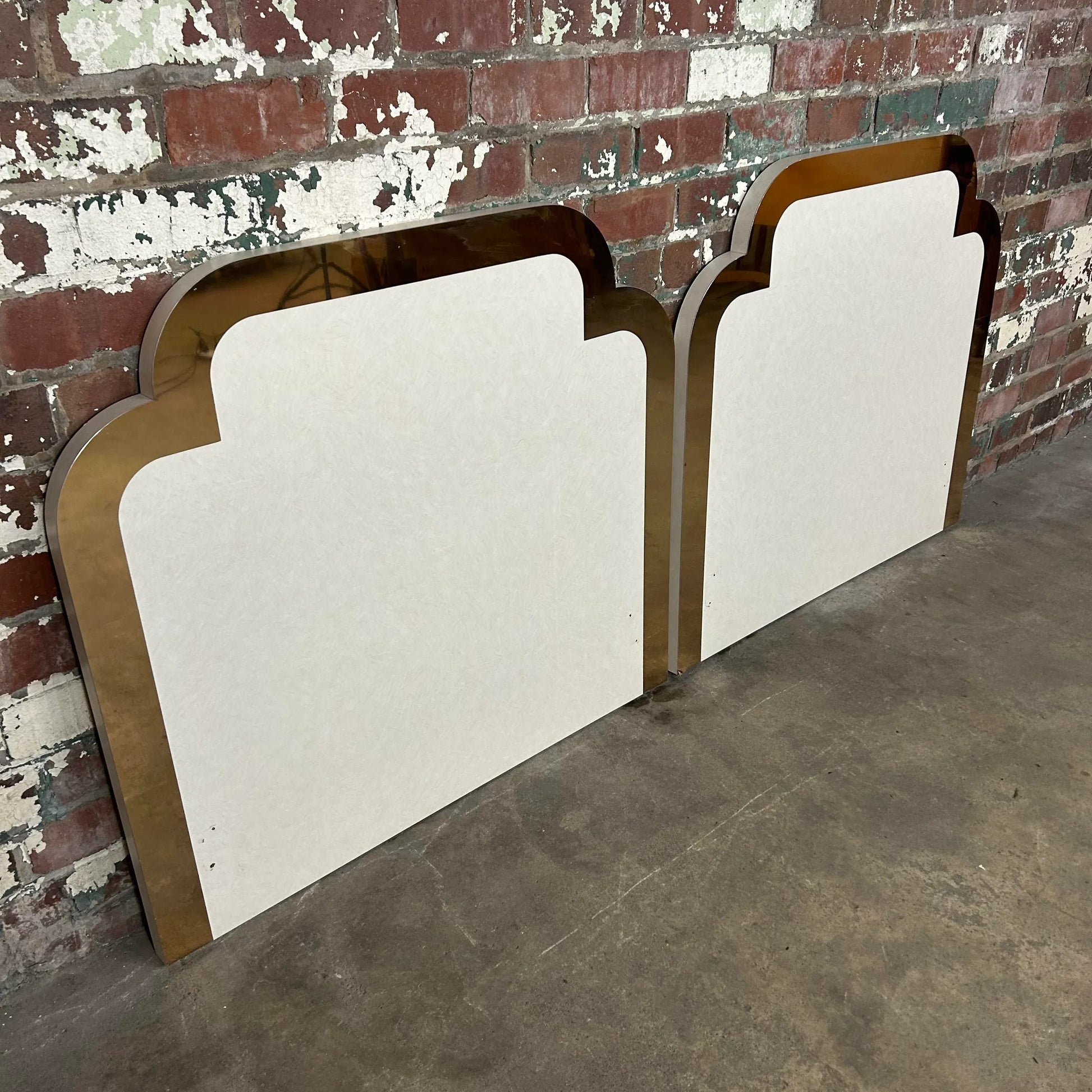 These 1980s cream colored headboards feature classic Moroccan shaped arches with a thick band of reflective rose gold trim.