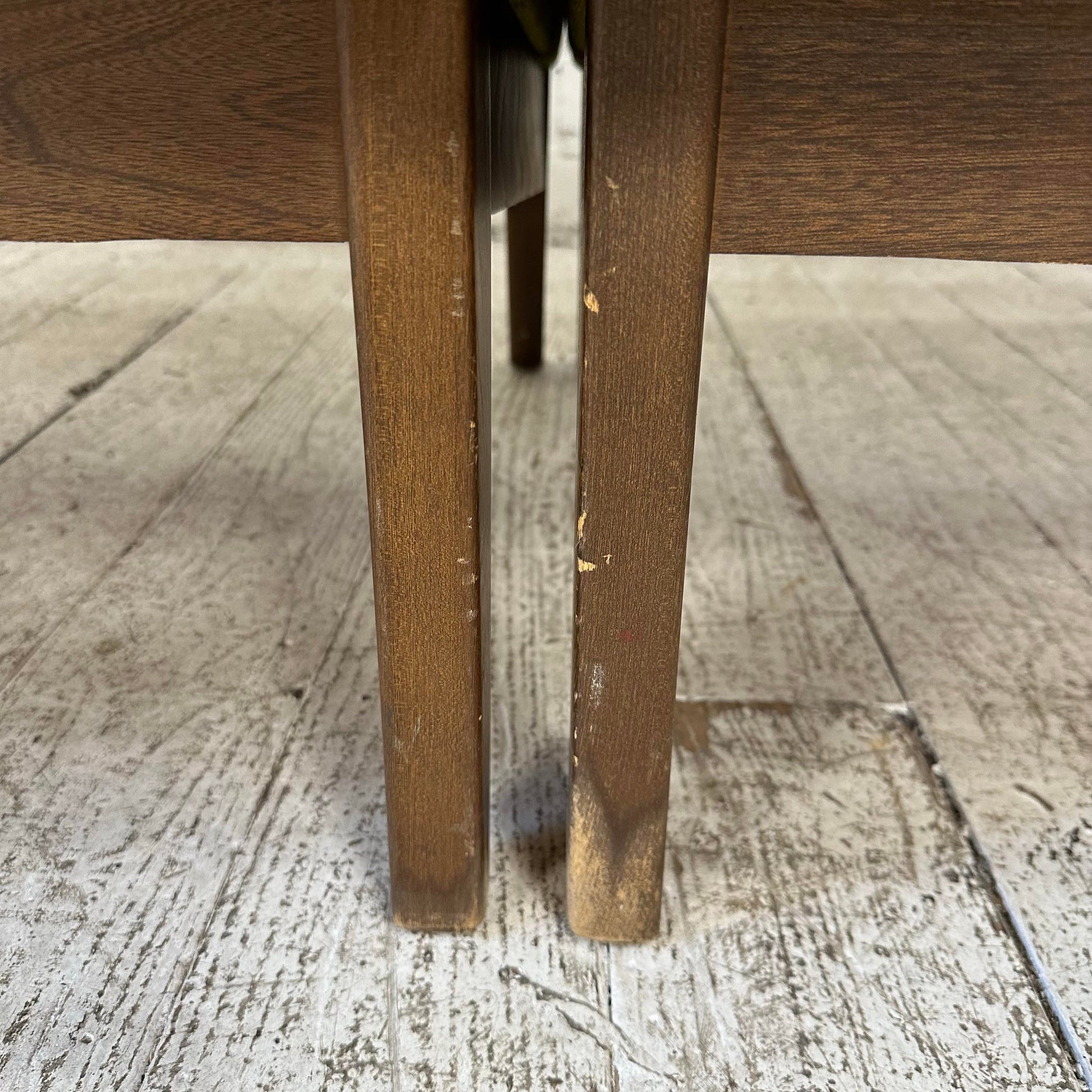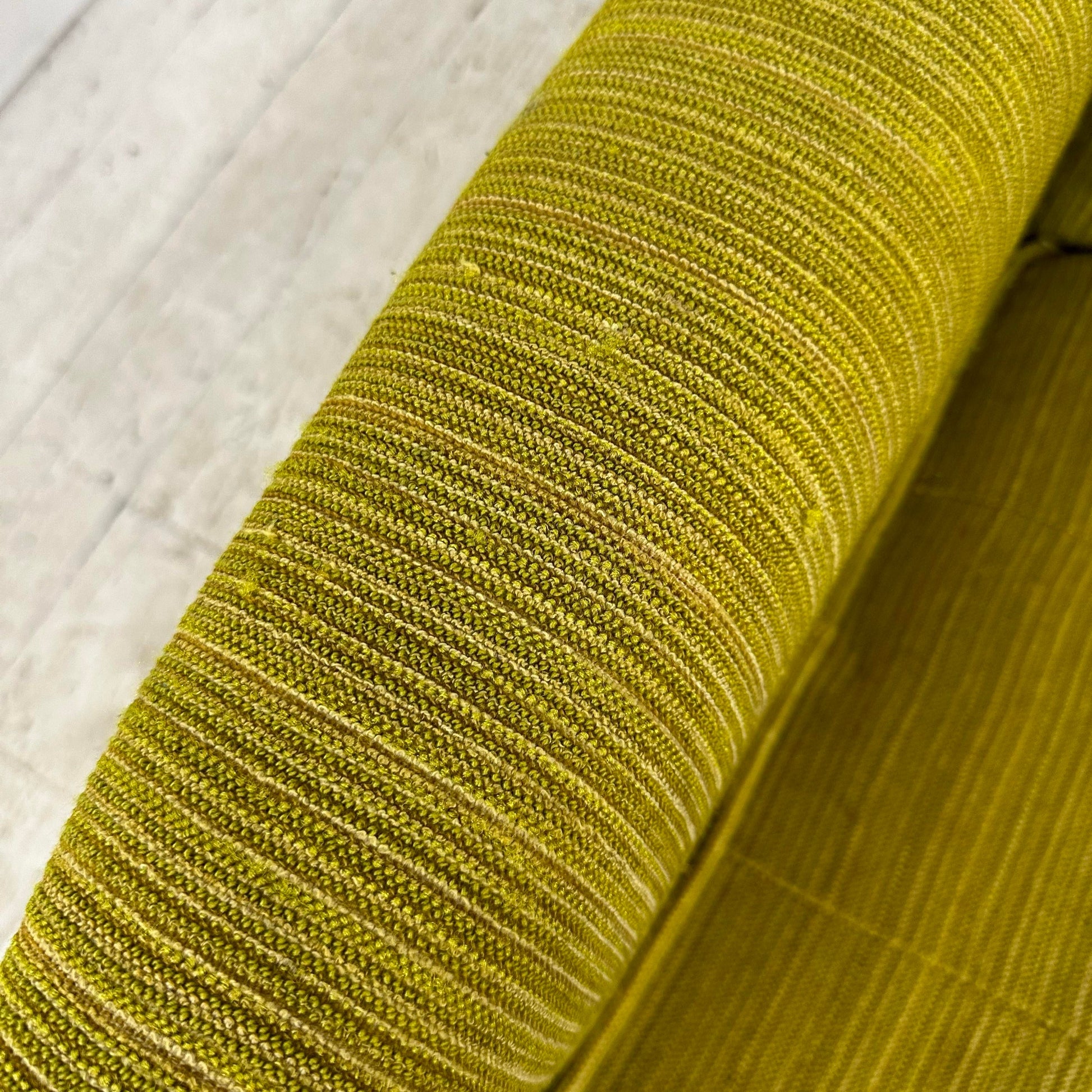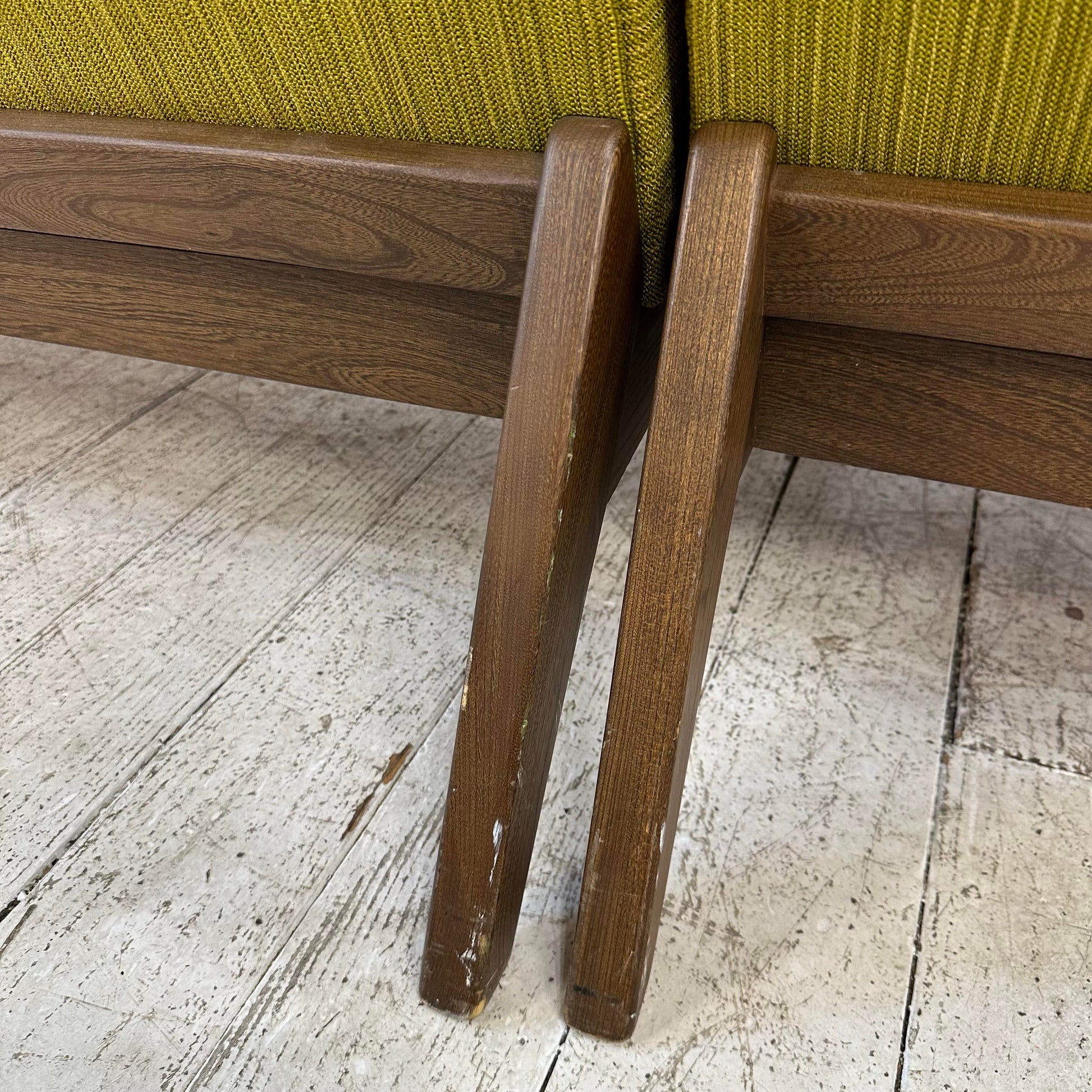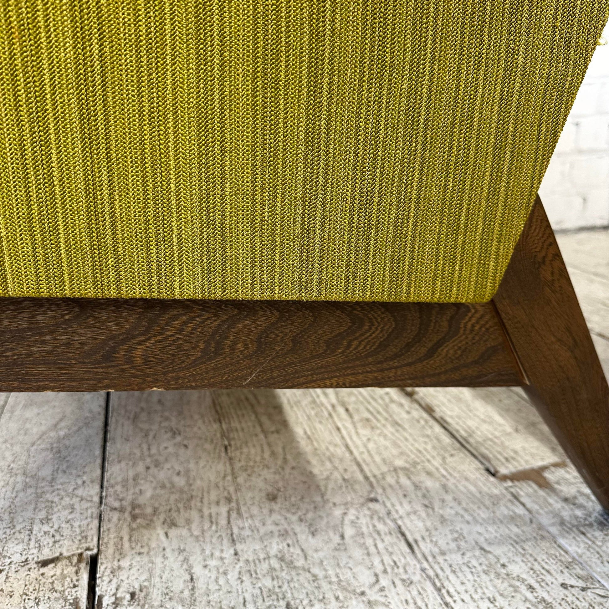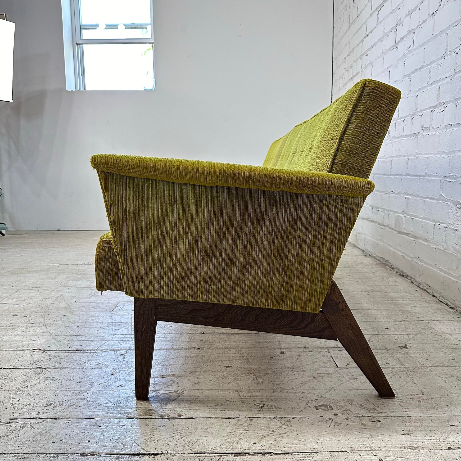 Mid century modern Paoli Chair Company Two Piece Sectional Sofa. This sofa features mid century modern lines with a touch of traditional. The fabric is a lime green color with walnut color wooden legs. There is a makers mark on the bottom of the sofa.