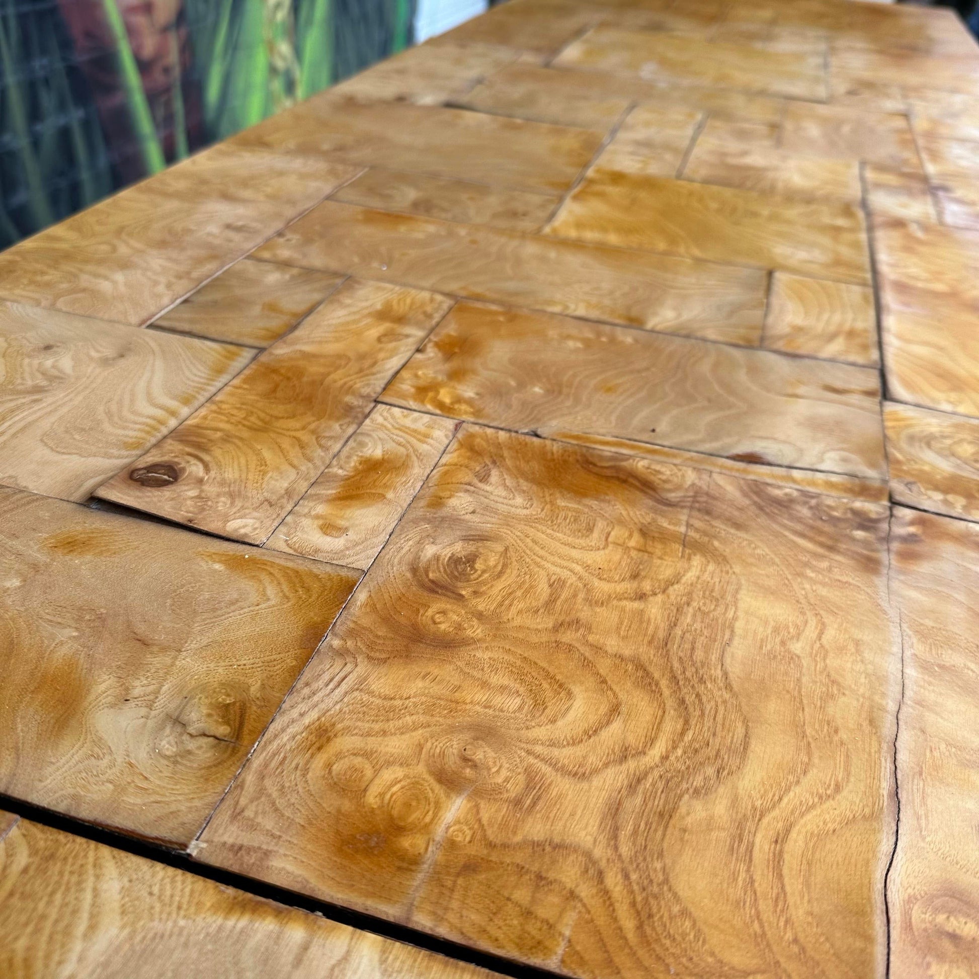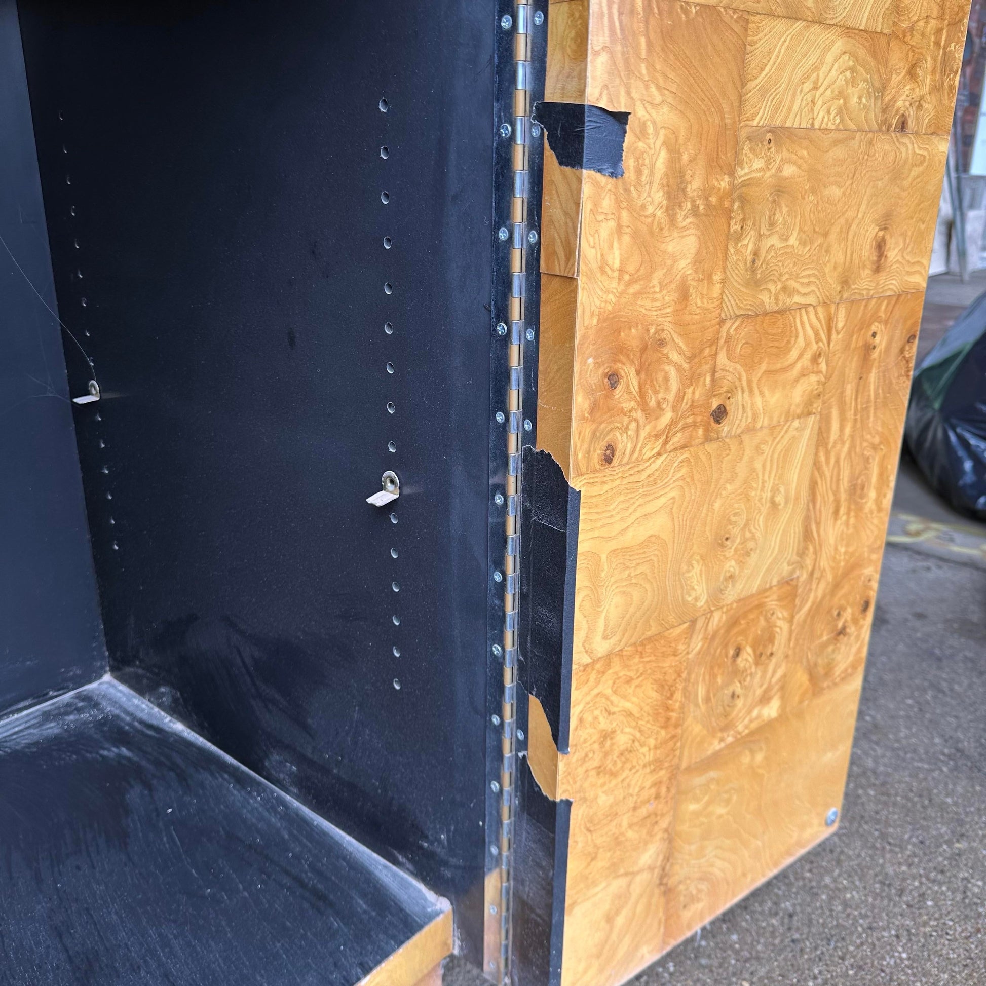 This mid century modern Paul Evans credenza features patchwork-style Burl wood veneer with beautiful wood grain and chrome detailing throughout. The top left and front doors all open for storage needs. The storage sections below are missing the adjustable height shelves. No makers mark.