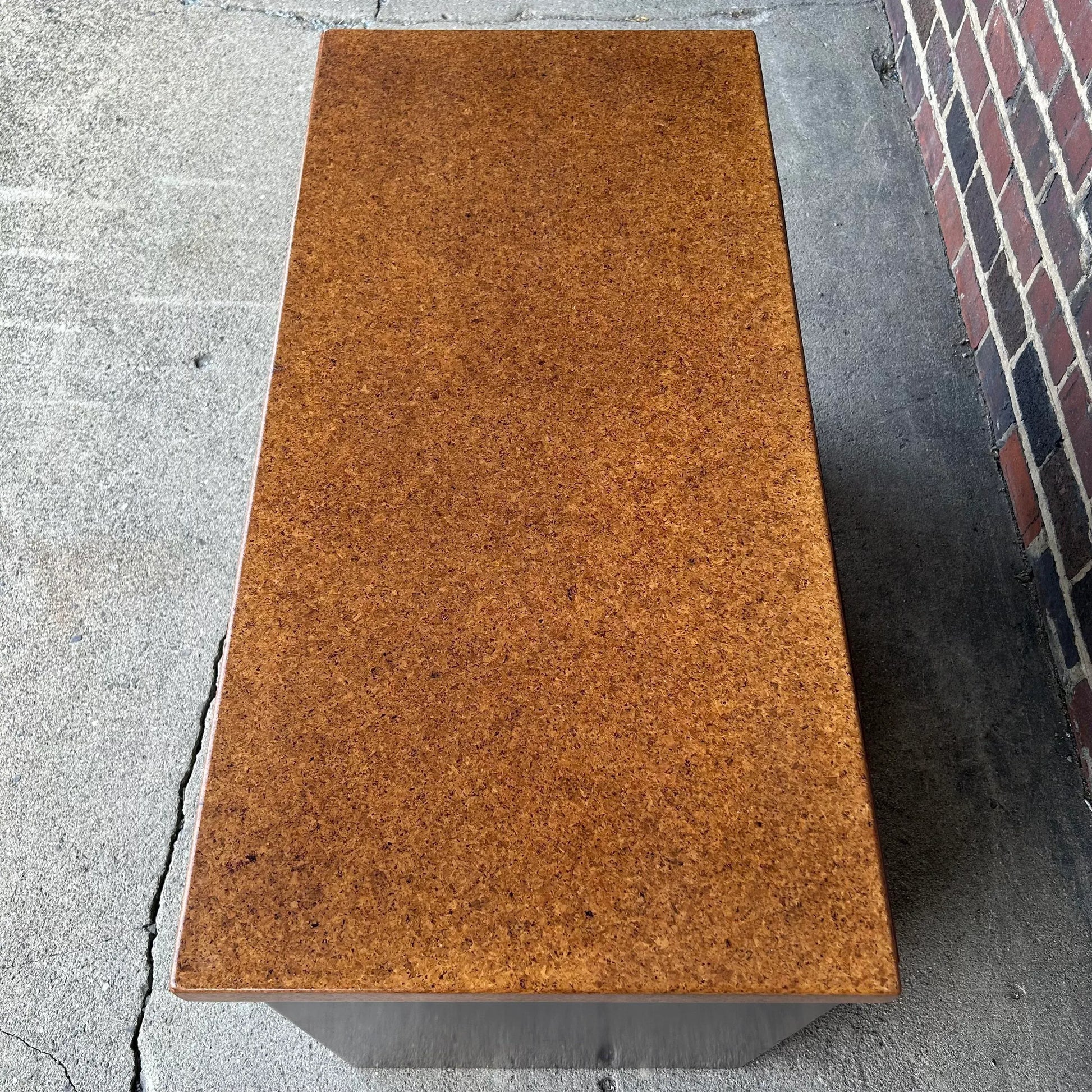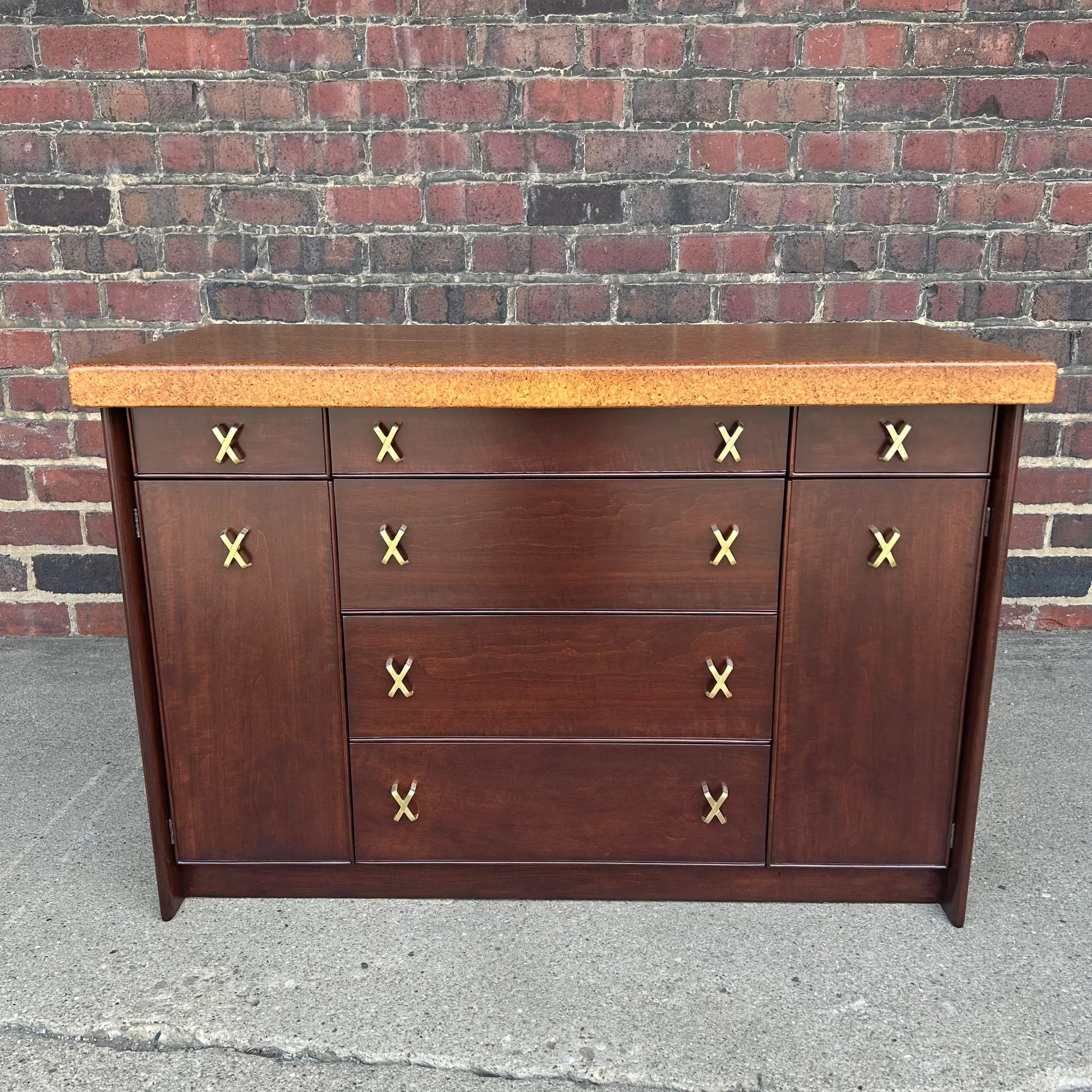 Fully refinished cork top credenza with brass X pulls by Paul Frankl for Johnson Furniture.
