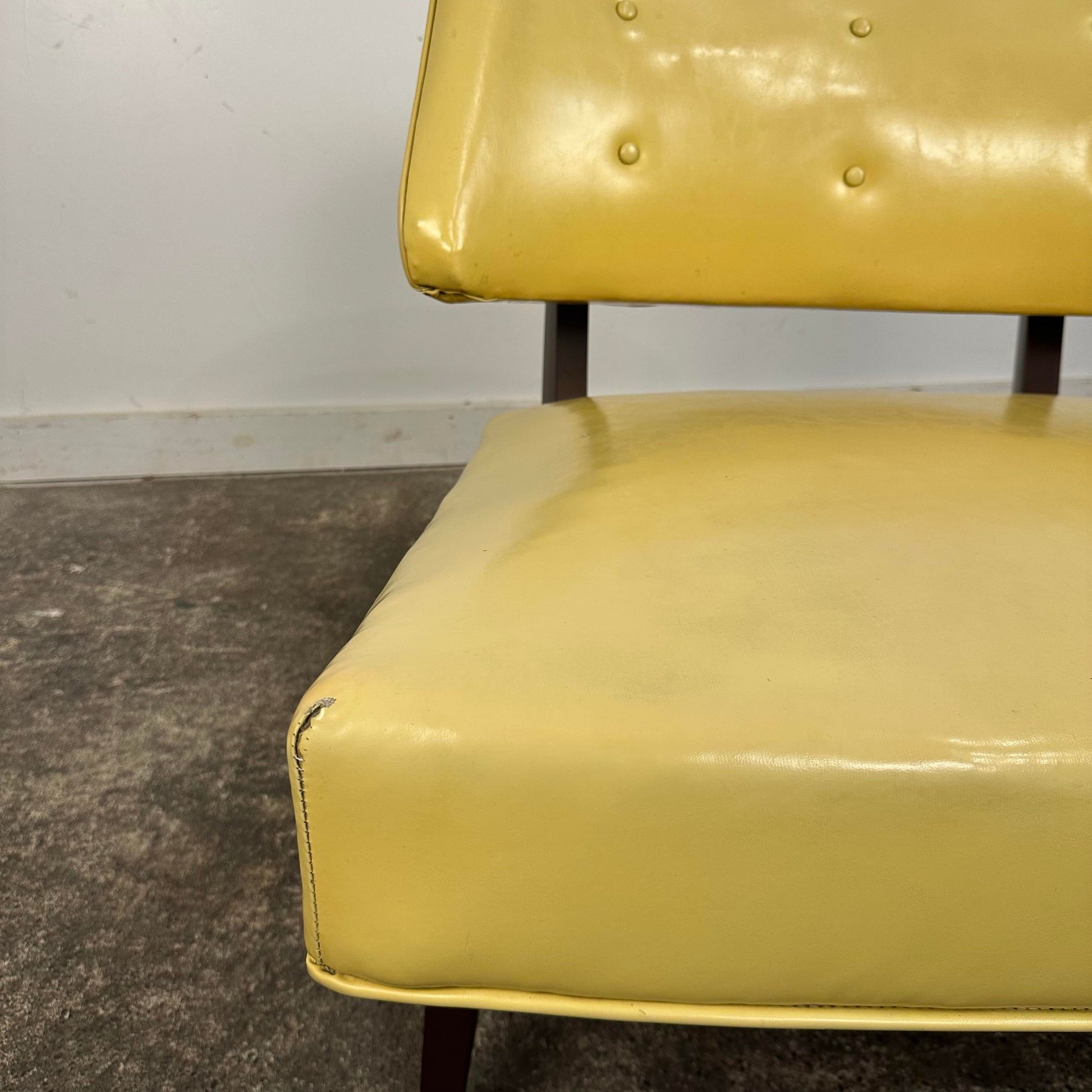 Slipper lounge chair by Paul Laszlo. This piece is currently covered in a butter yellow vinyl with a dark brown wooden frame.