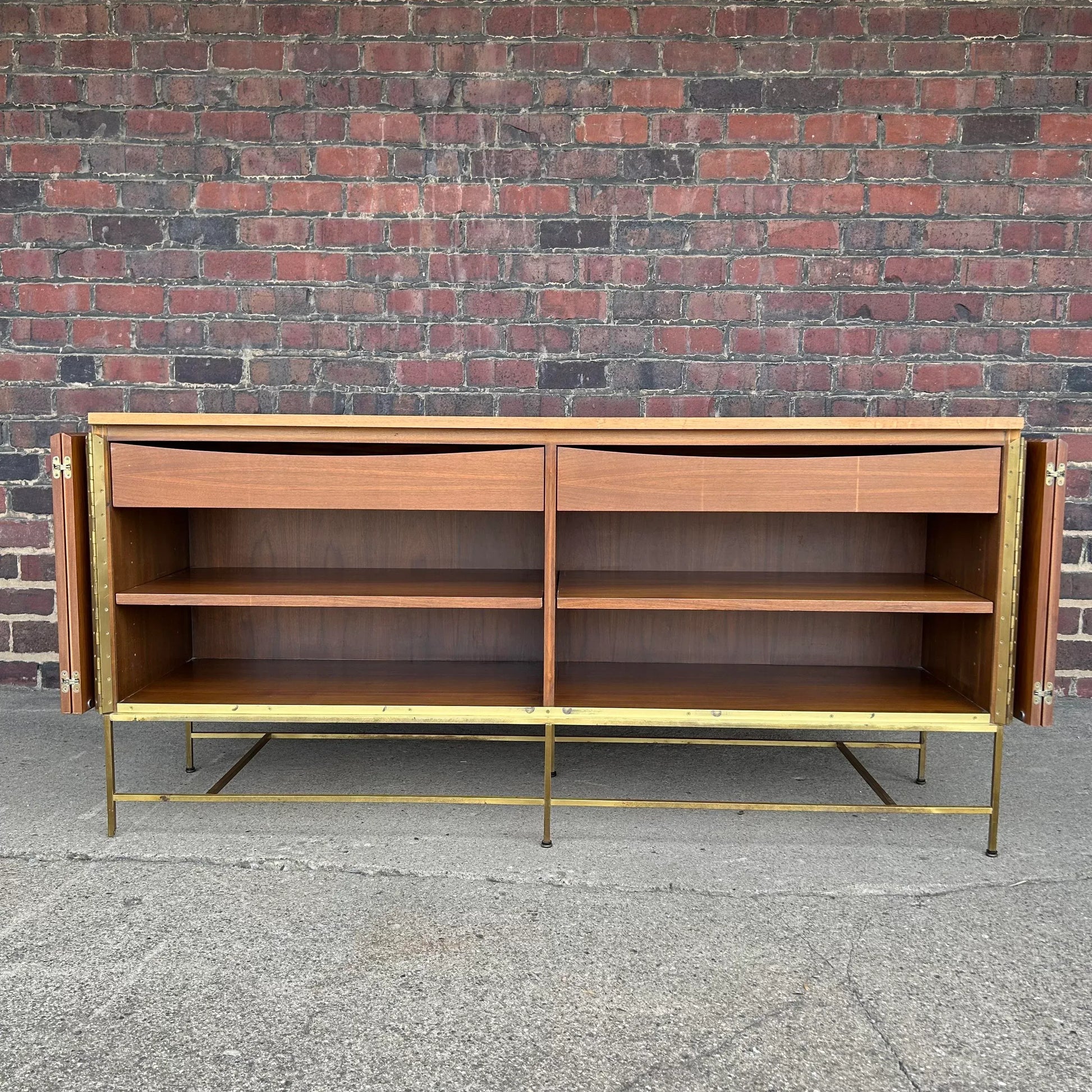 This Paul McCobb credenza has thin and elegant brass stretchers and legs. The trifold doors open up to two drawers and adjustable shelves.