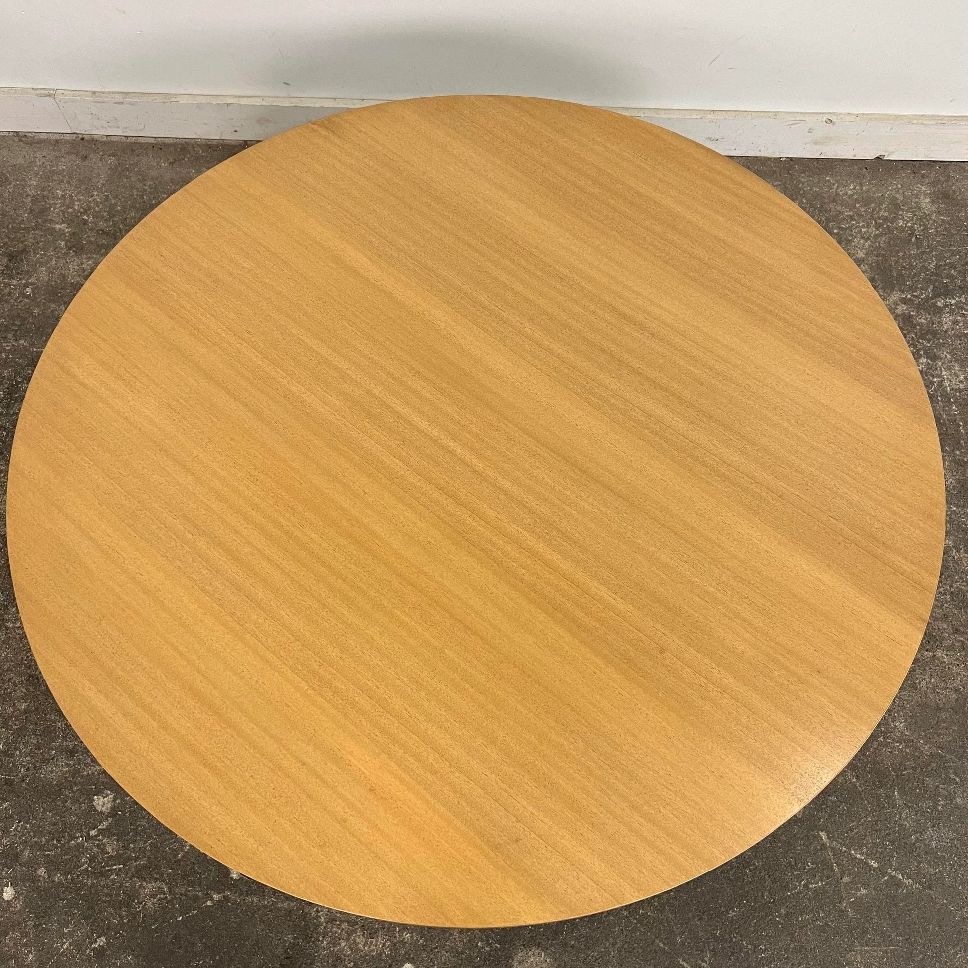 Blonde mahogany circular coffee table designed by Paul McCobb with chrome stretcher bars underneath table top. This piece has been professionally refinished.