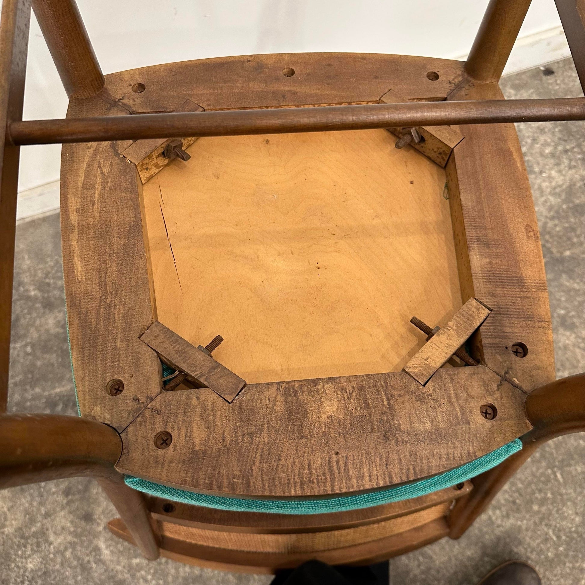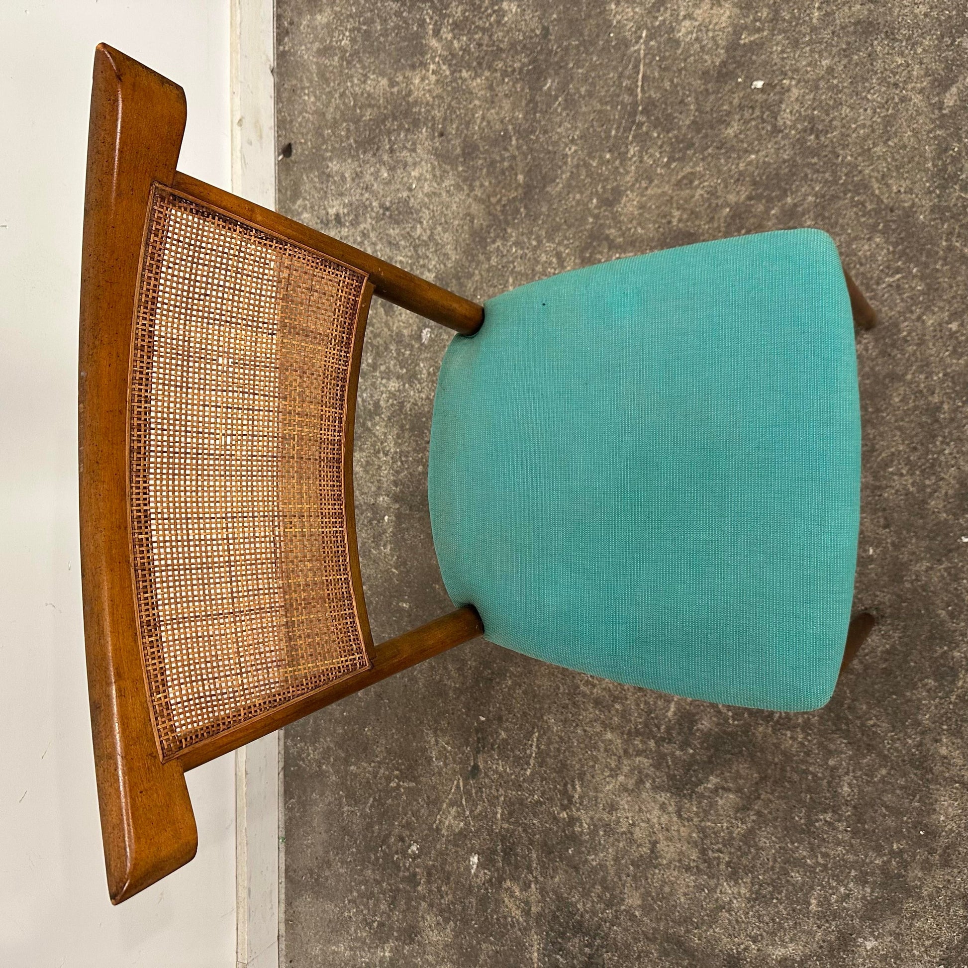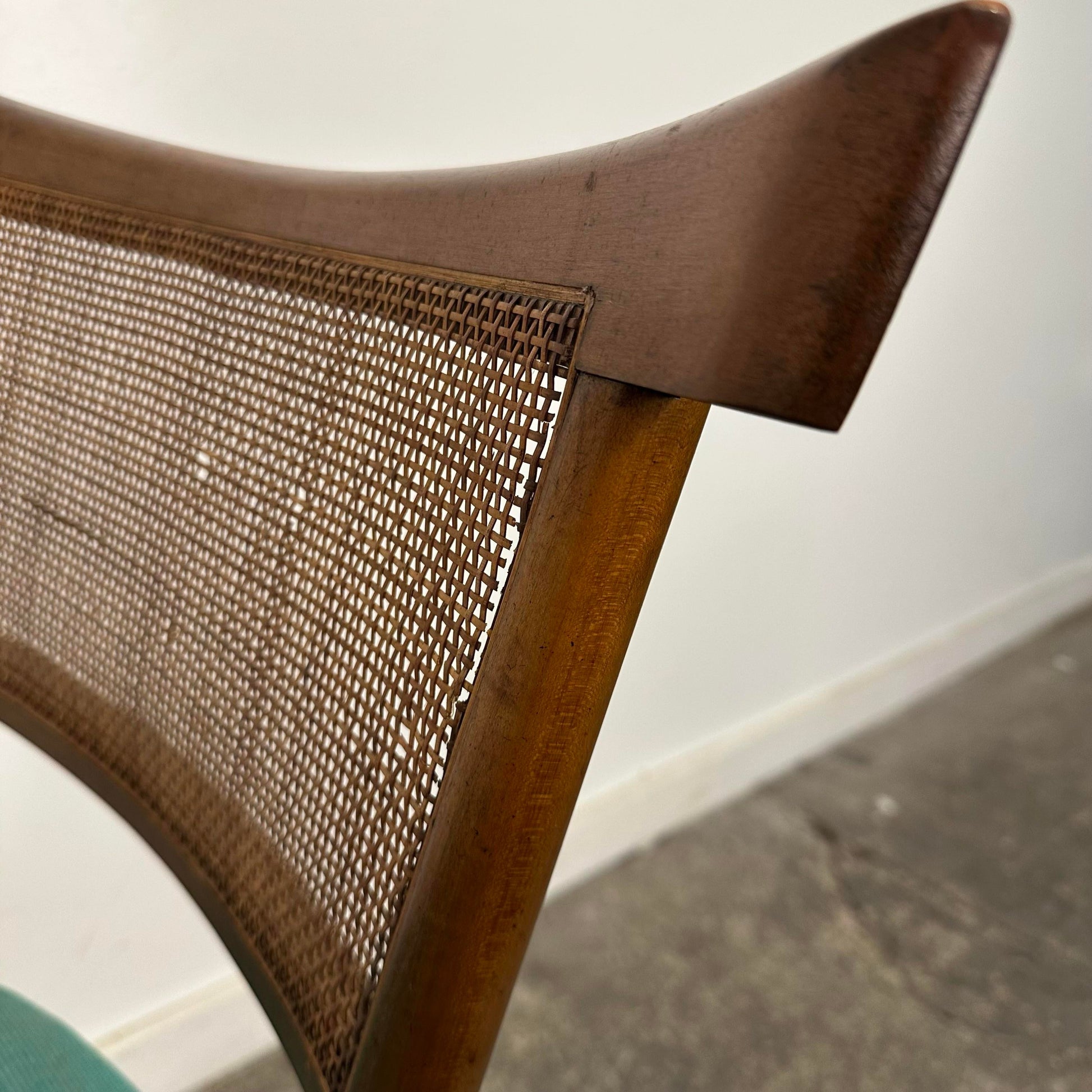 Paul McCobb for Planner Group single dining chair. This mid-century modern chair features a caned backrest and a maple wood base. The seat is currently covered in a teal fabric. Chair is unmarked.