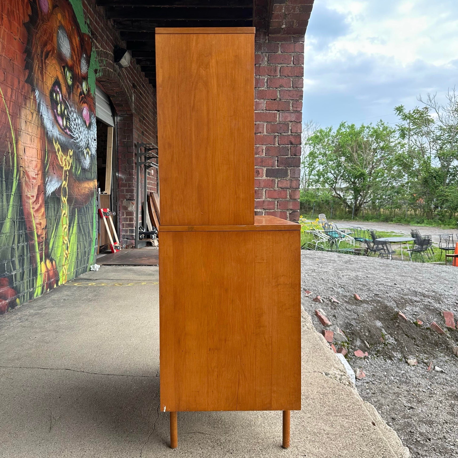 This vintage, Mid-Century hutch was designed by Paul McCobb for Planner Group. It is two pieces and has two sliding doors on the bottom and two glass sliding doors on the top with adjustable shelves in both to make storing or displaying your items easy.
