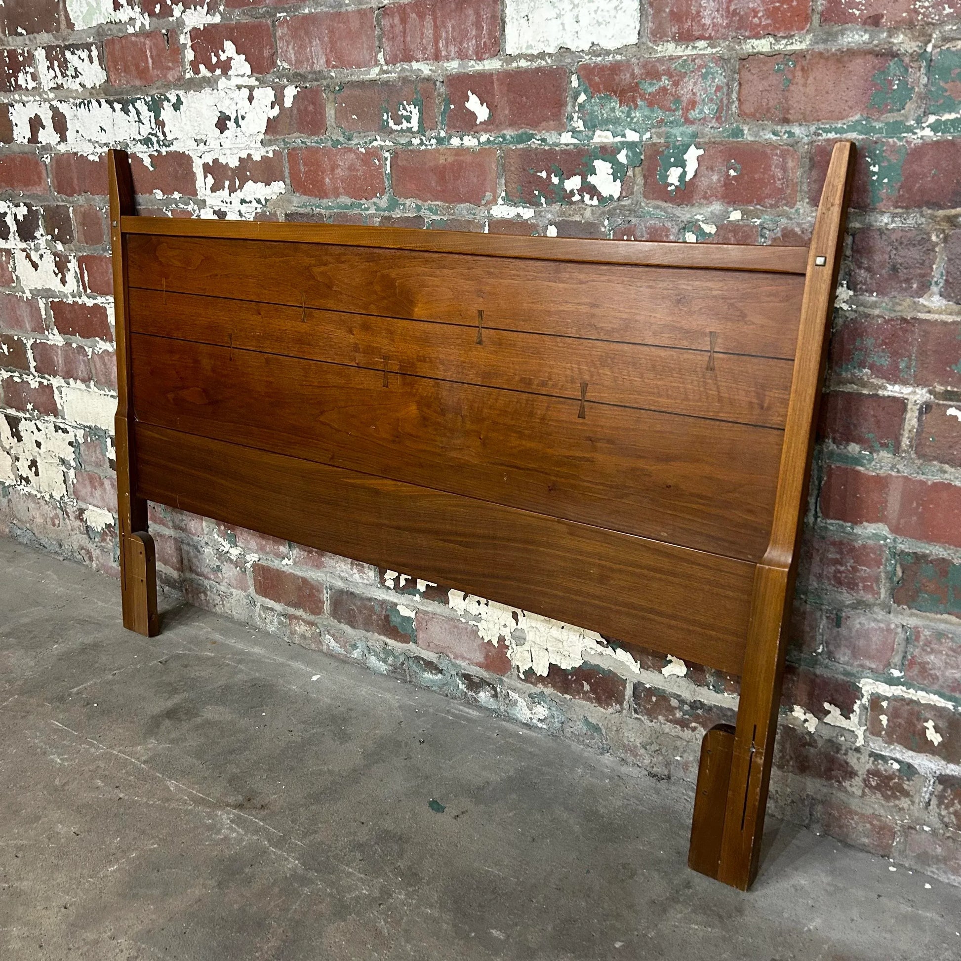 Mid-century modern full size headboard designed for Lane. This piece has the distinctive “bow tie” design. The “bow ties” are crafted of rosewood and inlayed into walnut creating an elevated and elegant juxtaposition. This piece has beautiful long lines and two tall, tapered horns adorned with brass detailing.