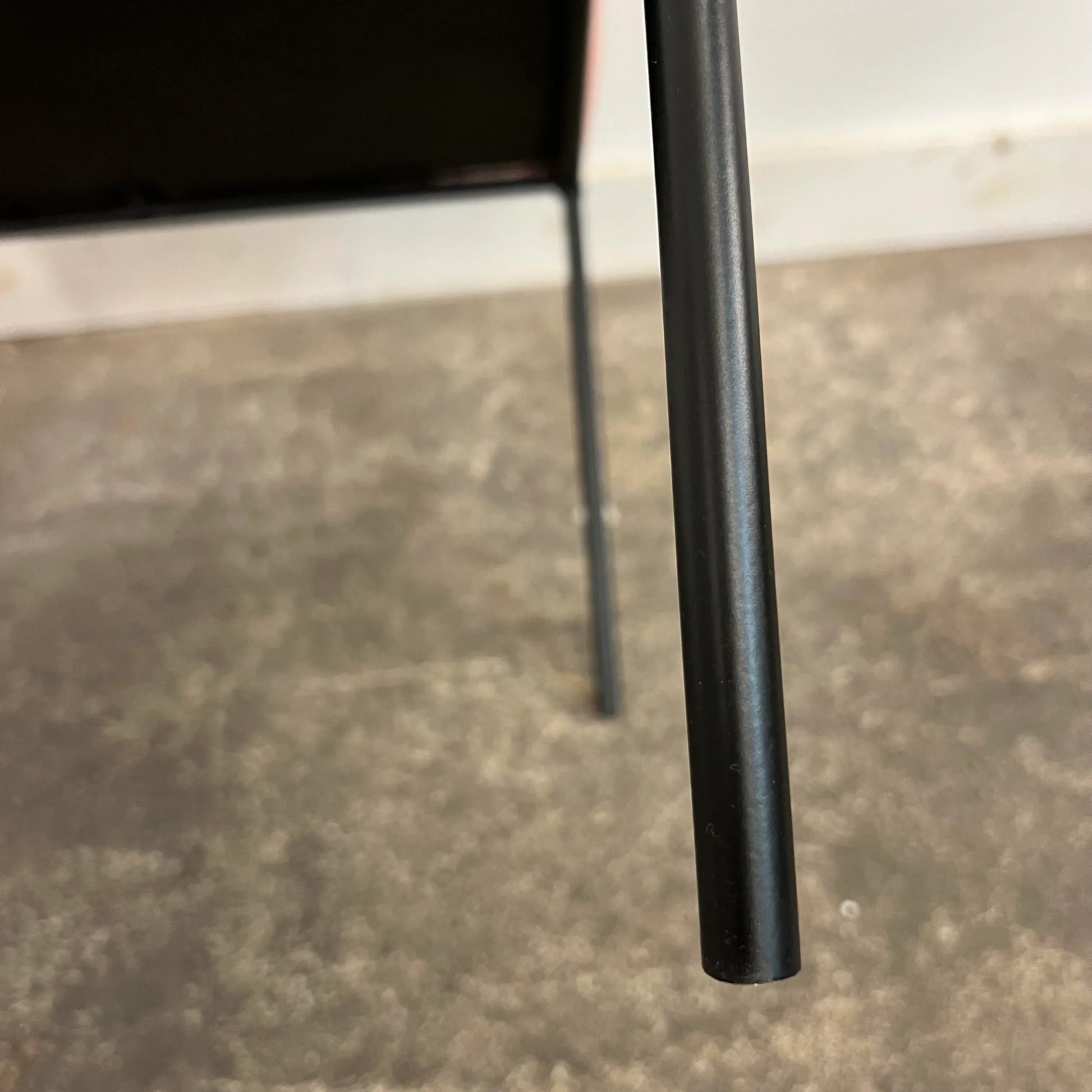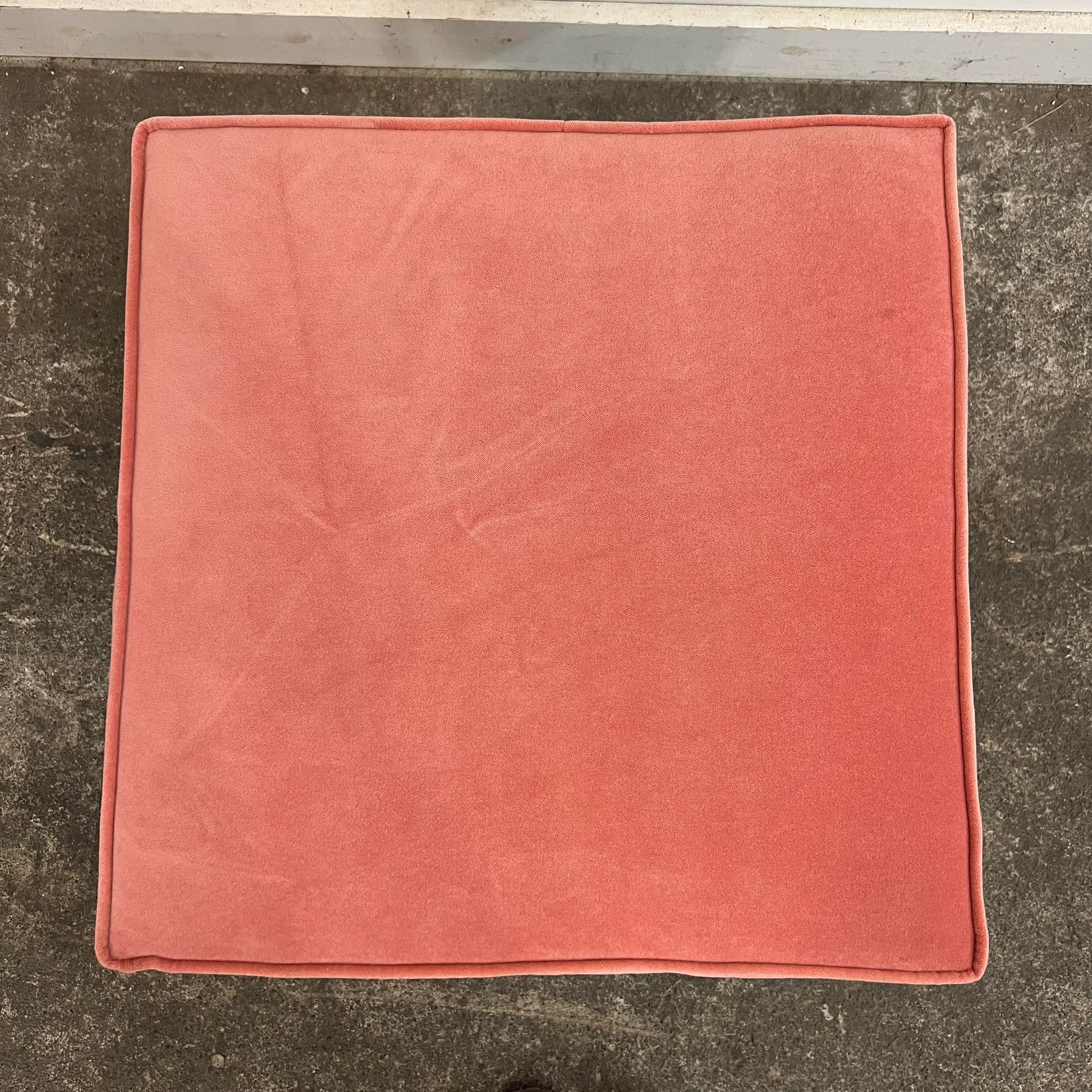 Ottoman/stool styled after a design by Paul McCobb. This piece has a black iron base and was covered in a pink velvet fabric.