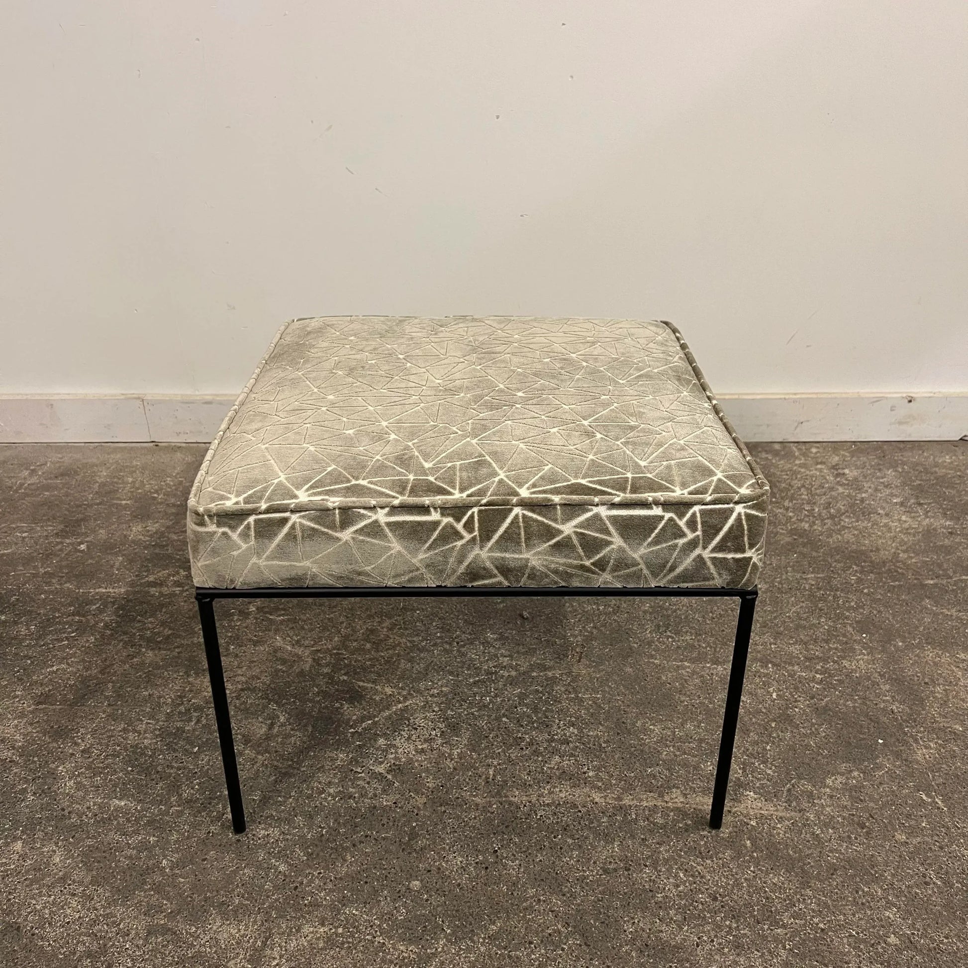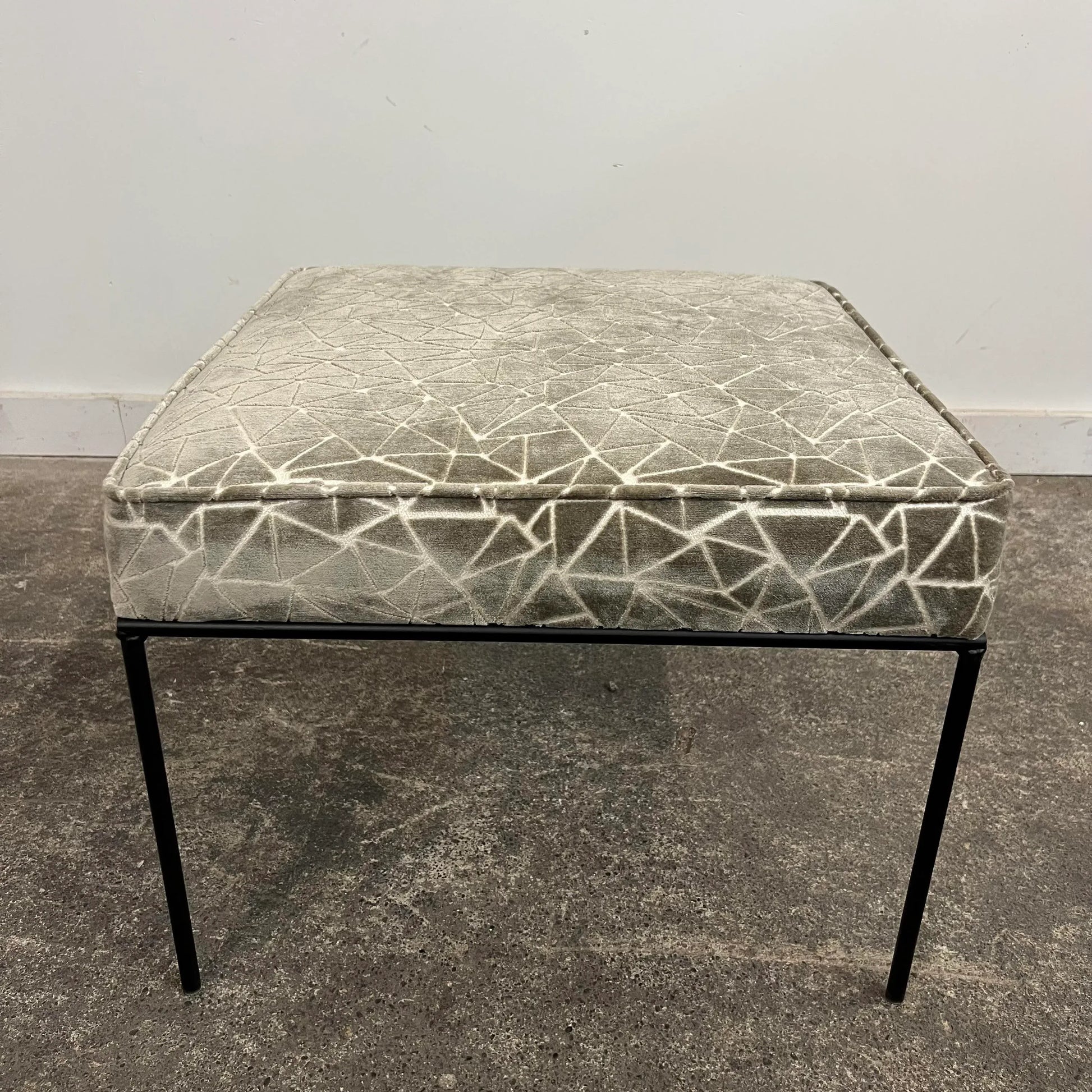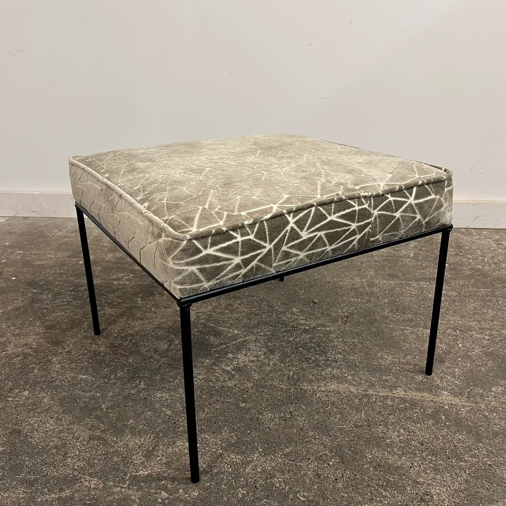 Ottoman/stool based off a design by Paul McCobb. This piece has an iron base and was covered in a grey and white velvet fabric that features a geometric pattern.