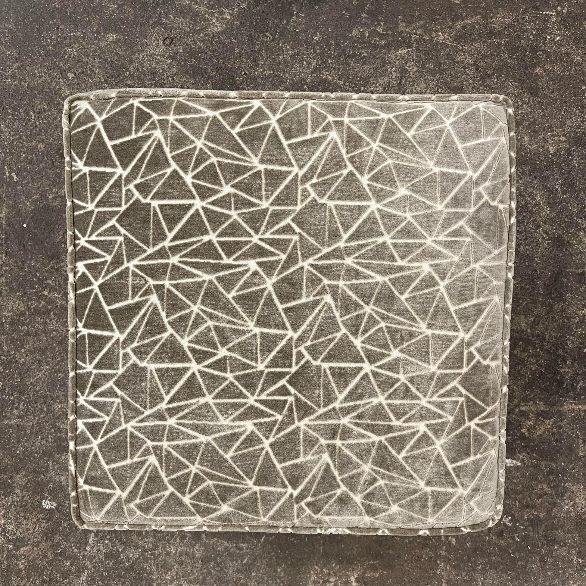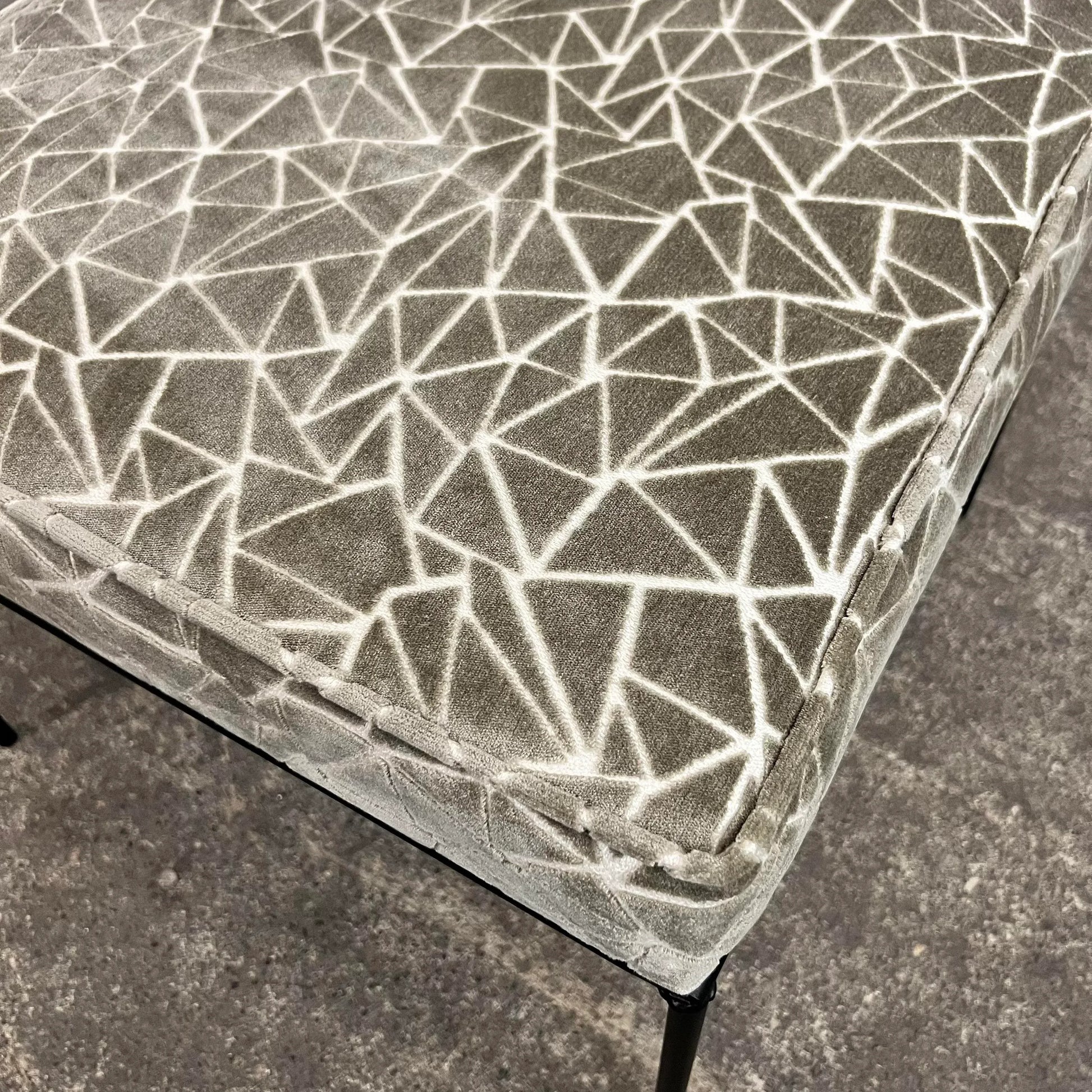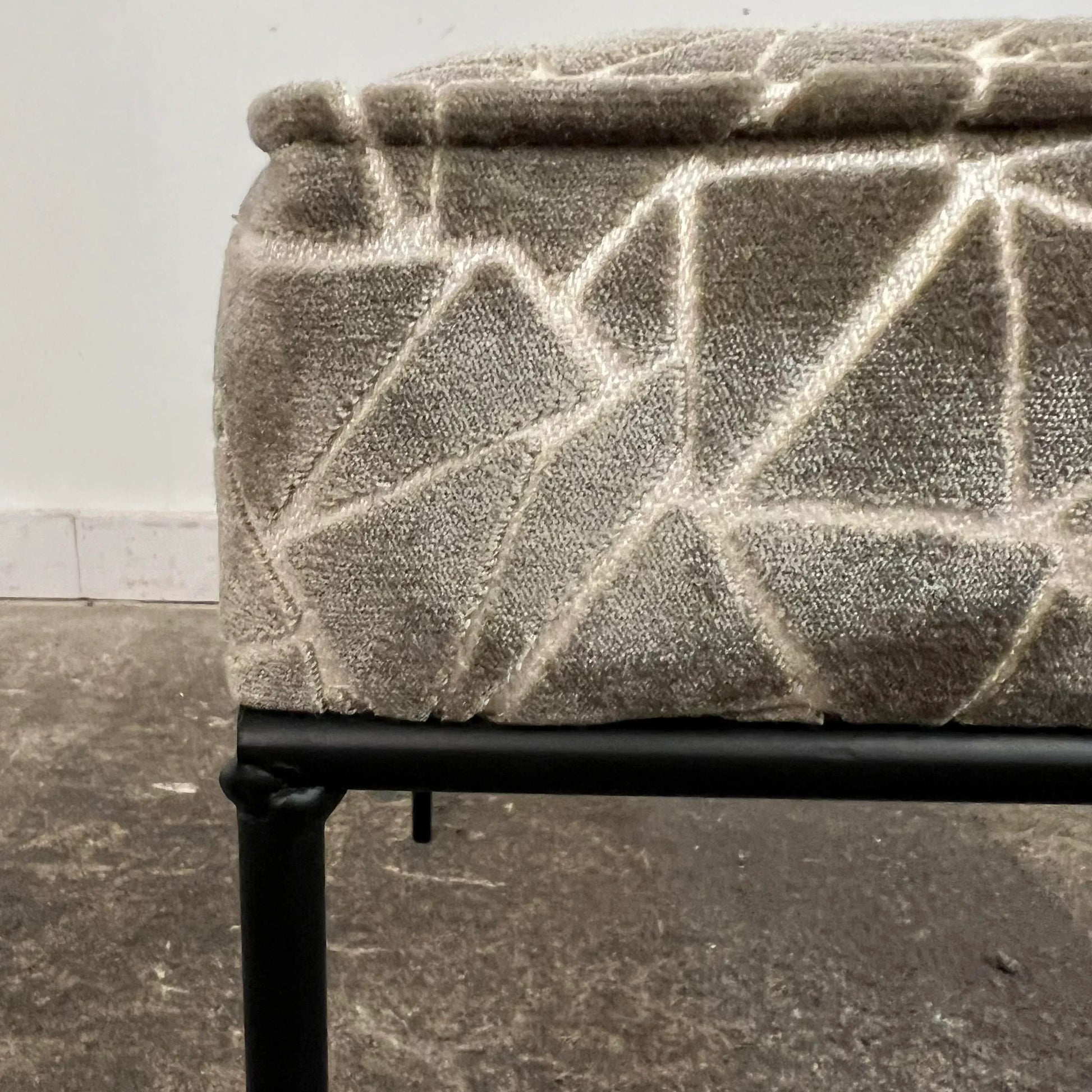 Ottoman/stool based off a design by Paul McCobb. This piece has an iron base and was covered in a grey and white velvet fabric that features a geometric pattern.