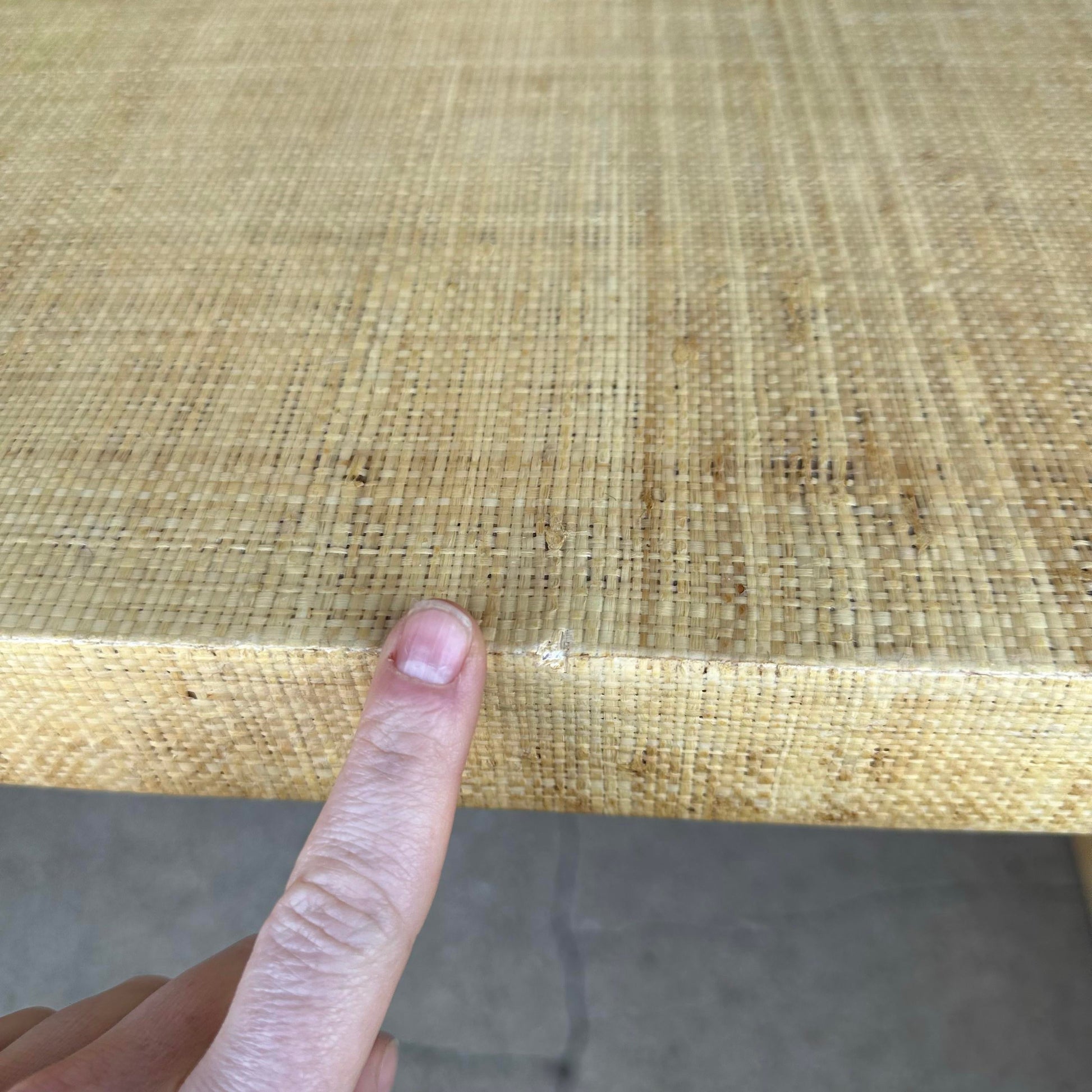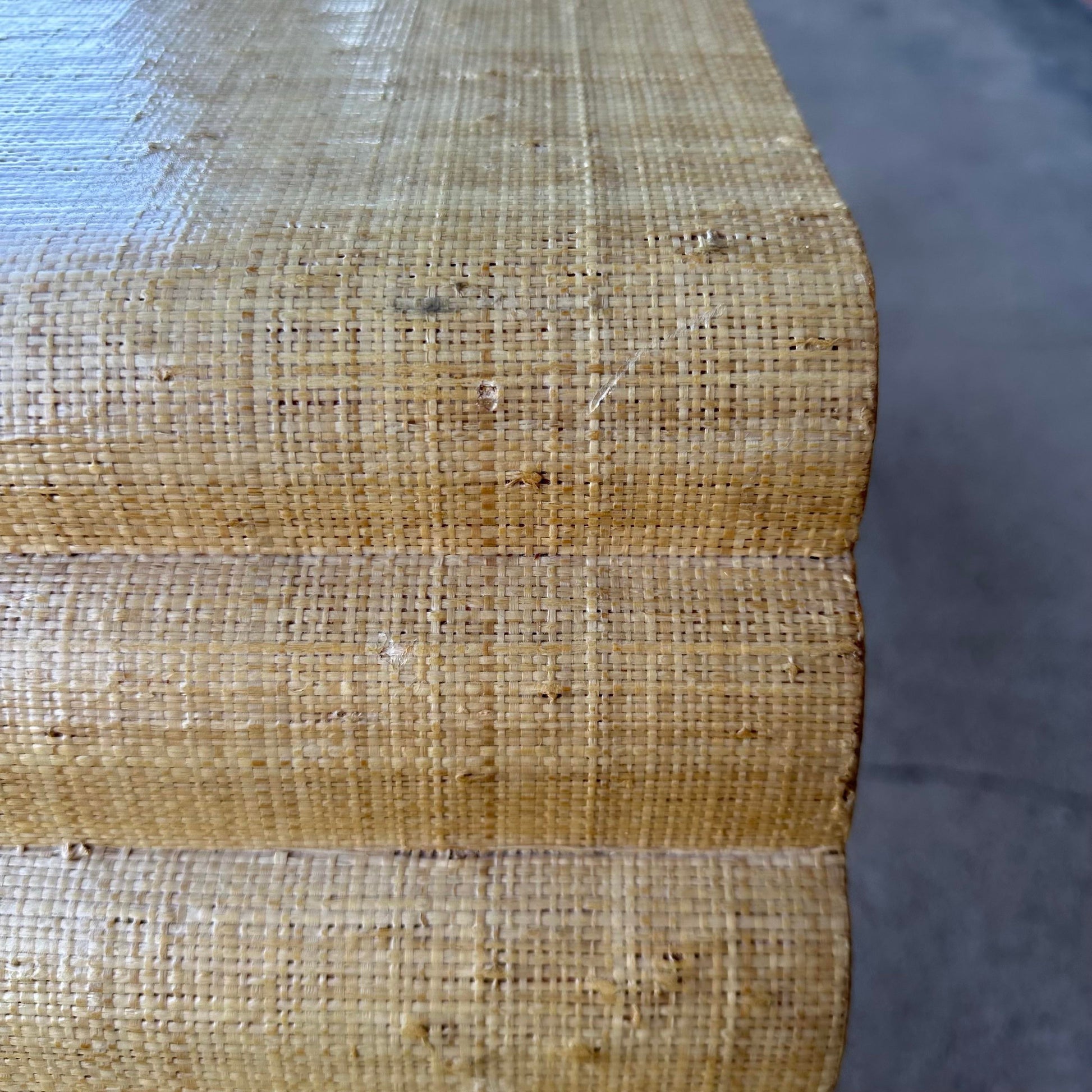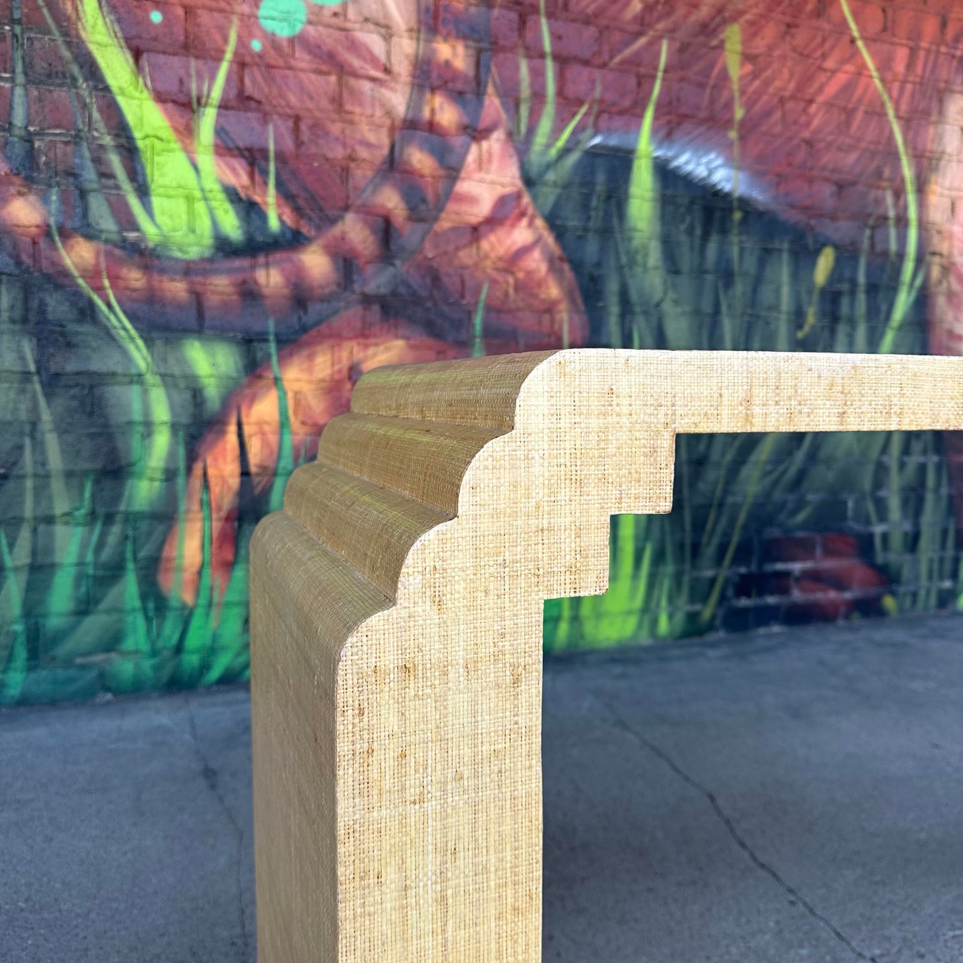 Post Modern Grass Cloth Sofa Console Table. This 80s console table has scalloped edges and is covered in a light wheat colored grass cloth. There is some markings on the bottom of the piece but there appears to be no makers mark.