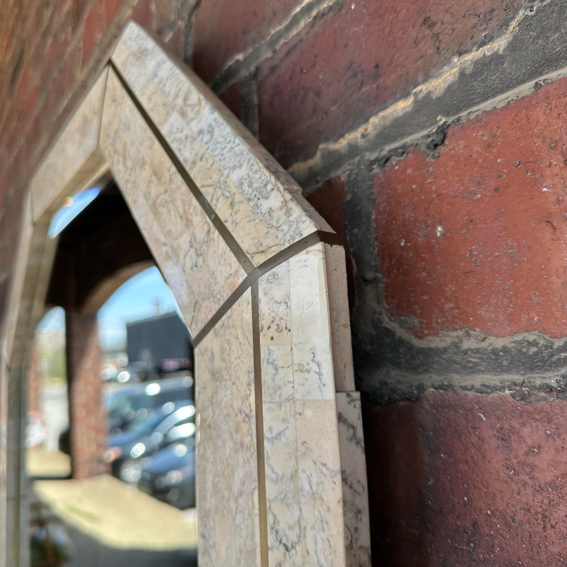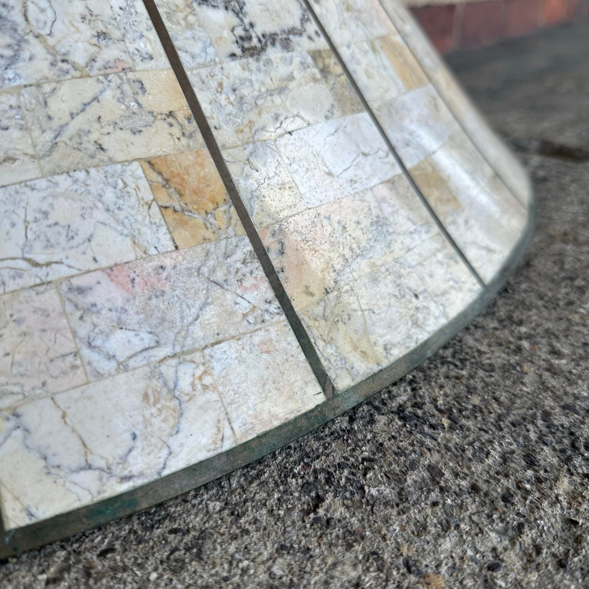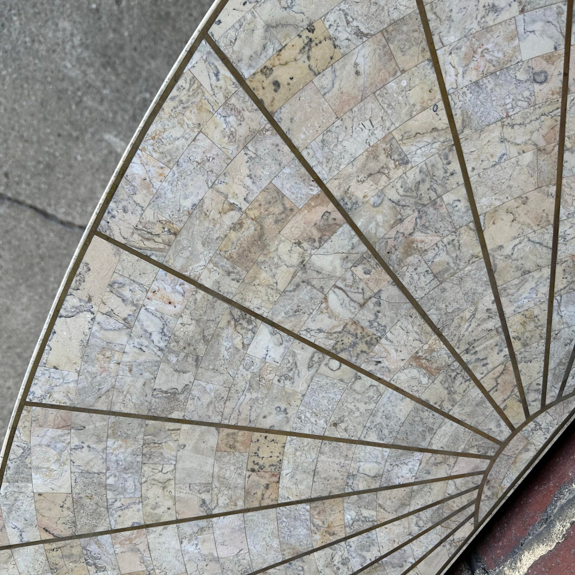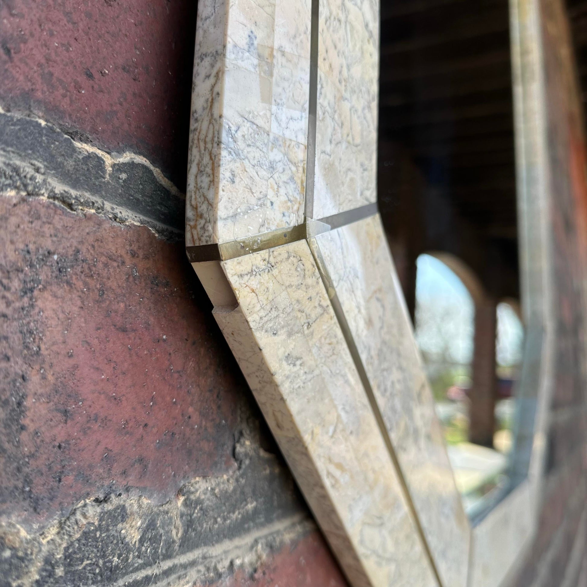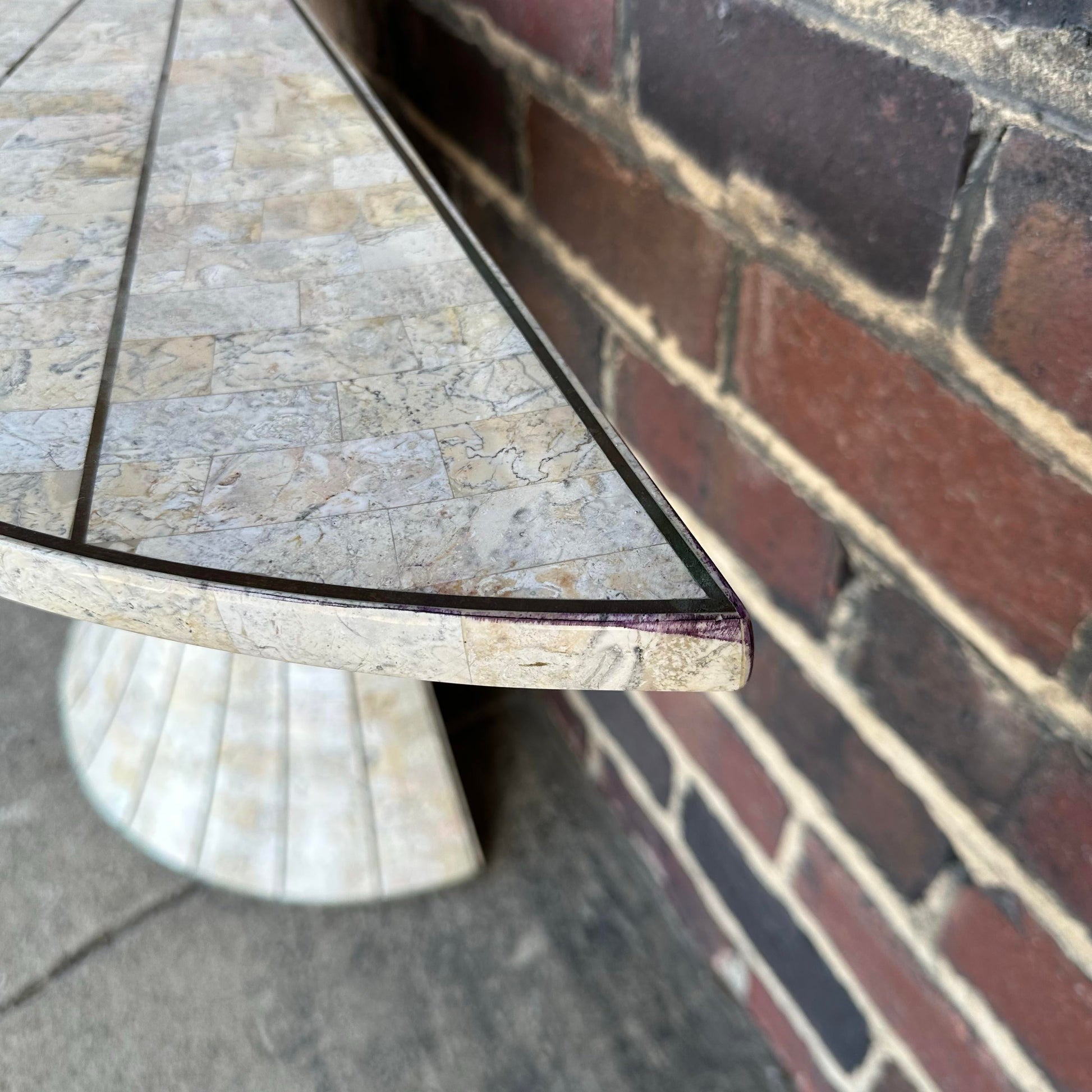 1980's Travertine vanity/ console table with brass inlay and matching Mirror. Sunburst tessellated marble design on top with a fluted base, tapering in at the middle. Made from travertine marble layed over wood. There is a makers mark on the back of the mirror.