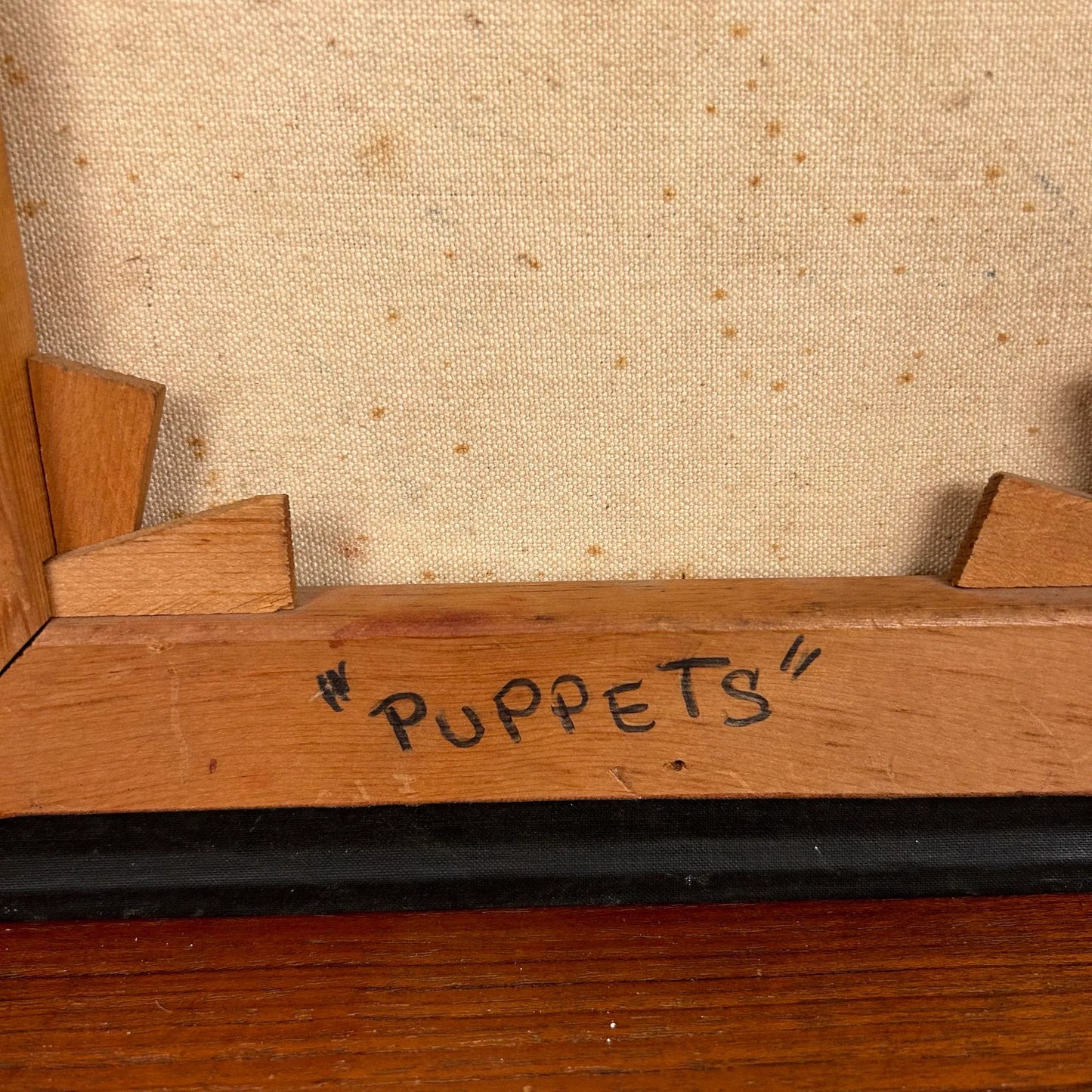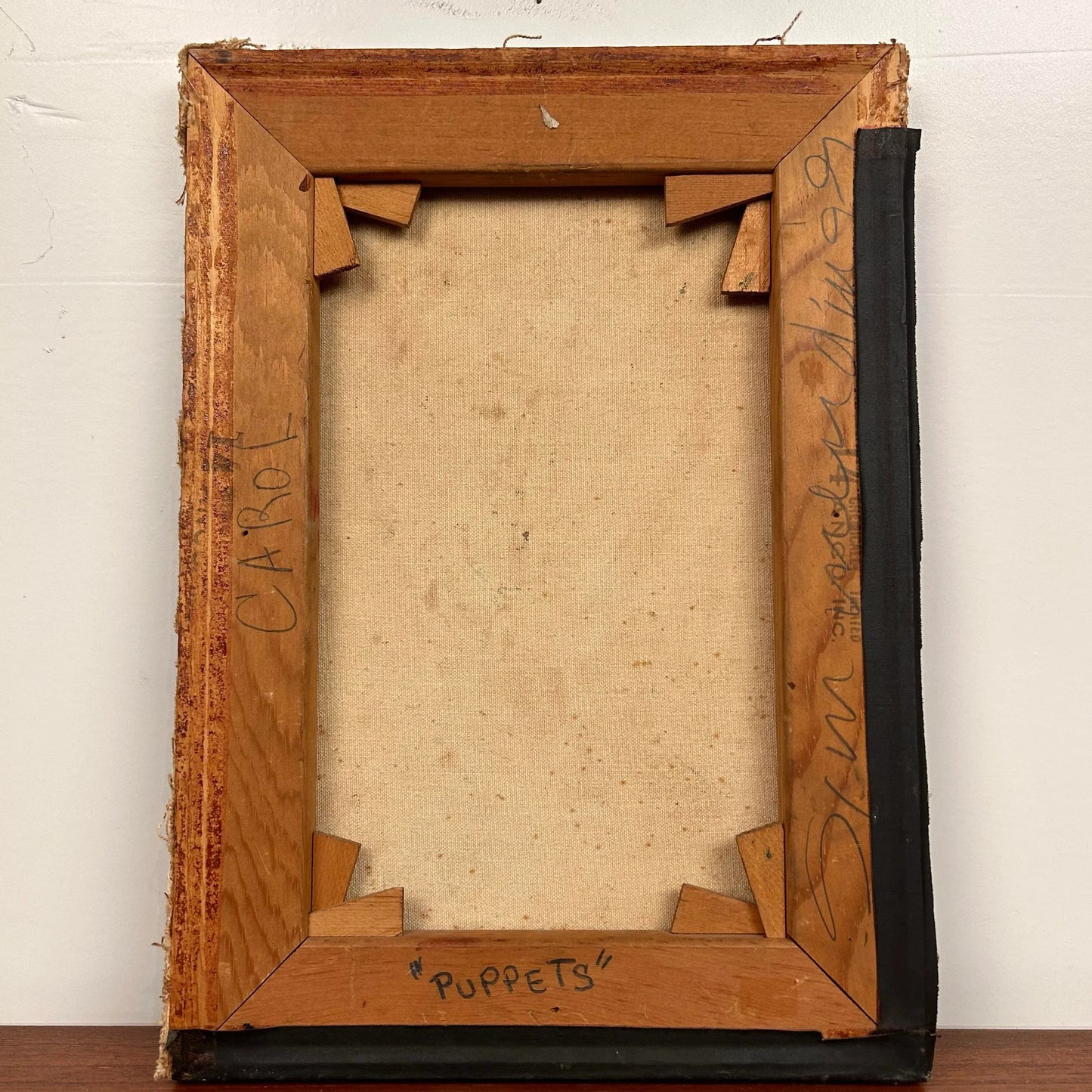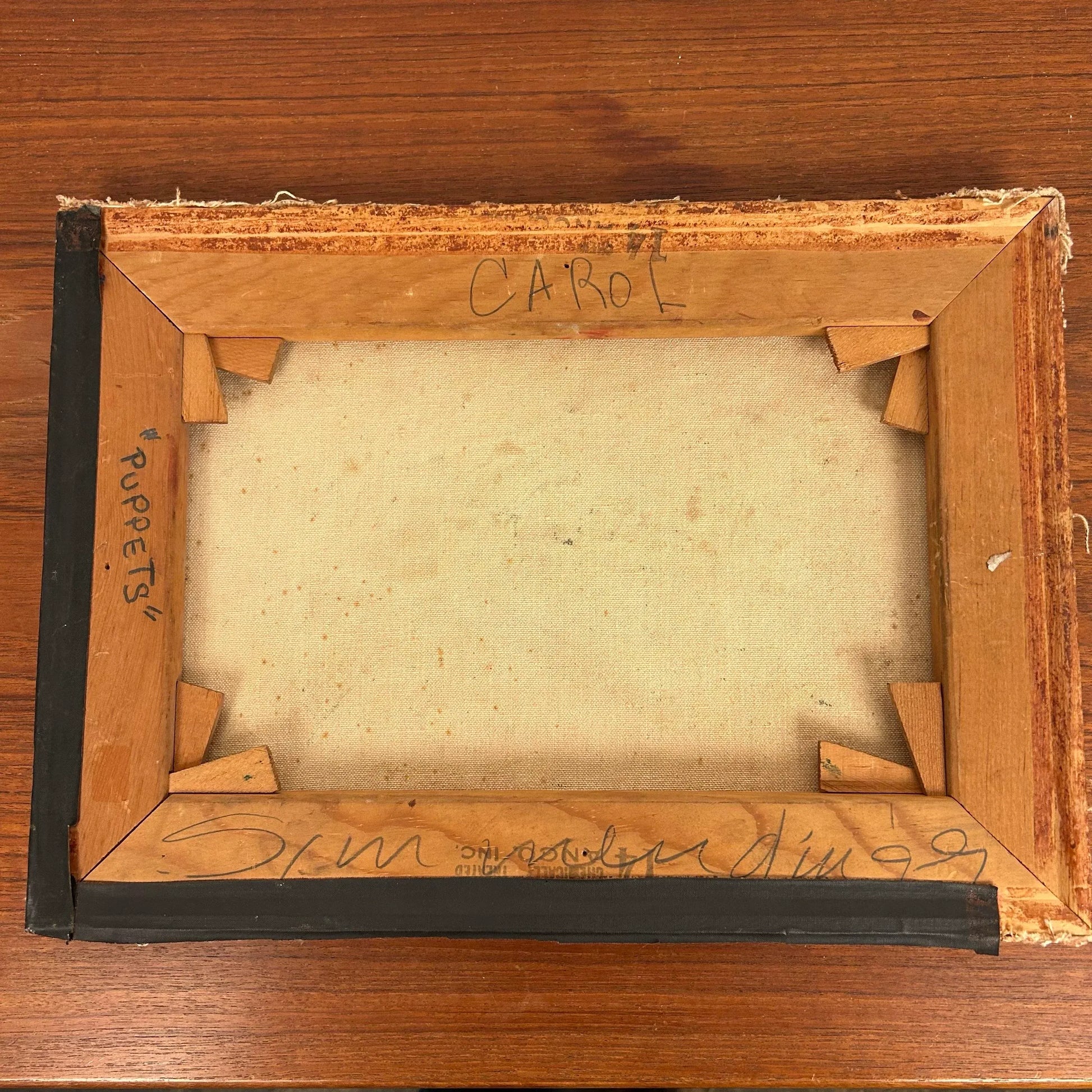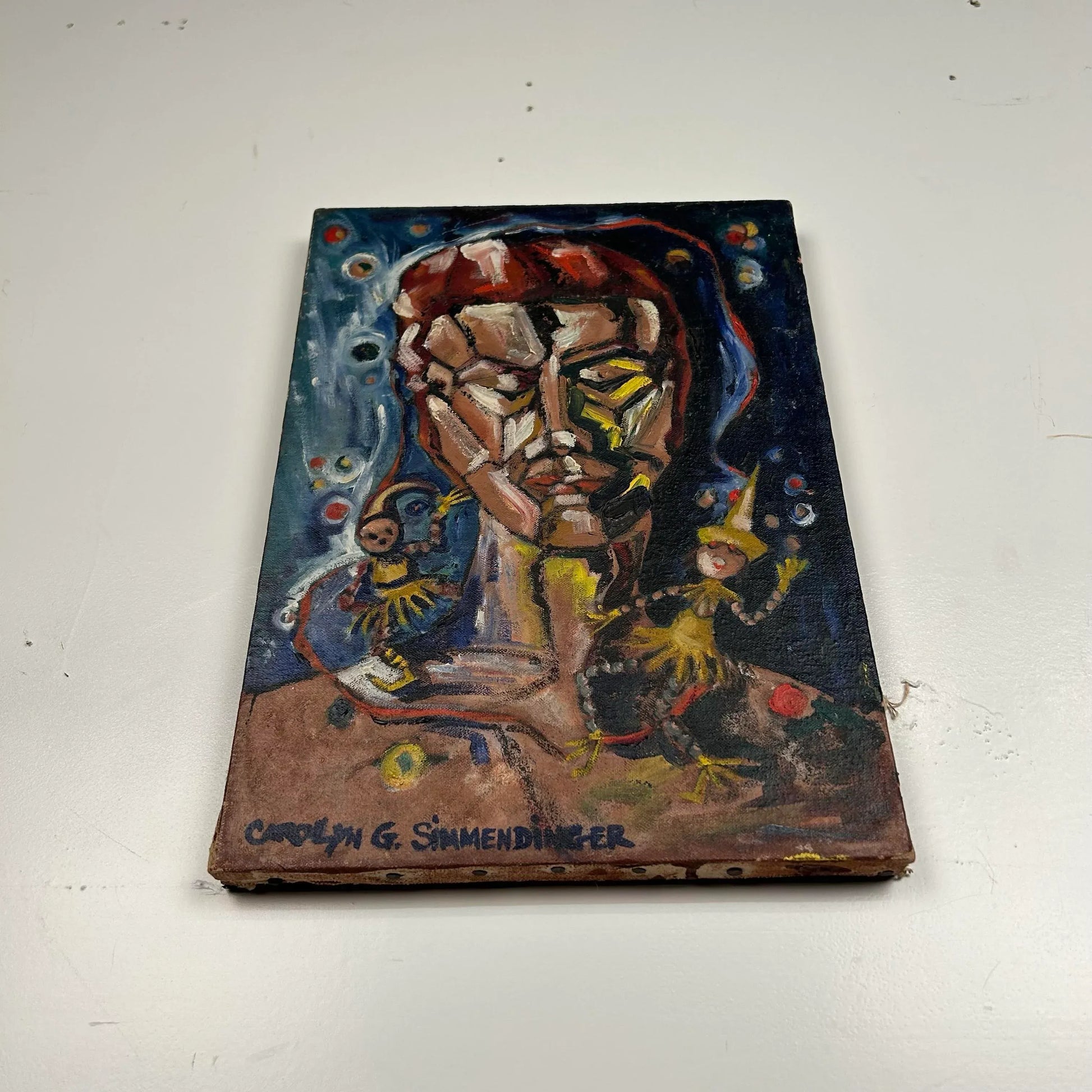 Painting by Carolyn G. Simmendinger depicting a figure with two clowns or puppets on either shoulder.
