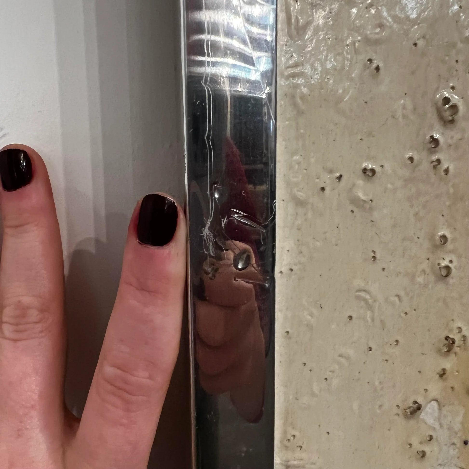 Abstract painting with hues of green and purple on a white background. Painting is framed and has a signature on back.