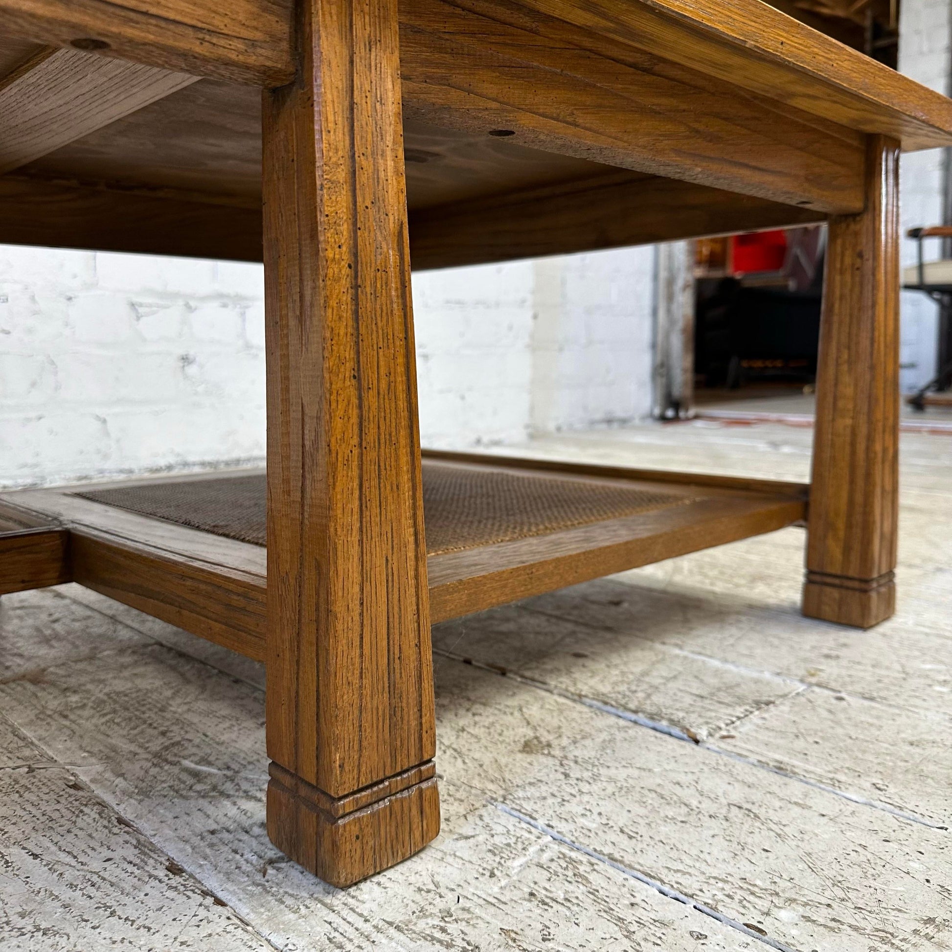 Ranch oak coffee table with teal tile top inlay and caned shelf.
