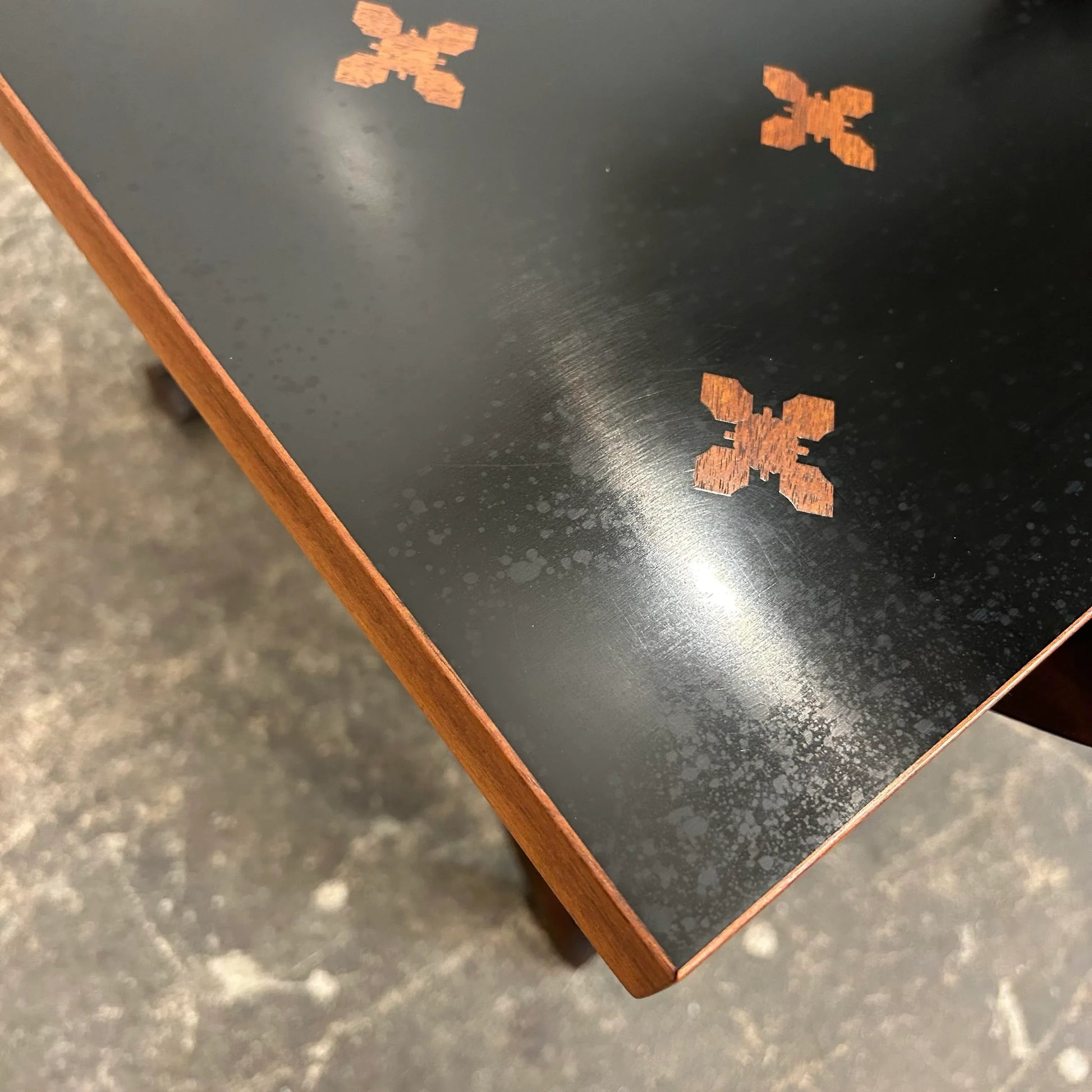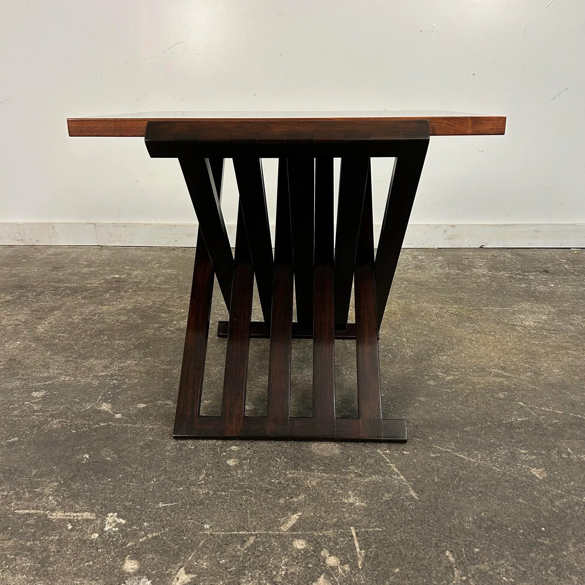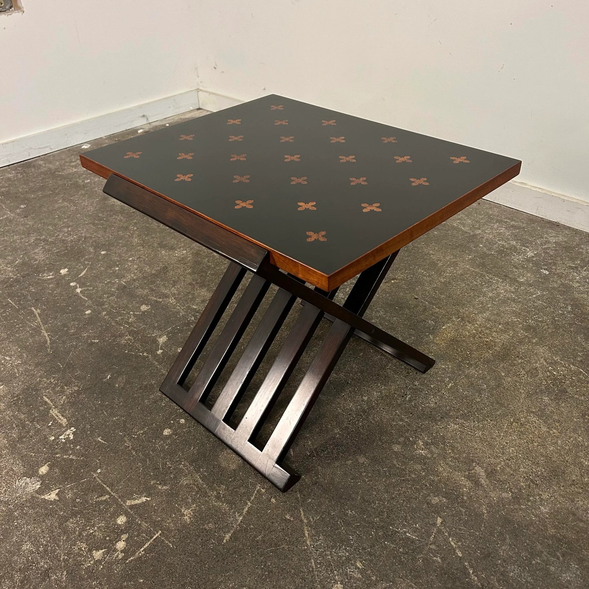 Designed by Edward Wormley for Dunbar “Model 5425”. This piece is absolutely incredible—constructed of rosewood and ebonized walnut featuring inlaid parquetry rosewood stars. This occasaional table features a dynamic design with a folding base and brass colored “stretcher” chains.