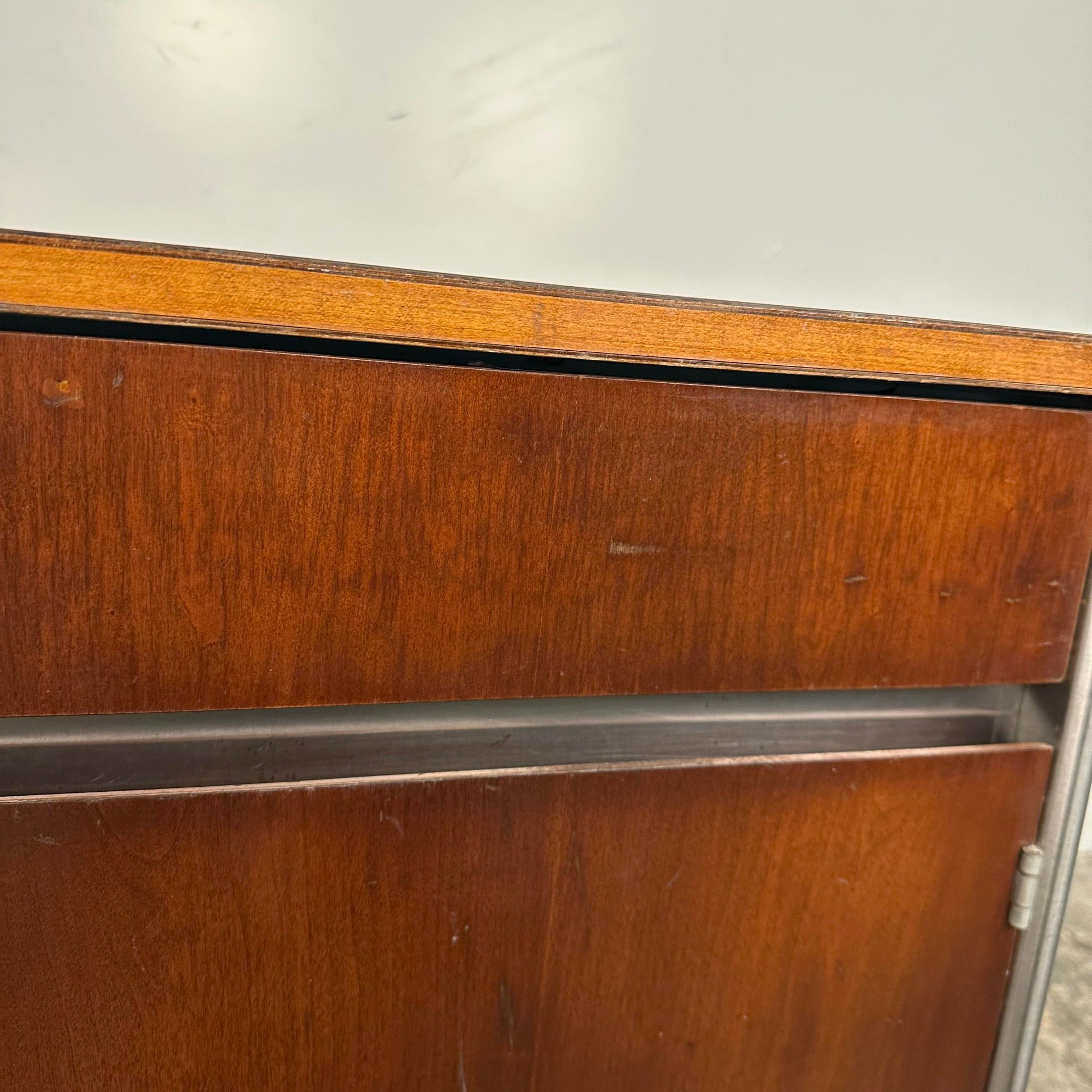 This metal medical cabinet was designed by Raymond Loewy for Hill Rom. It features aluminum detailing, wooden sides, laminate top, and opens to one drawer and two shelves with removable aluminum trays for medical supplies. There is a Hill Rom tag on the inside of the drawer.