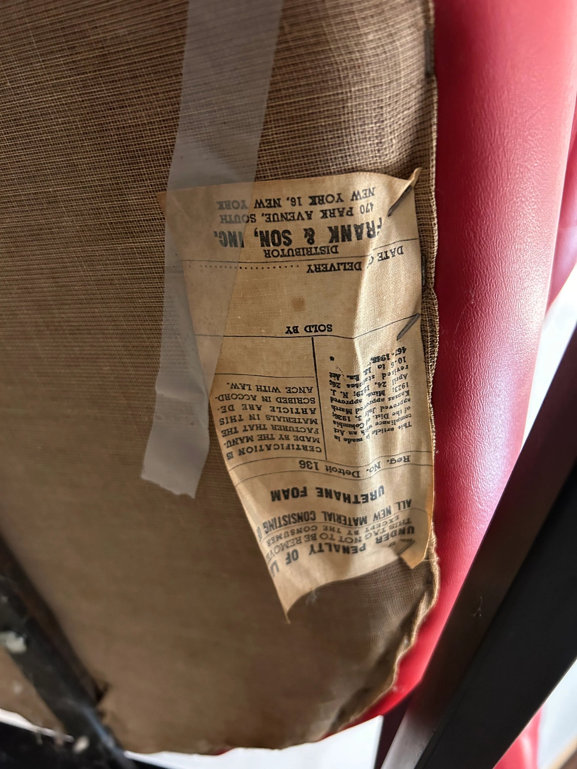 Pair of mid century modern red vinyl tufted chairs with black metal bases styled after Milo Baughman and made by Frank and Son in New York, New York. Some
