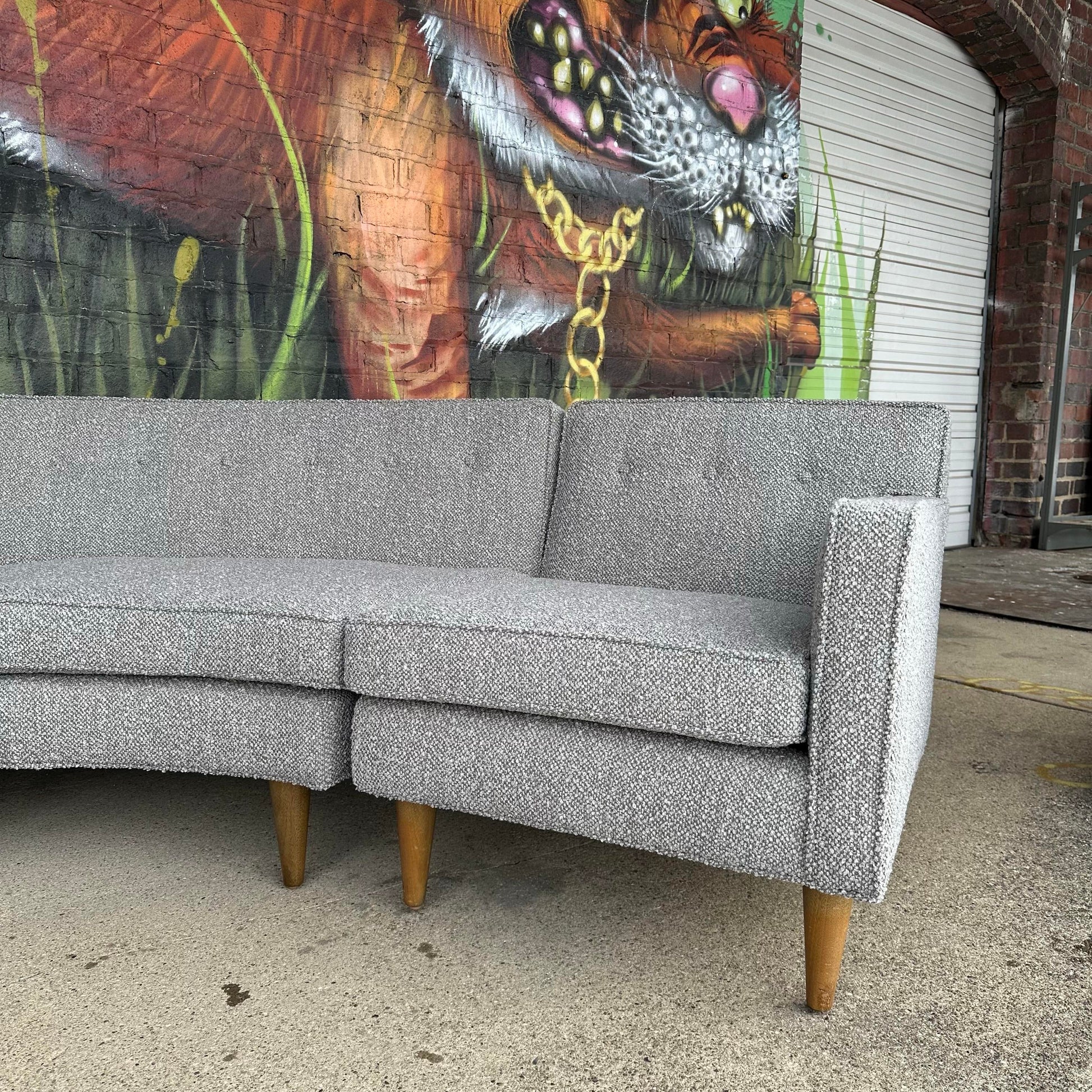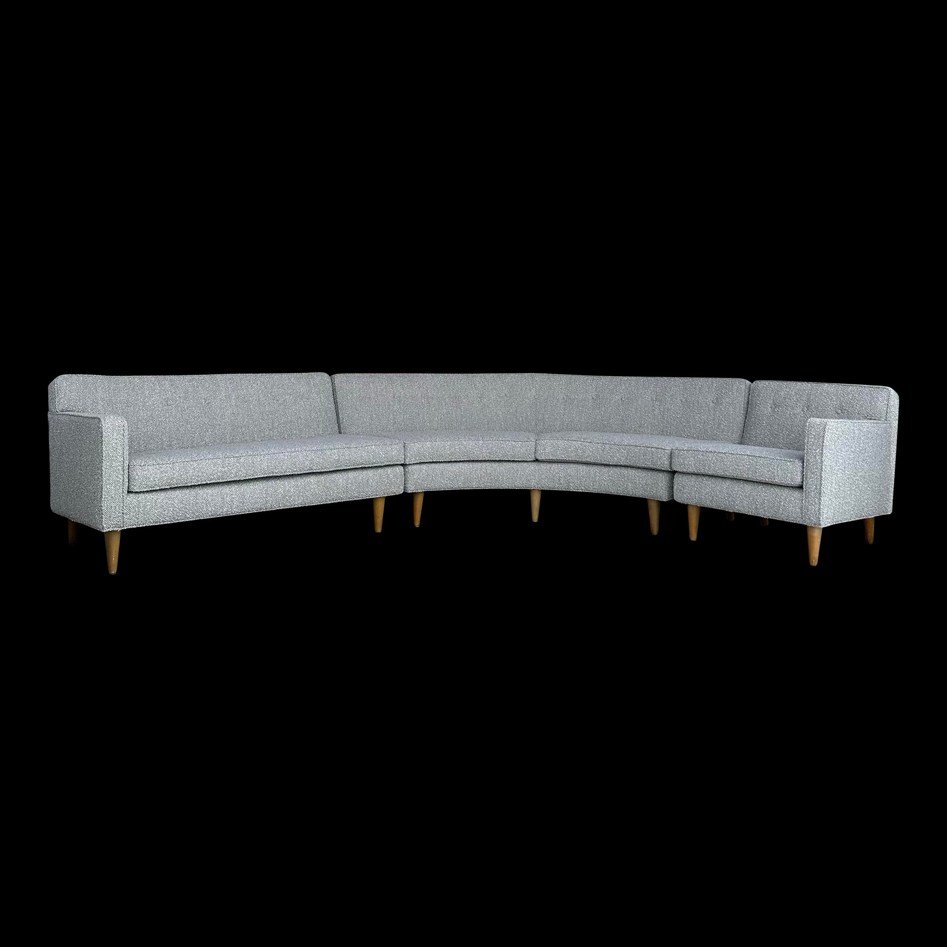 Mid-century modern 6-seat Dunbar sectional reupholstered in a gray textured fabric.