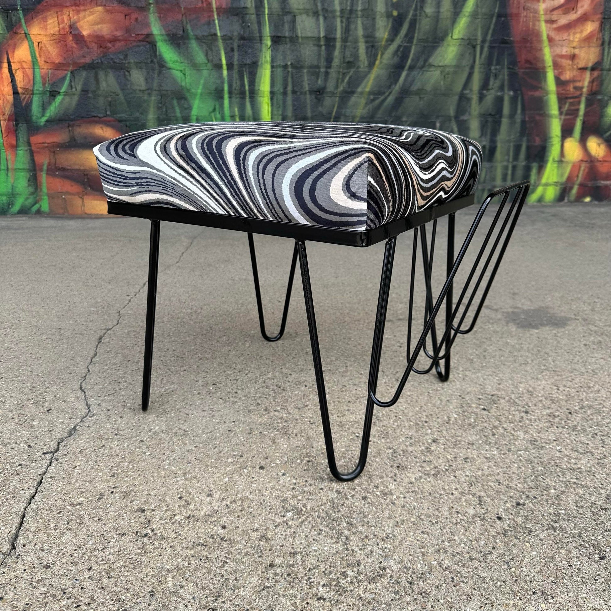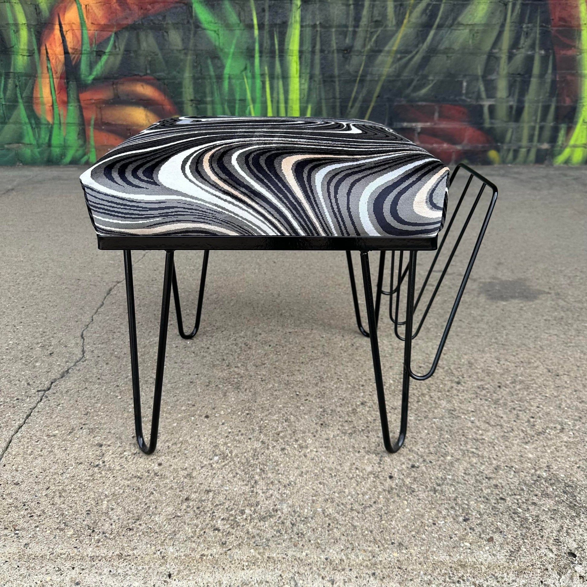 Reupholstered Hairpin Leg Magazine Rack and ottoman. This versatile piece of furniture has been reupholstered and powder coated. The seat cushion is done in a pindler psychedelic wavy, black white and gray fabric in 100% polyester. The upholstered seat is removable and is not attached but fits securely into the top of the rack. The base has been powder coated a glossy black. There is no makers mark on the magazine rack, but it fits in well with the early 1950s mid century modern style.