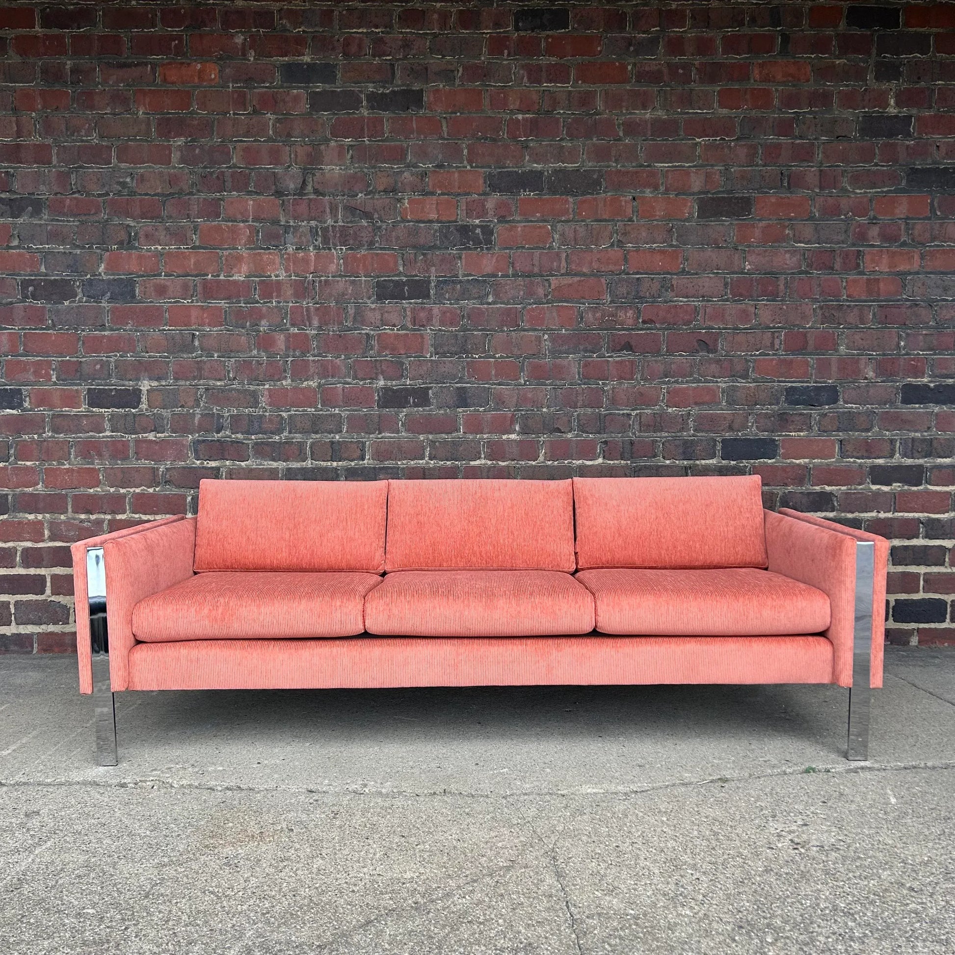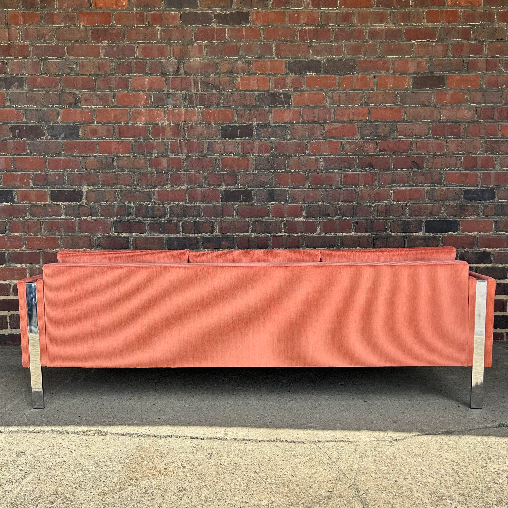 Reupholstered Milo Baughman Style Chrome Sofa in Crypton Salmon Corduroy